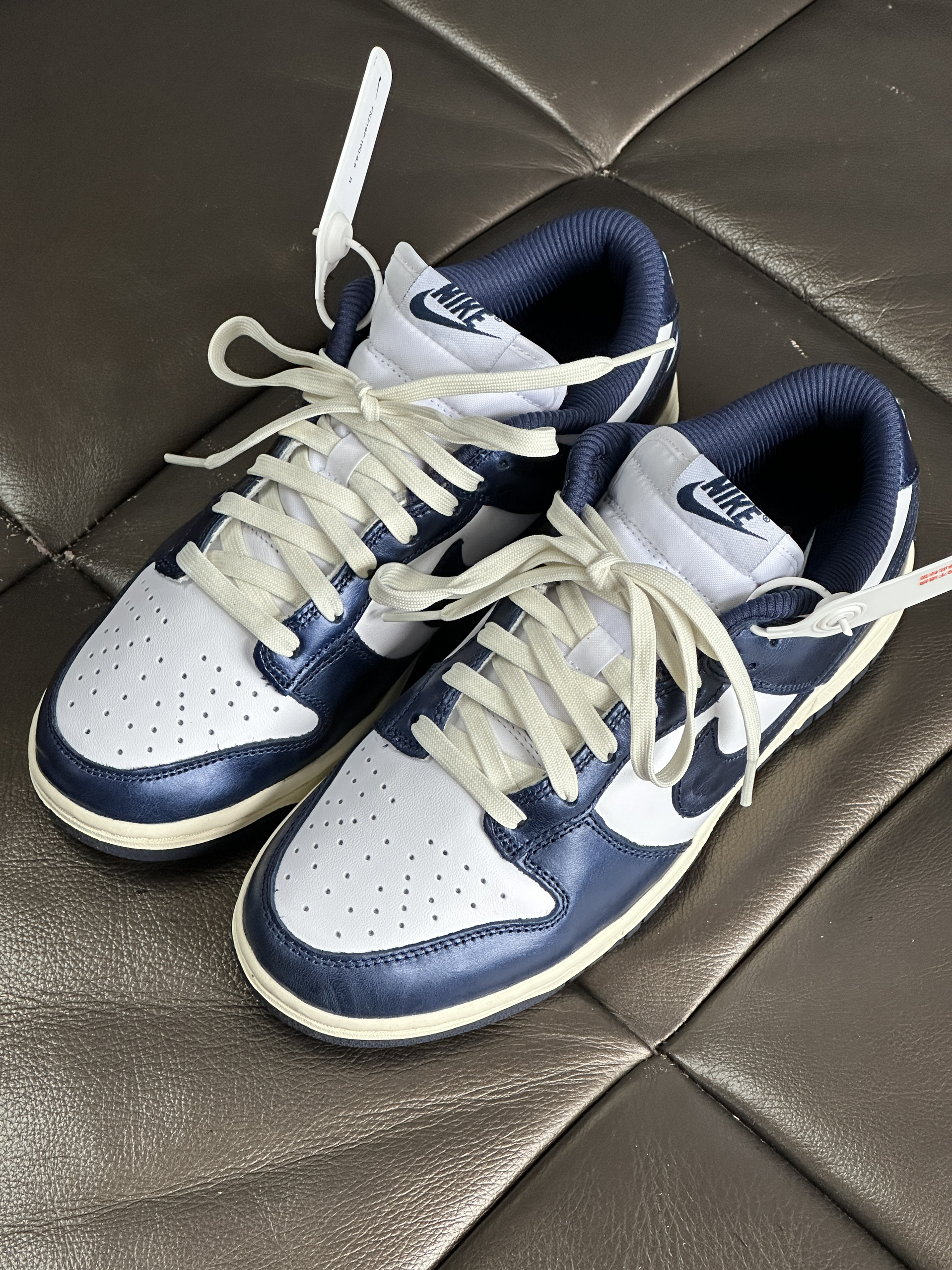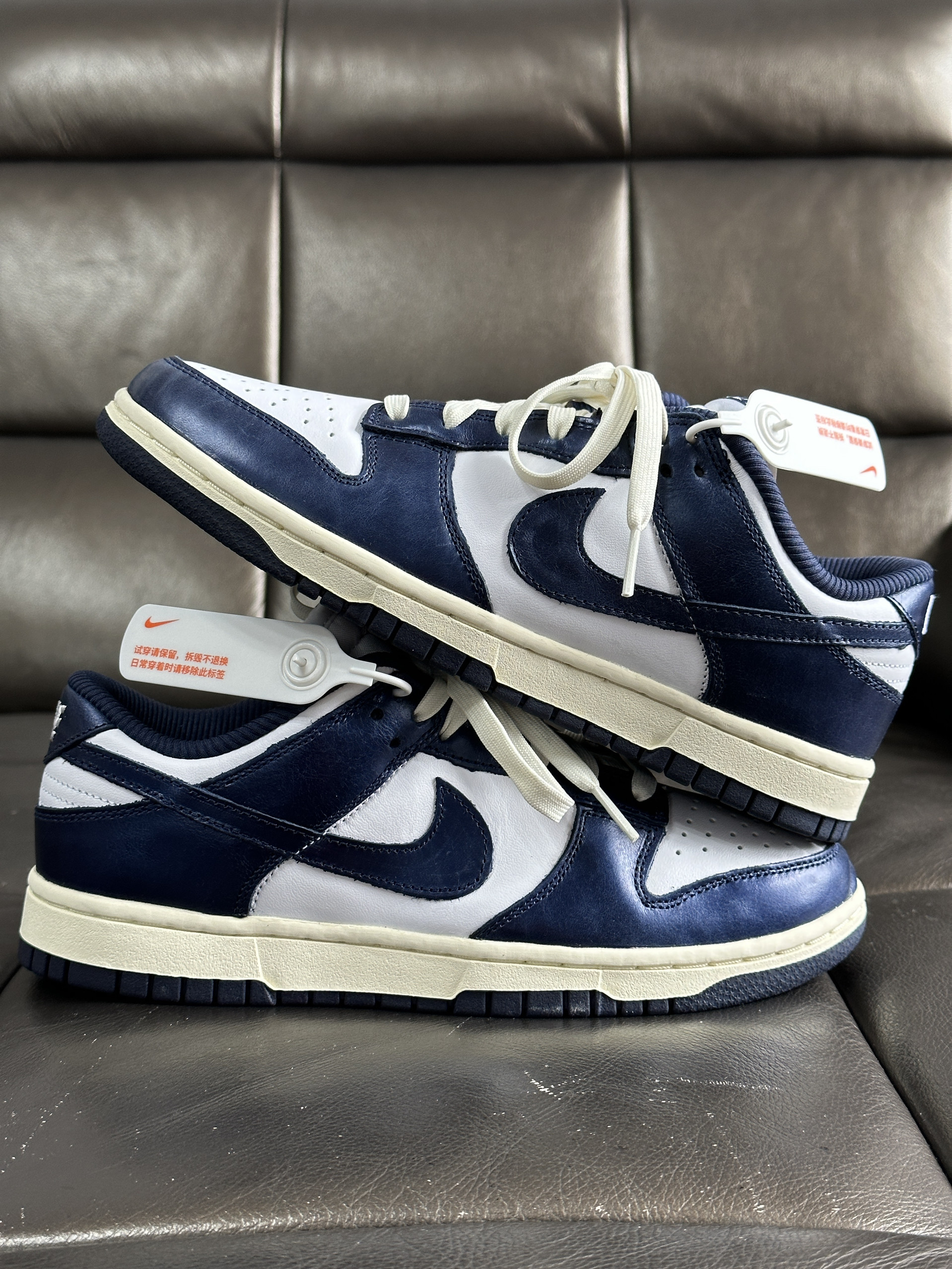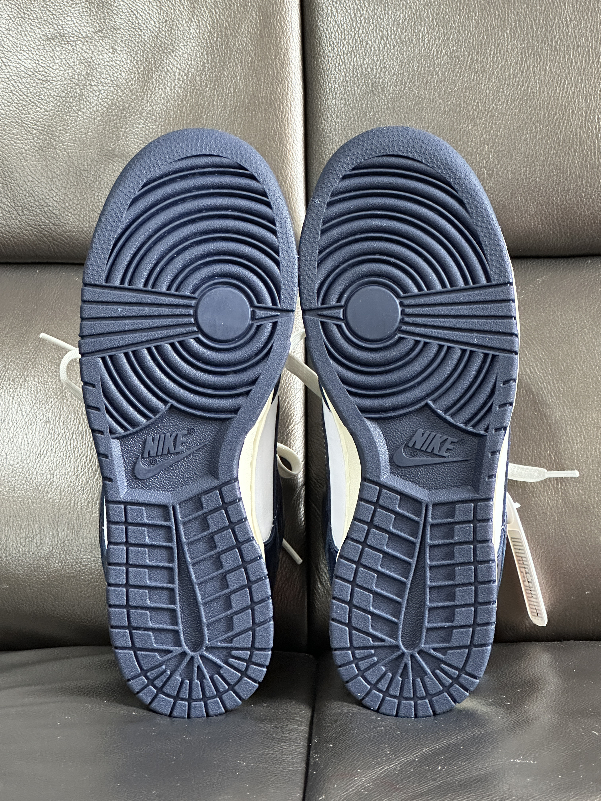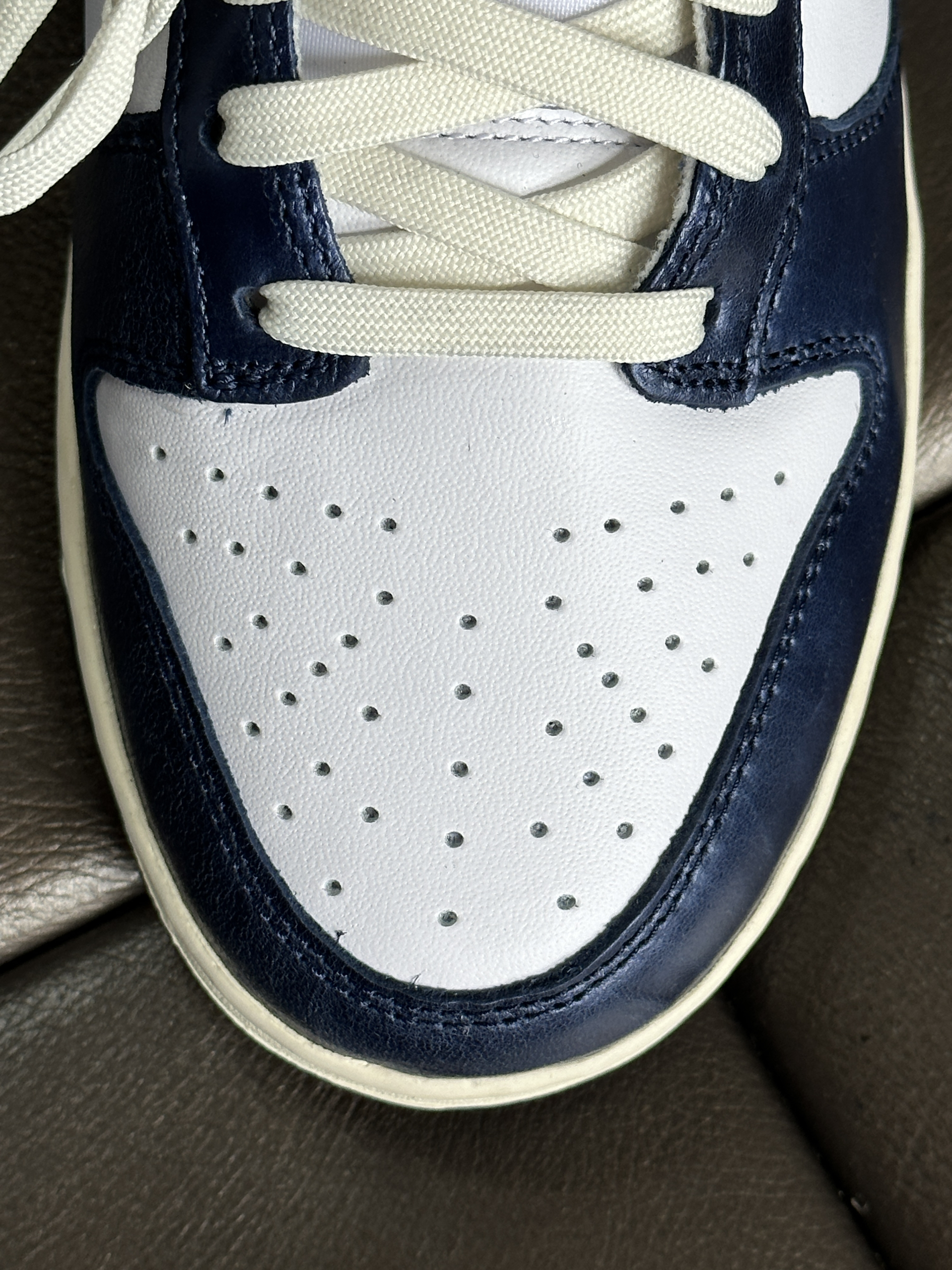 ▶现在的Dunk Low配色很多,有点眼花缭乱的感觉!但选择经典配色是不会错的! ▶白蓝配色+氧化做旧的中底,带着浓浓的复古风! 鞋身使用了牛皮革材质打造,用料值得肯定!蓝色皮革还有点珠光的效果,很奈斯!光面皮革很好打理,深蓝的内衬也足够耐脏! 使用的新设计内衬不管是颜值还是实用性都很不错哟! ▶这双鞋尺码标准;