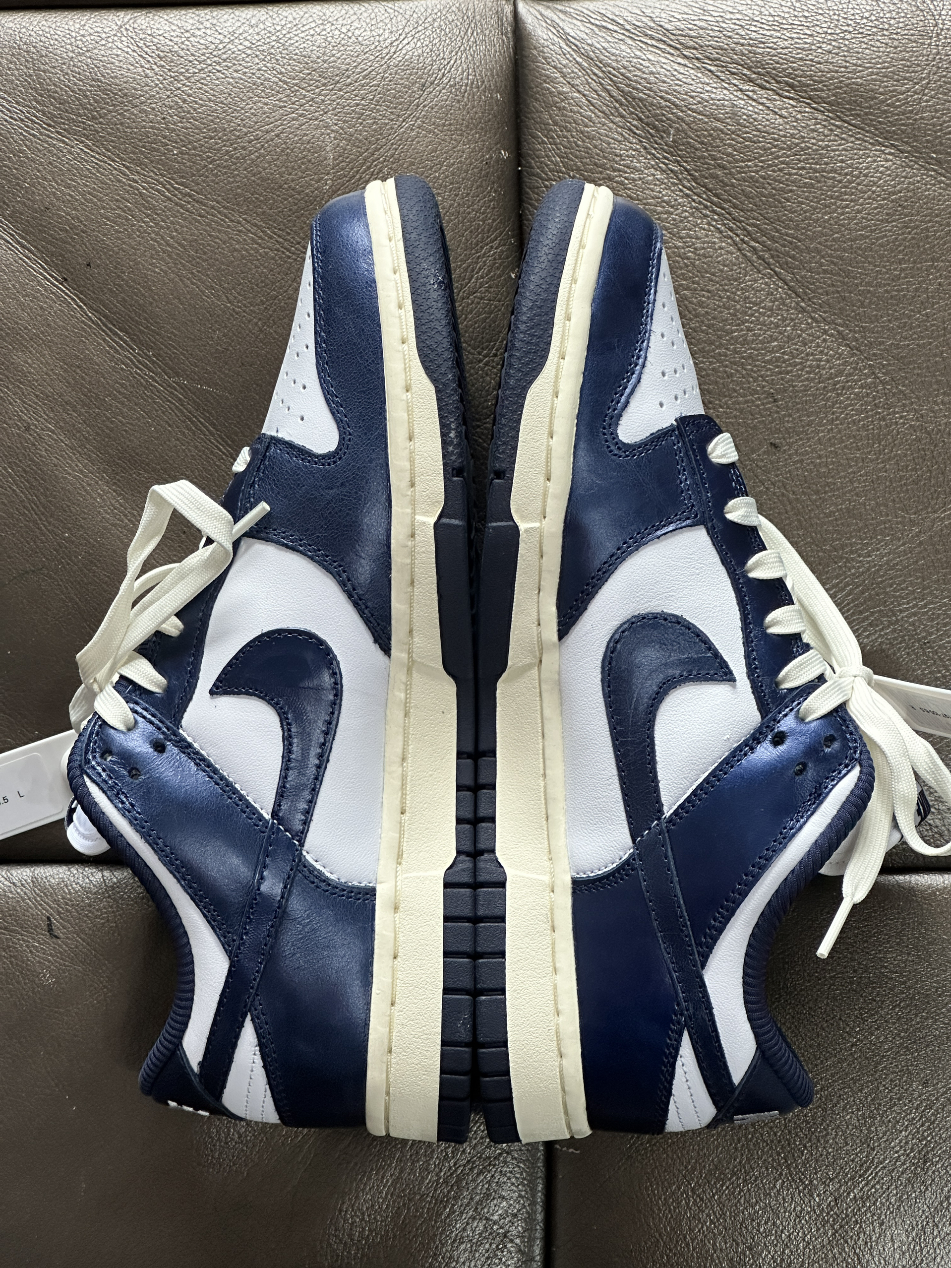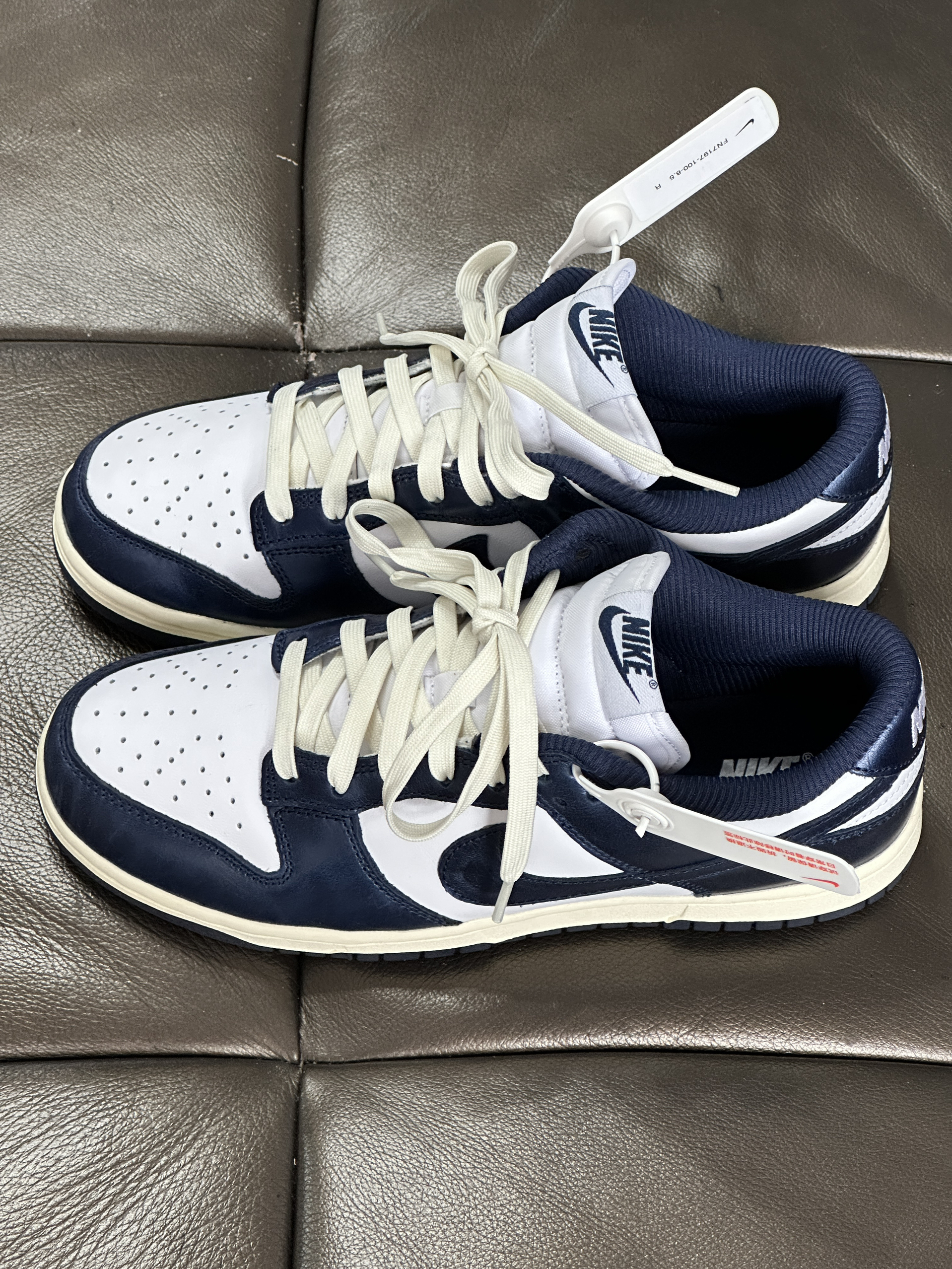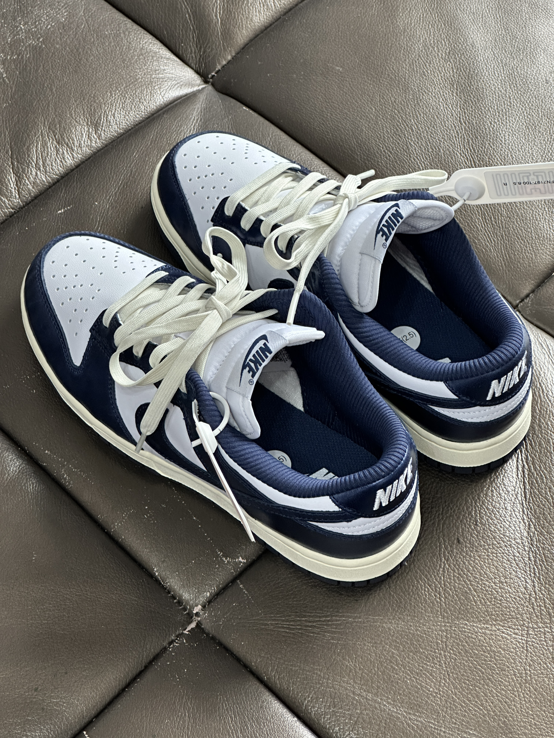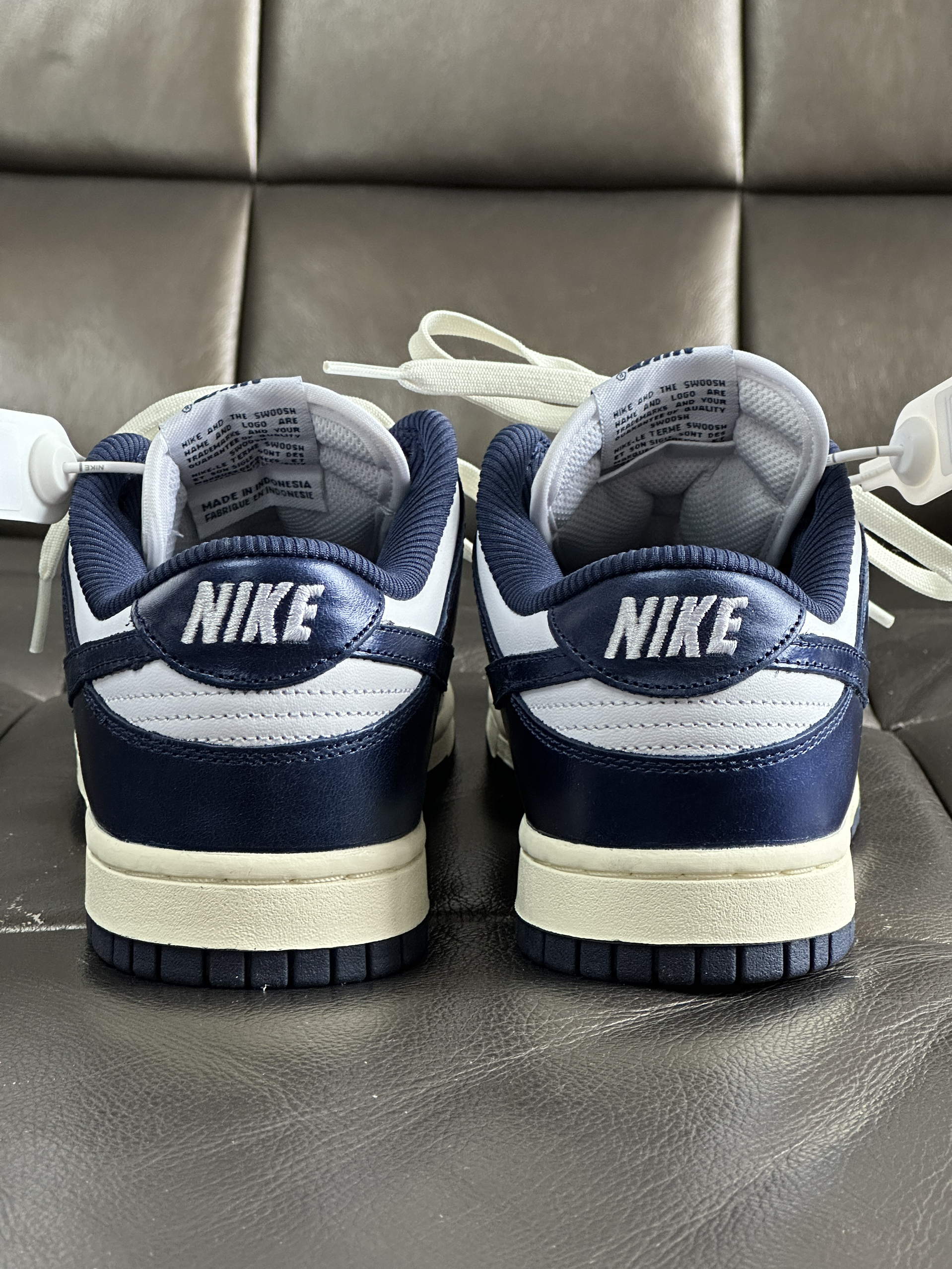 ▶现在的Dunk Low配色很多,有点眼花缭乱的感觉!但选择经典配色是不会错的! ▶白蓝配色+氧化做旧的中底,带着浓浓的复古风! 鞋身使用了牛皮革材质打造,用料值得肯定!蓝色皮革还有点珠光的效果,很奈斯!光面皮革很好打理,深蓝的内衬也足够耐脏! 使用的新设计内衬不管是颜值还是实用性都很不错哟! ▶这双鞋尺码标准;