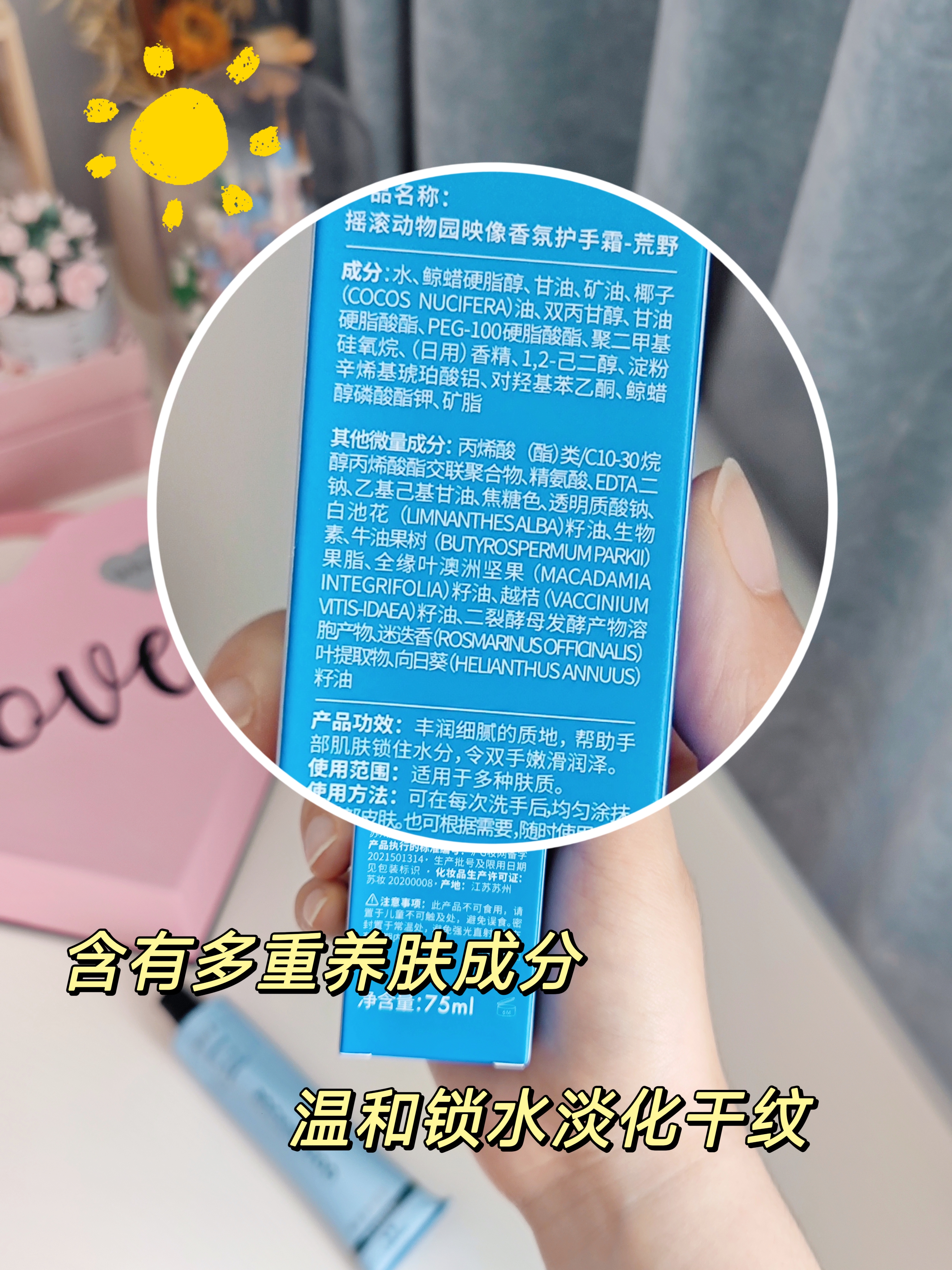 🌸姐妹们,我可太喜欢摇滚动物园啦~之前用它家的身体乳就好爱,这几天入手了这个映像香氛护手霜,现在已经是每天必涂的咯,真的很喜欢这个味道,保湿也很好~ ✅外观质地 我手头的这款护手霜是荒野75ml,蓝色系包装看起来就很清新呢,铝管外观比较便于保存,维护成分活性有效,挤出来是轻薄水润白色乳液质地,肤感丝滑不油腻,可以一抹化开~ ✅成分分析 它里面含有二裂酵母、鲸蜡醇磷酸酯钾、北极越桔籽油、白池花籽...
