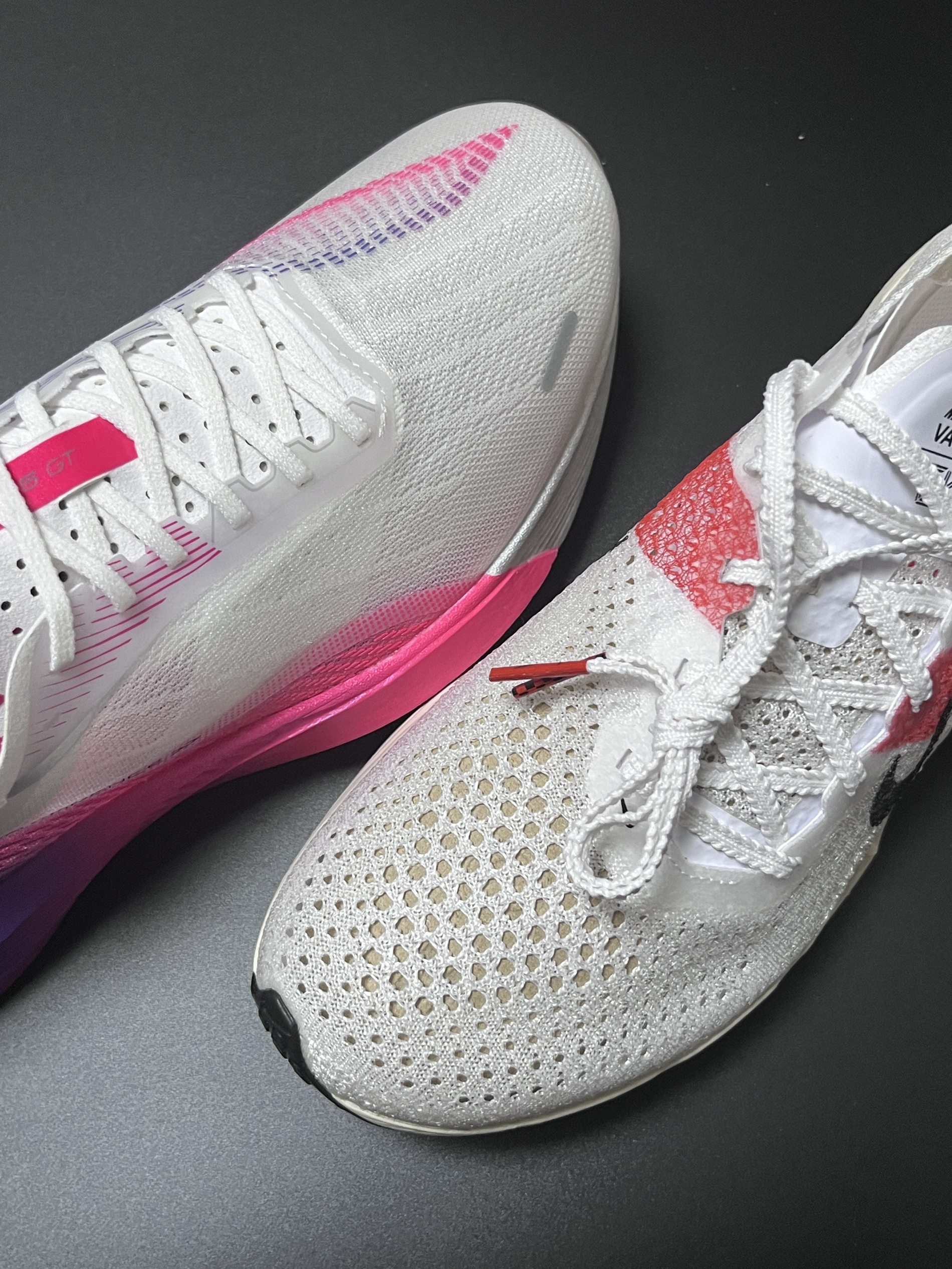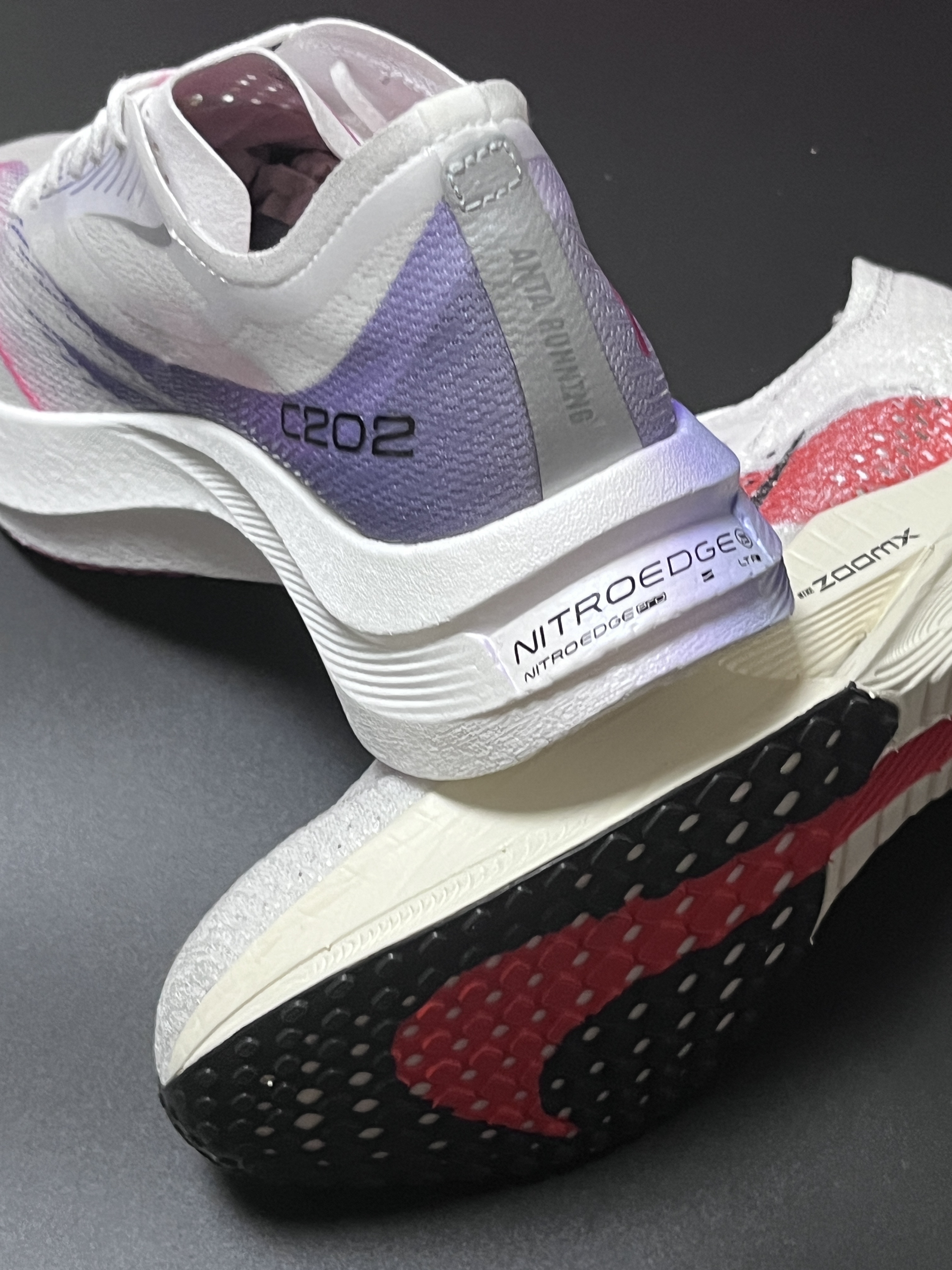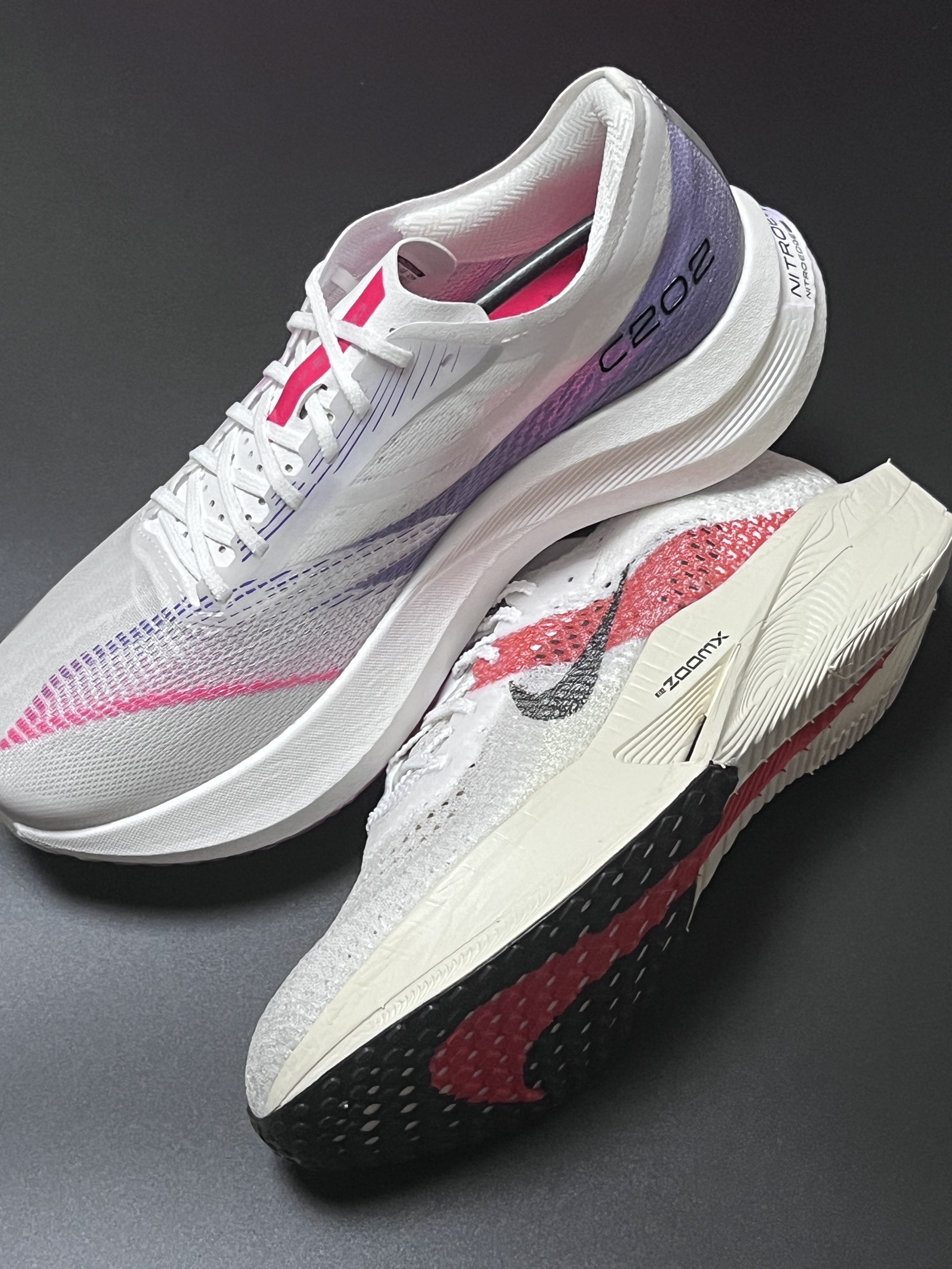 halo 阿迪来了,本期带来两双两双实战跑鞋!没错就是这双来自安踏的C202 5GT 和这双Zoomx Vaporfly Next%3! 话不多说,我们就来分别看看吧! 首先,我们先来说说这双安踏的C202 5gt,整双鞋以白色为主色调,搭配玫红、紫色渐变真的非常好看! 鞋子采用半透明镂空的MONO纱,集透气、强韧于一身! 另外鞋子中底采用的是上下双密度中底材料,内嵌一块全掌碳板,这样的设计也是...