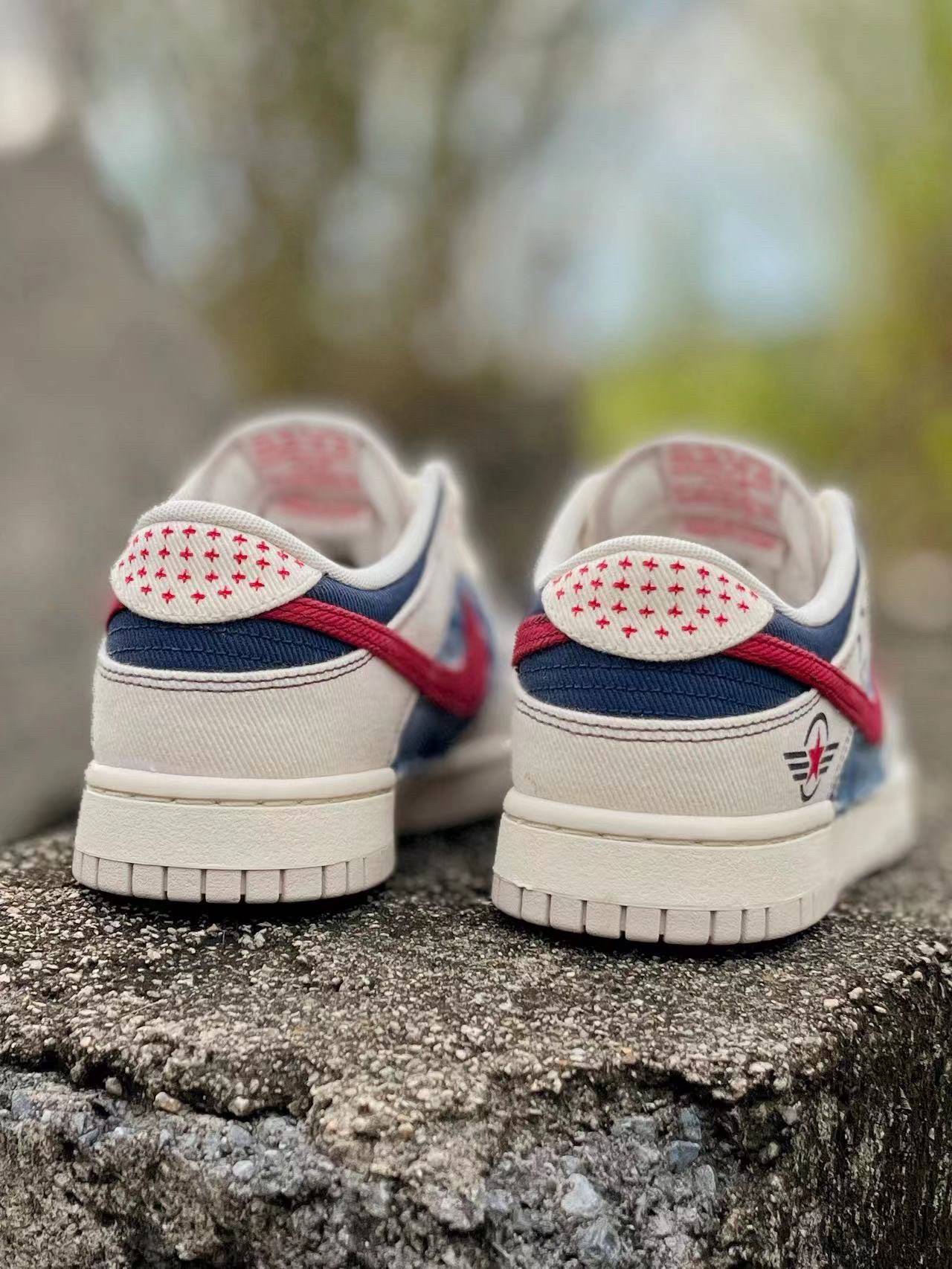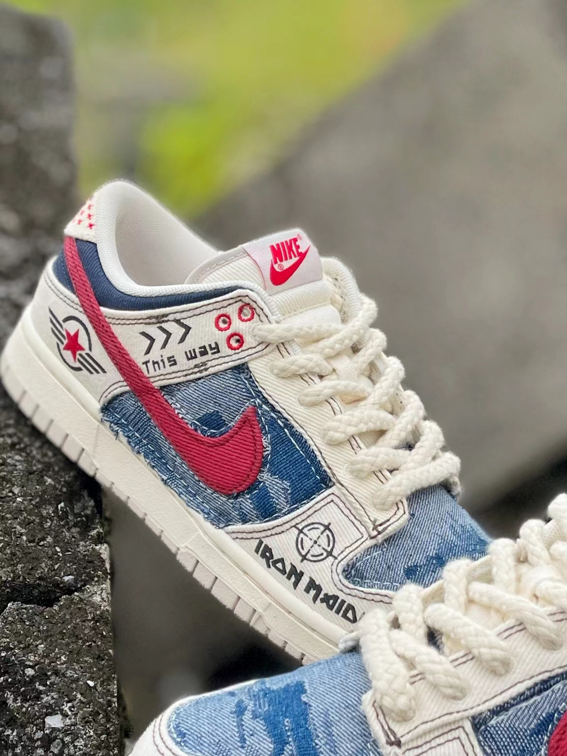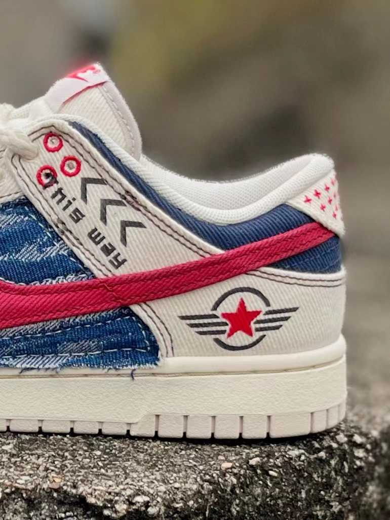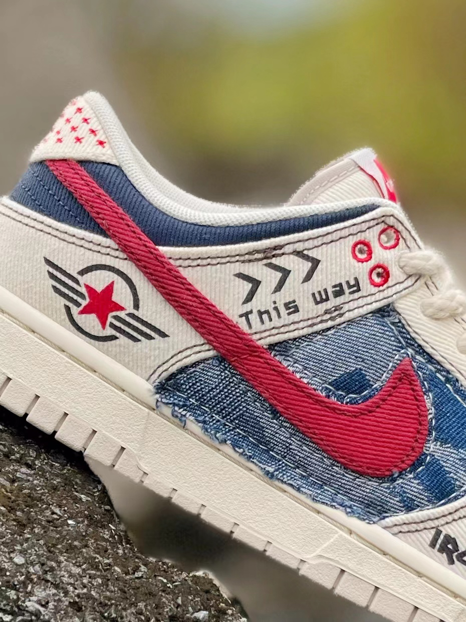 今天给大家分享一双军事风格的定义板鞋👟 Nike Dunk Low街头『白蓝红』配色 鞋款以Dunk Low『米色』为模版 采用了『军事图标』为主题设计元素 鞋头和鞋身中部改为了水洗做旧的丹宁牛仔布 鞋身框架则由米色改为了米白色 鞋侧Swoosh运用了红色丰富了整体的层次感 鞋身外侧还设计有多种军事图标 非常酷哦‼️ 整体来说这是一双兼具颜值和设计的定制板鞋👟 配色活力十足 适合日常休闲出街或通勤...