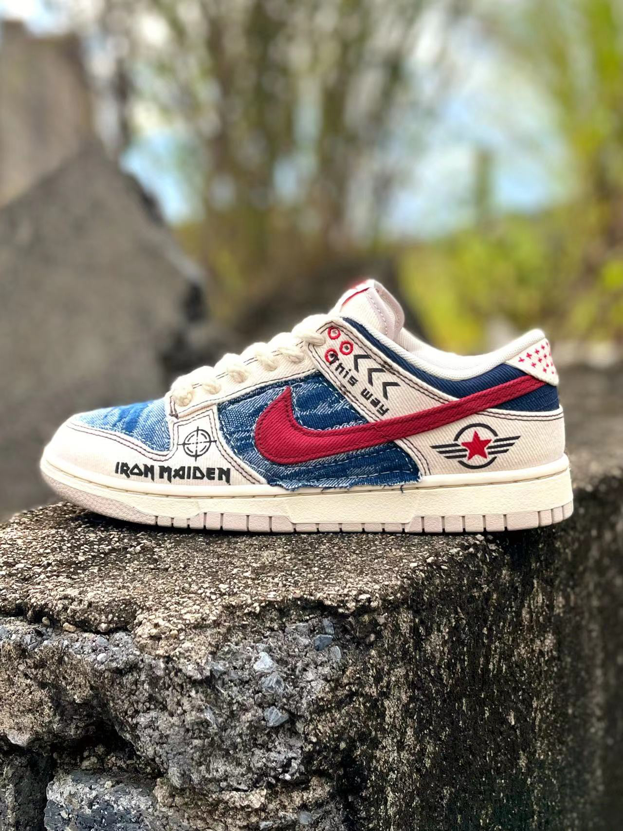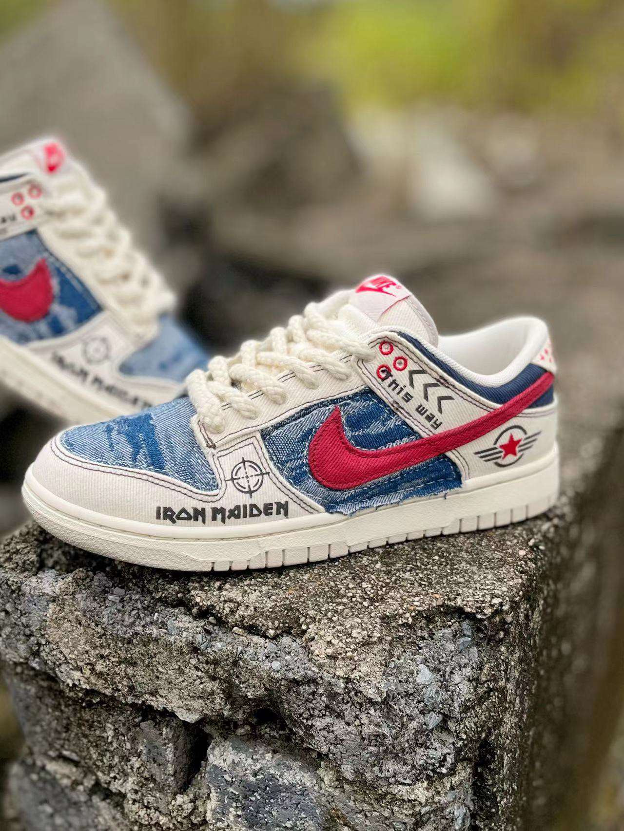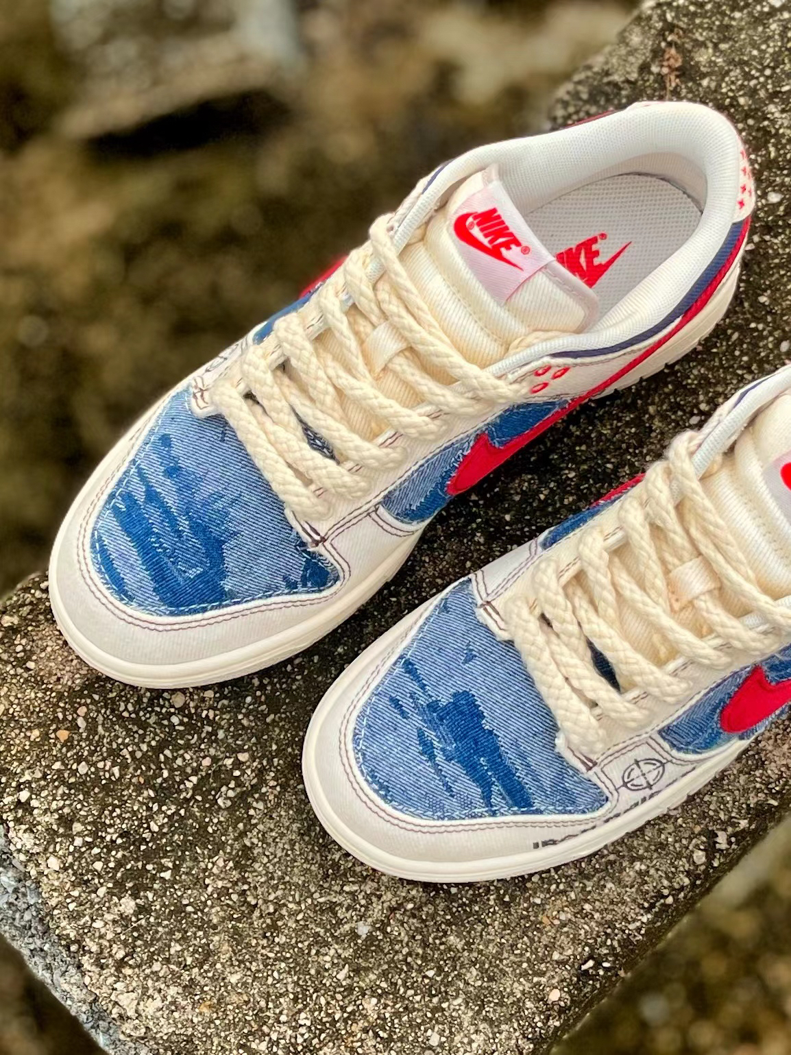 今天给大家分享一双军事风格的定义板鞋👟 Nike Dunk Low街头『白蓝红』配色 鞋款以Dunk Low『米色』为模版 采用了『军事图标』为主题设计元素 鞋头和鞋身中部改为了水洗做旧的丹宁牛仔布 鞋身框架则由米色改为了米白色 鞋侧Swoosh运用了红色丰富了整体的层次感 鞋身外侧还设计有多种军事图标 非常酷哦‼️ 整体来说这是一双兼具颜值和设计的定制板鞋👟 配色活力十足 适合日常休闲出街或通勤...