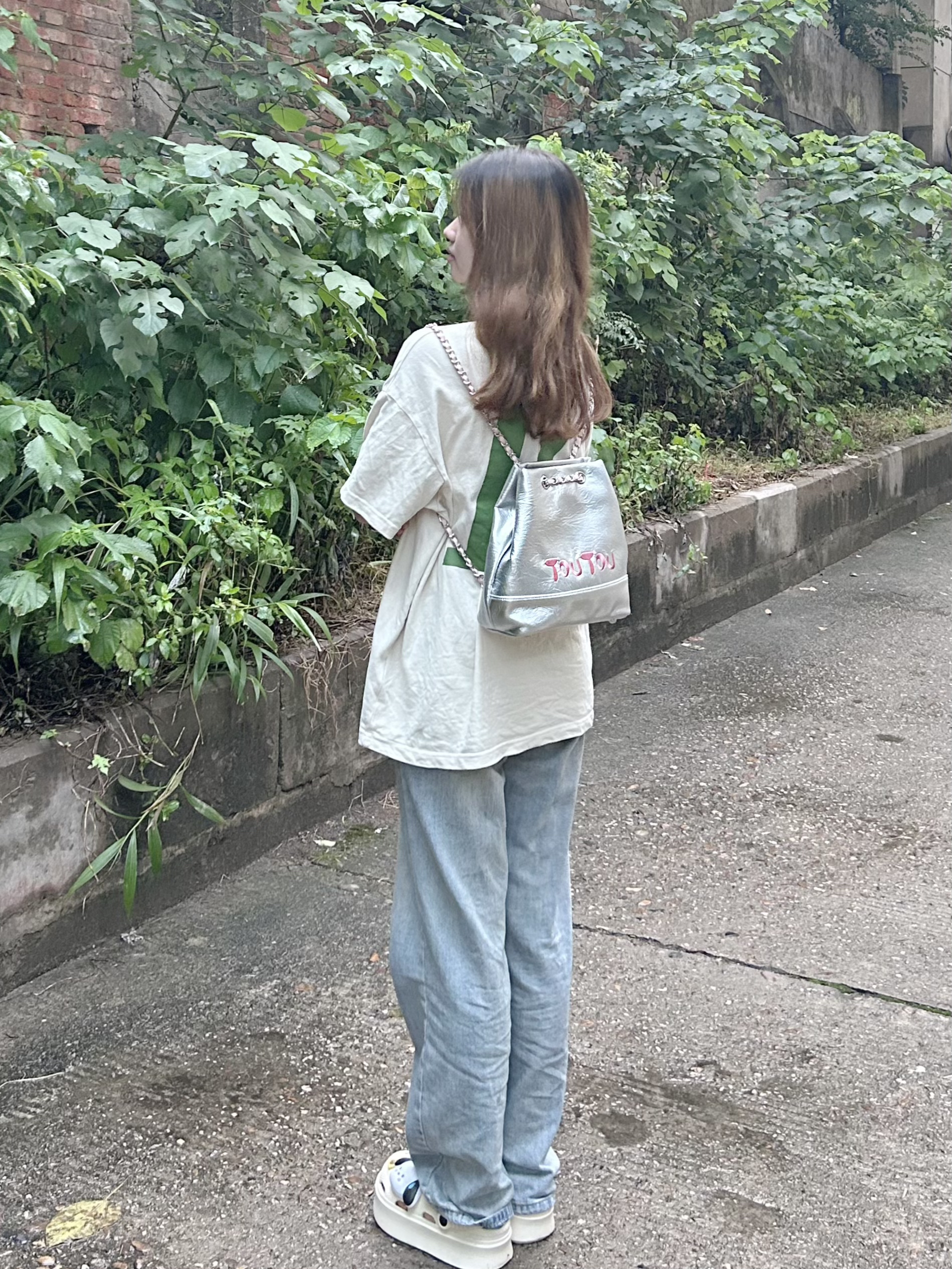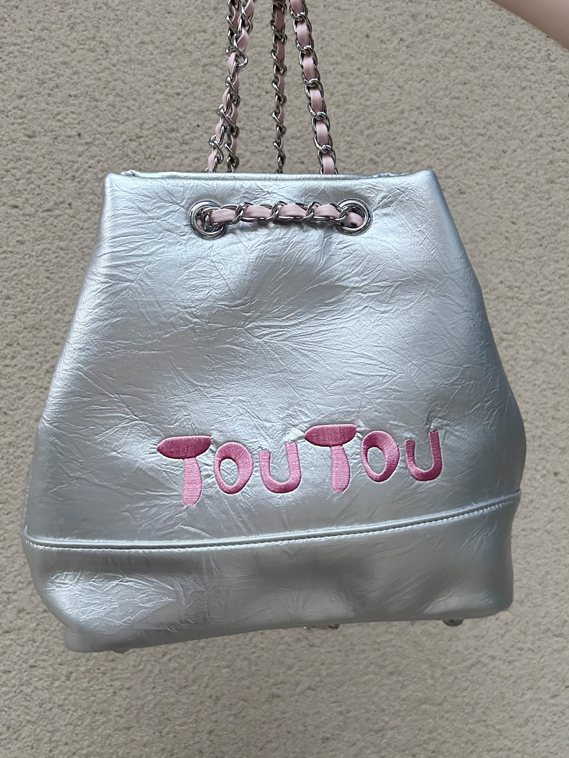 最近一直很流行银色双肩包🎒 TOUTOU的银粉色系双肩包太可爱了 正面做了品牌logo的刺绣 链条⛓️的设计是交叉的 日常搭配各种风格都很不错 容量也挺大的,能装很多东西 百搭可爱的双肩包真的太赞了