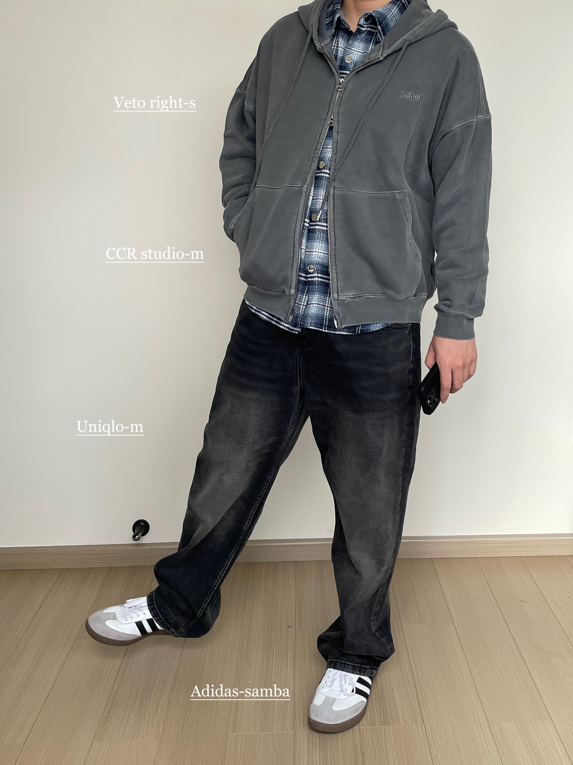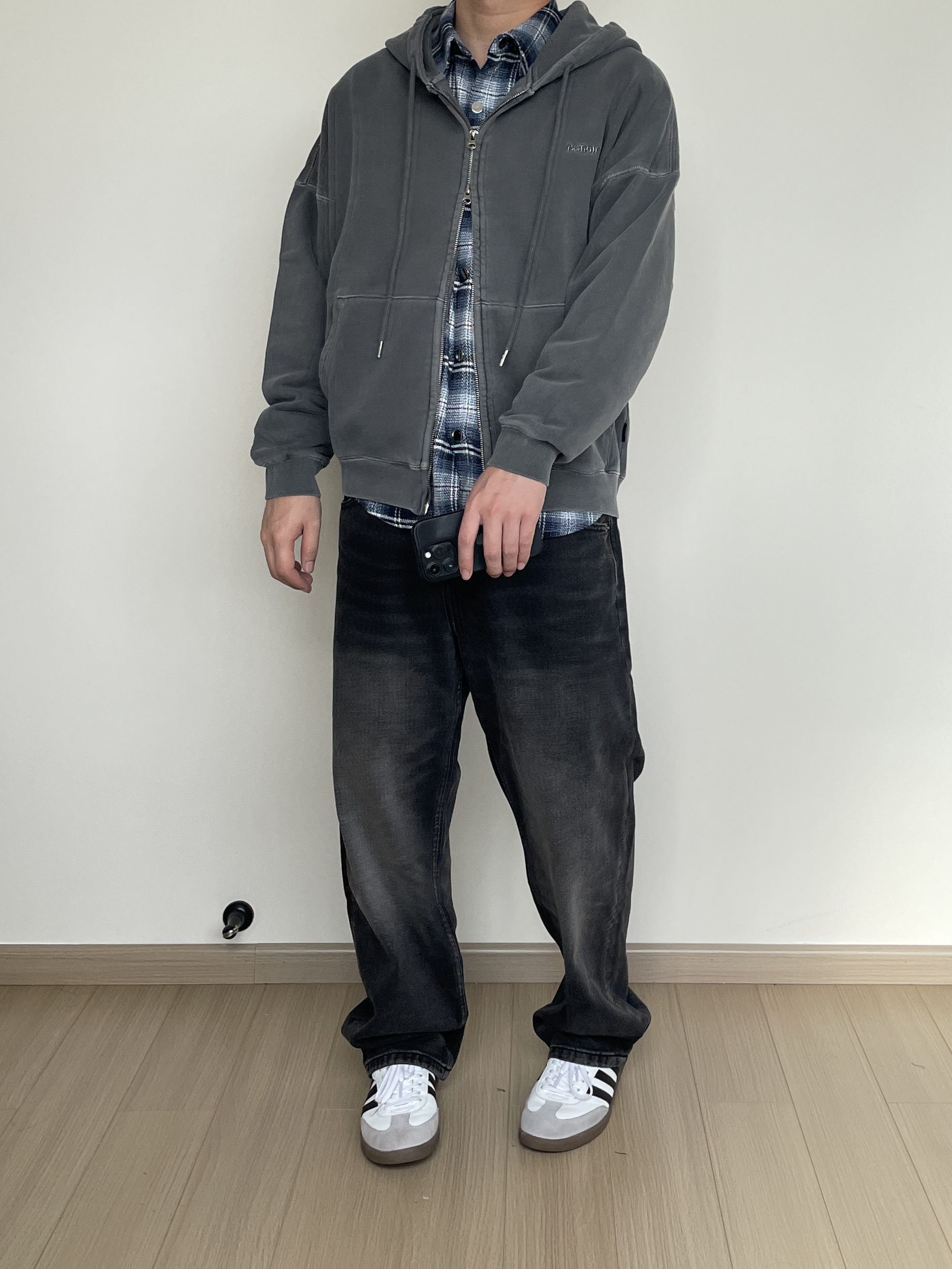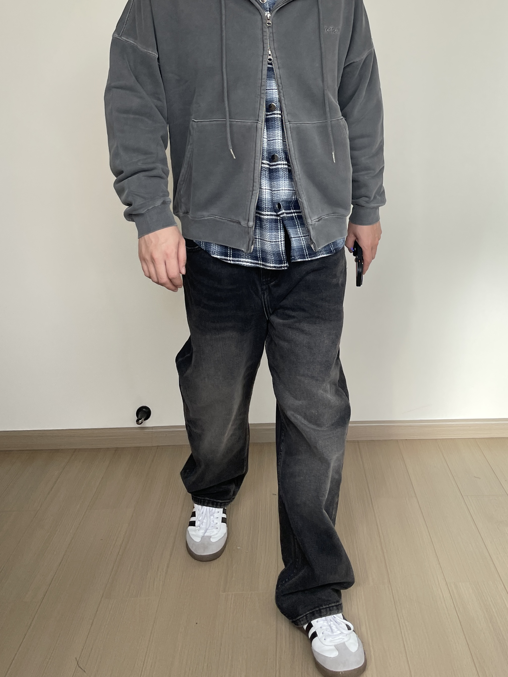 素人也能好看系列~ 174cm/68kg 🧥- 水洗做旧风的卫衣叠穿,内搭一件格纹衬衫刚刚好。内搭衬衫玩味可以多一些,甚至搭配多巴胺色彩也无妨! 👖- 选择了一条同色系的水洗牛仔裤,假如有破坏工艺说不定更帅一些。 👟- Samba秋天依旧能打,通勤百搭款
