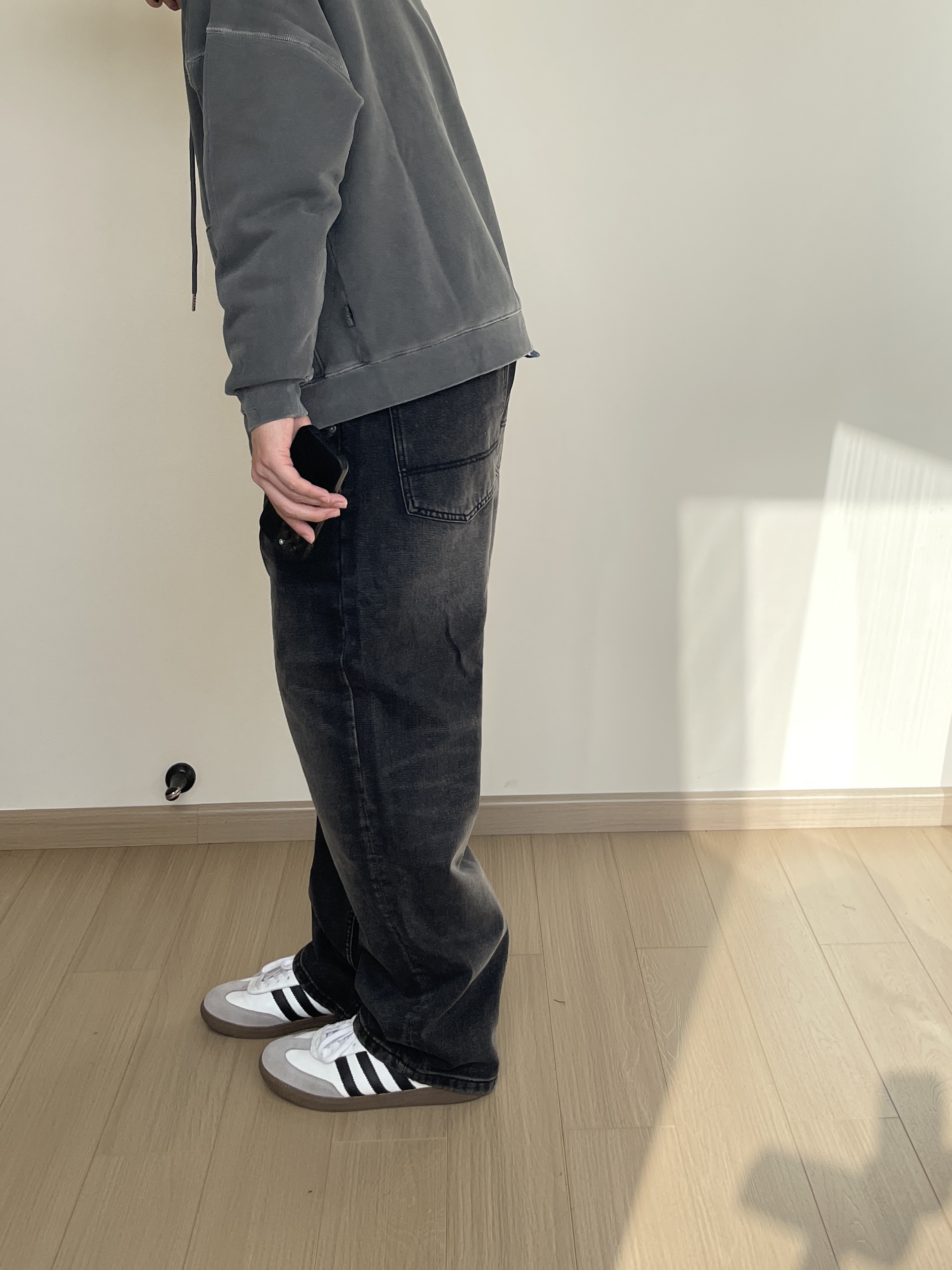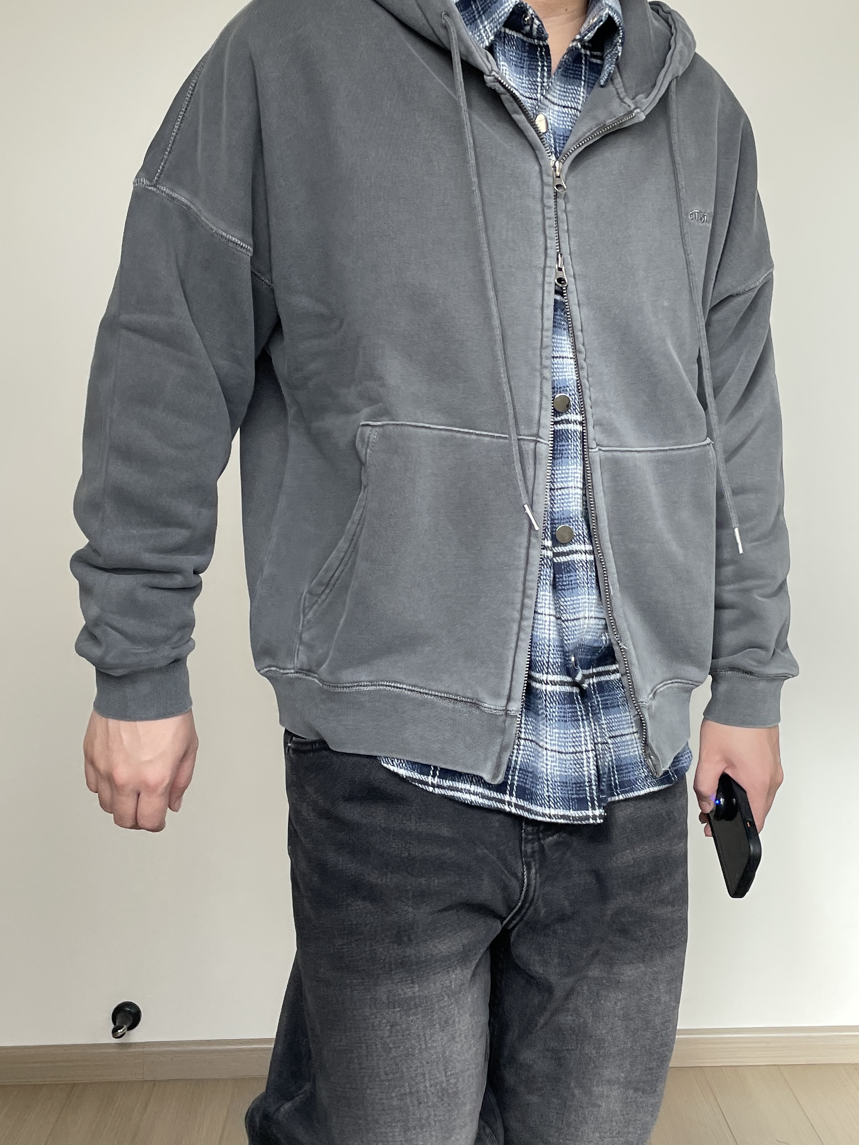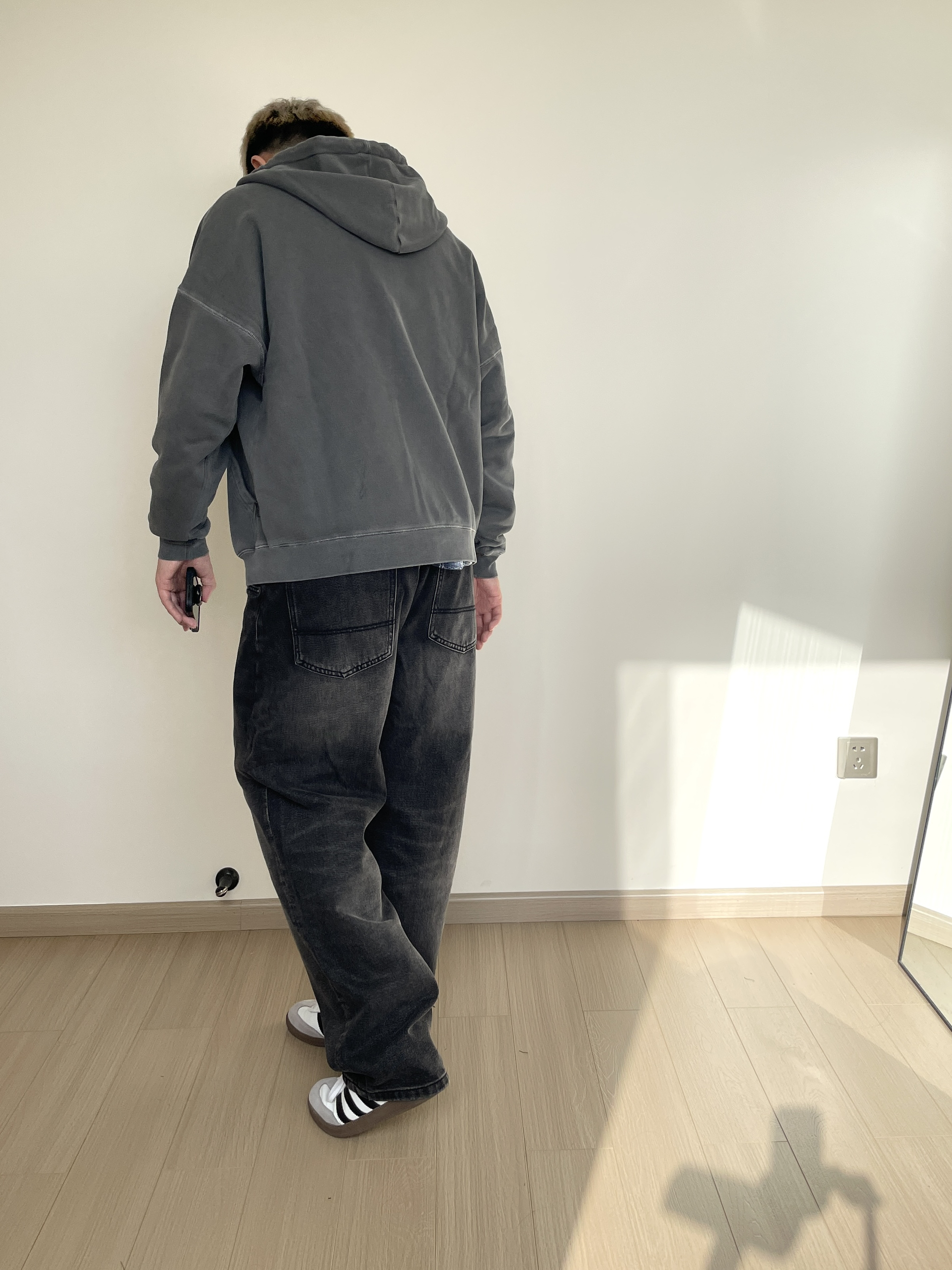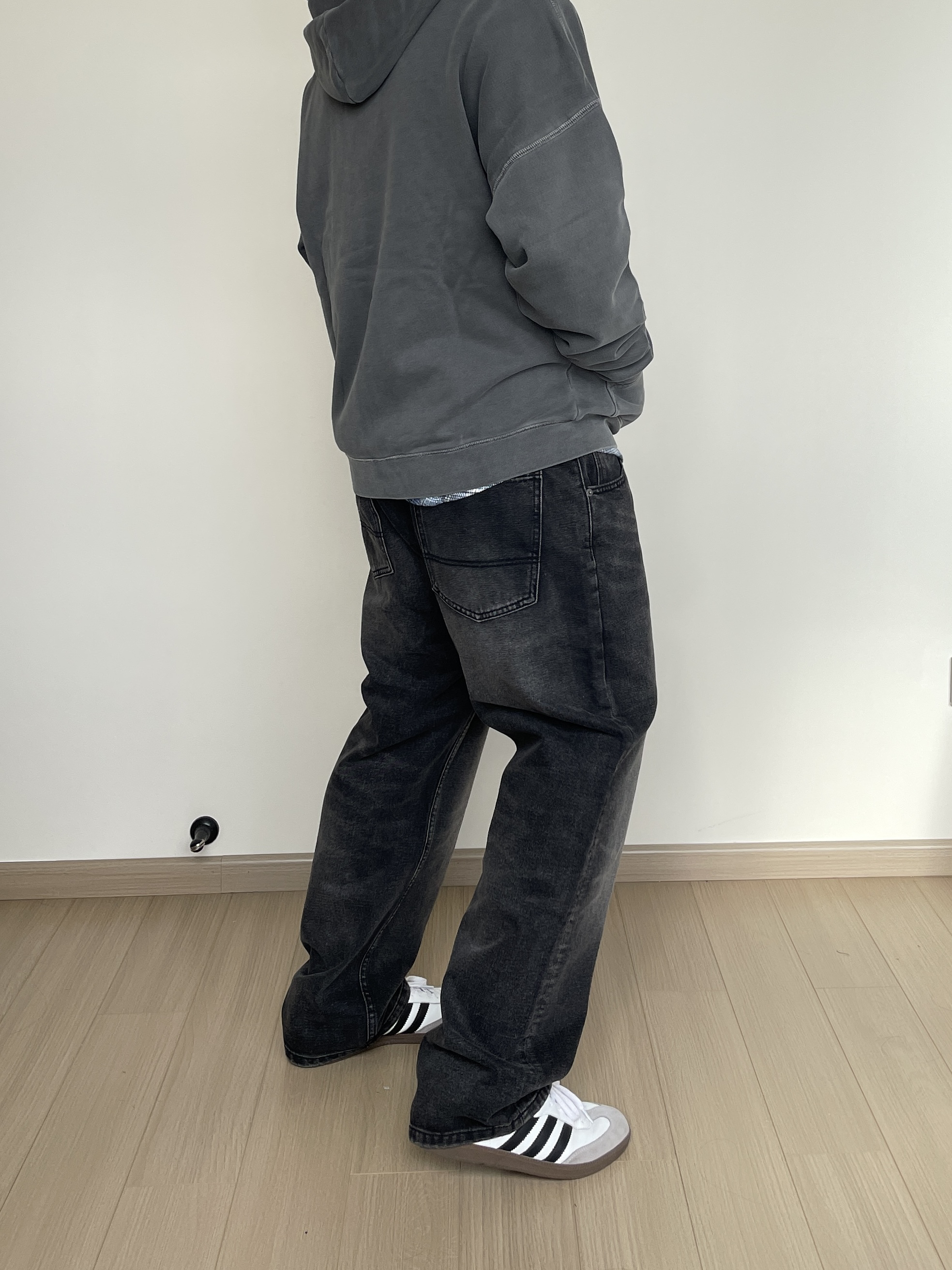 素人也能好看系列~ 174cm/68kg 🧥- 水洗做旧风的卫衣叠穿,内搭一件格纹衬衫刚刚好。内搭衬衫玩味可以多一些,甚至搭配多巴胺色彩也无妨! 👖- 选择了一条同色系的水洗牛仔裤,假如有破坏工艺说不定更帅一些。 👟- Samba秋天依旧能打,通勤百搭款