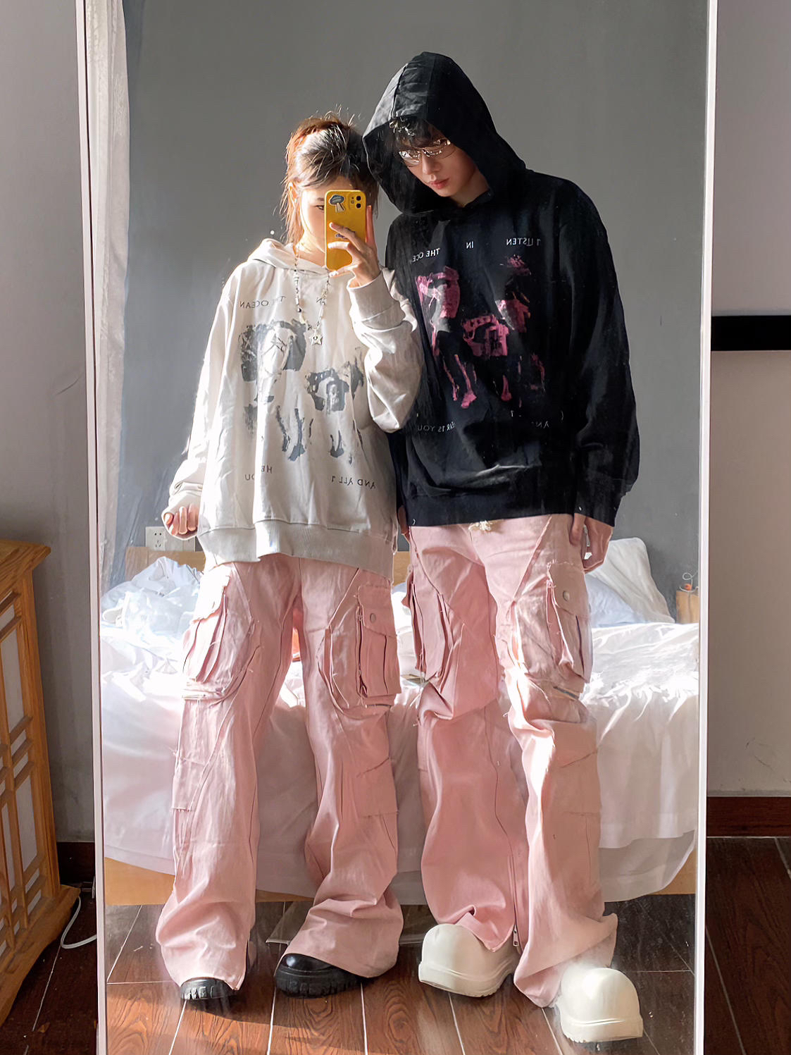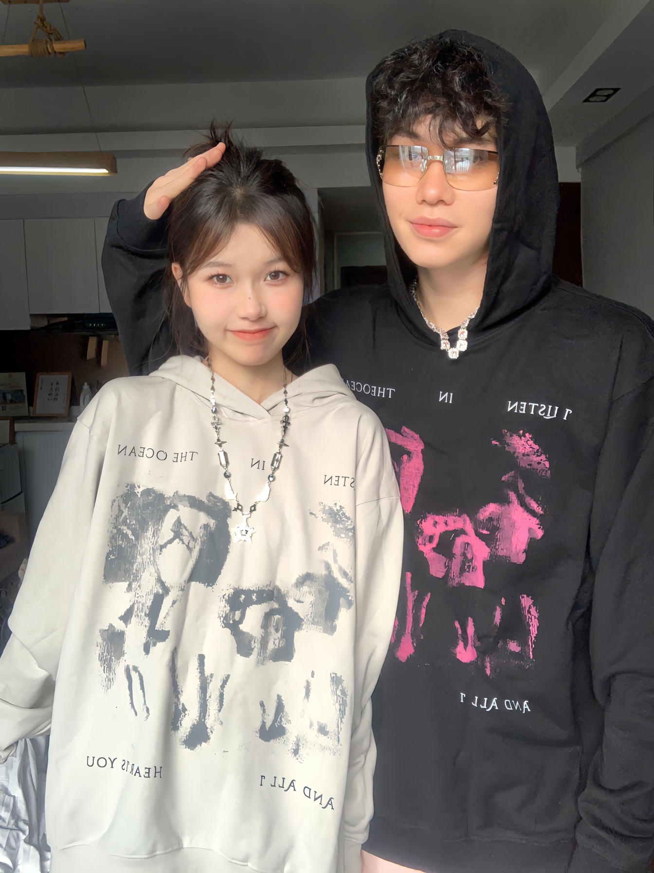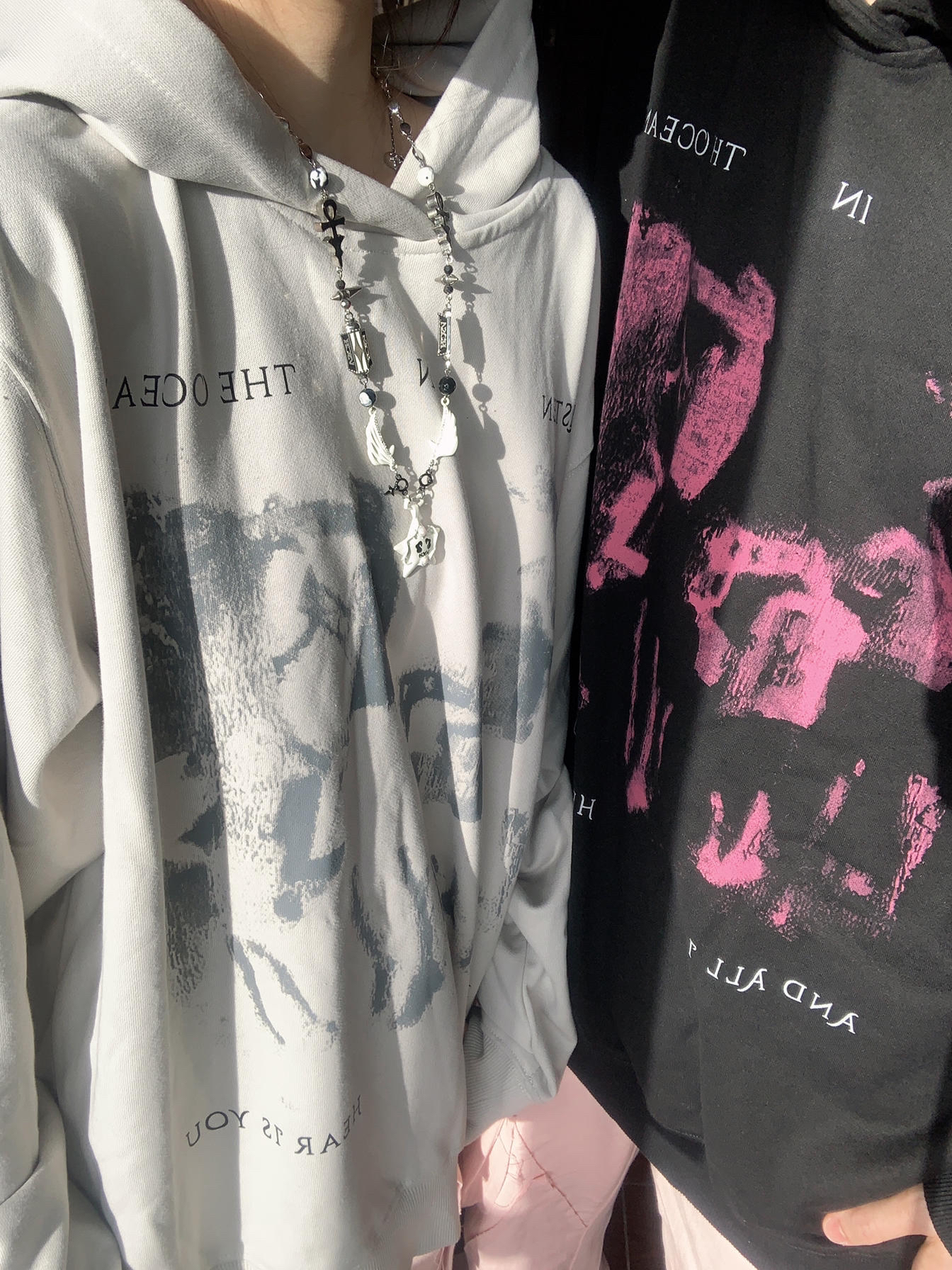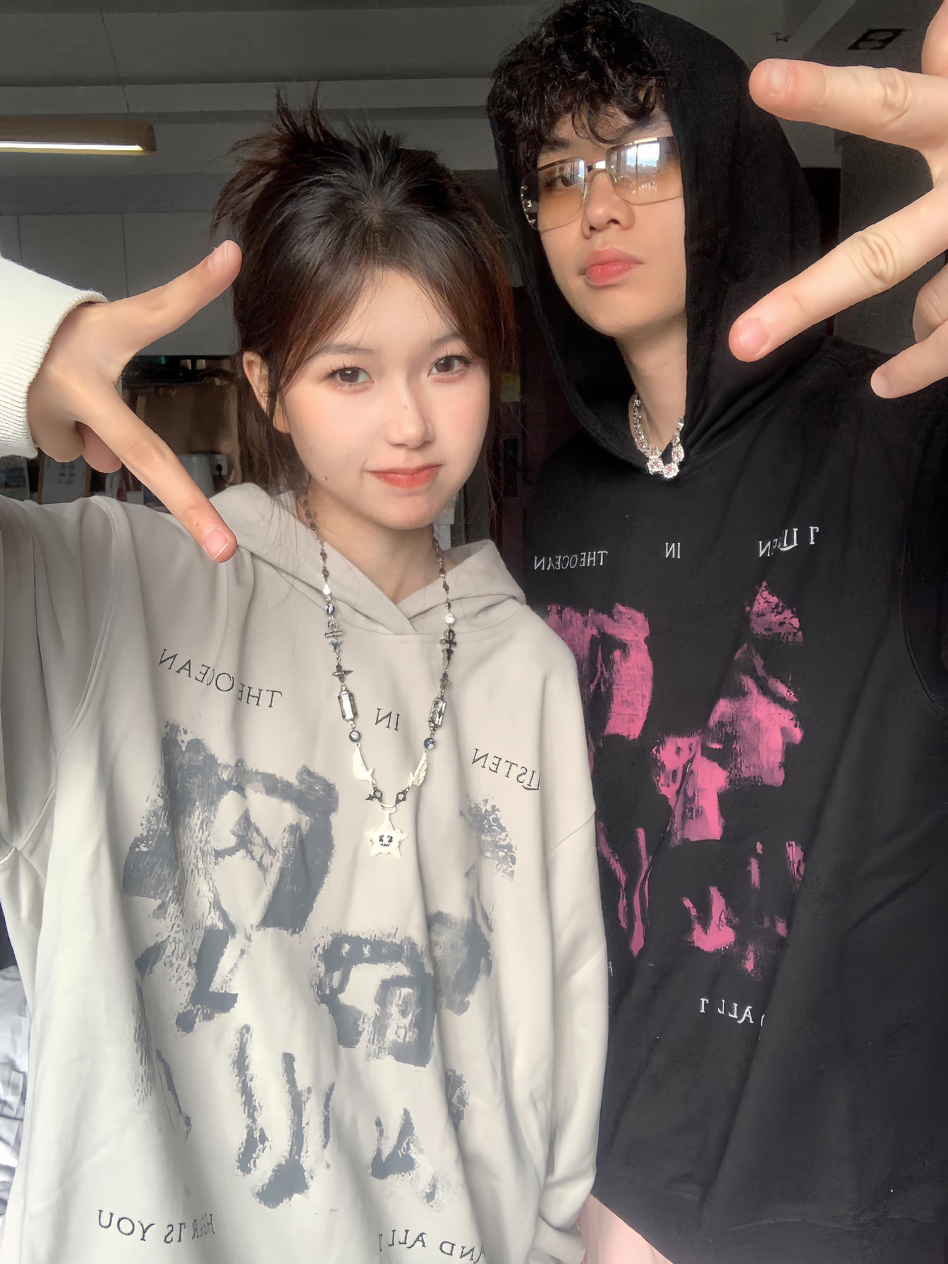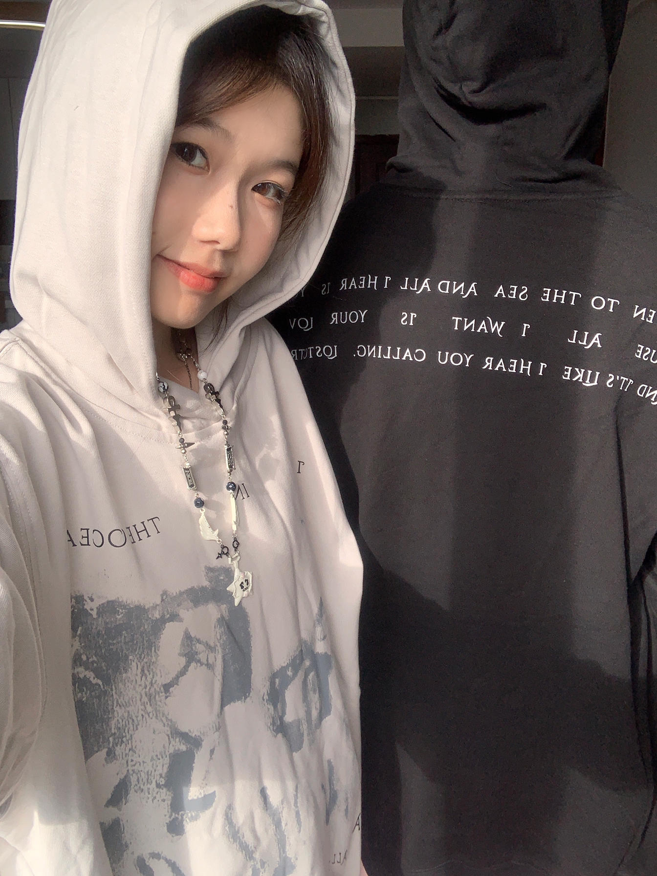 秋日OOTD: 丝网印印花薄款卫衣➕高街拉链裤 在校园、出门通勤都很方便街头 搭配:长款项链(更精致) 鞋子:德比鞋或者白色雨鞋