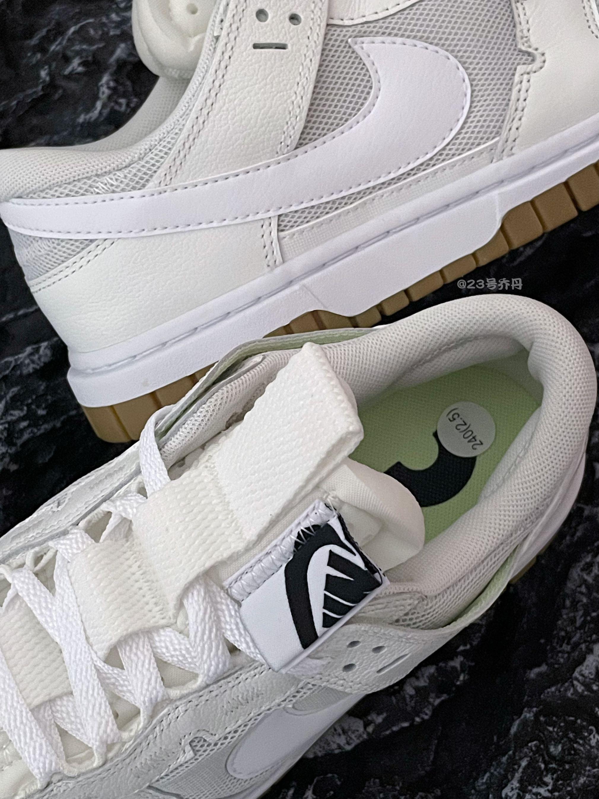 今天给大家分享一双带气垫的板鞋👟 Nike Air Dunk Jumbo『白色』 鞋款以白色为主色调 鞋面运用了网眼织物+荔枝纹路皮革拼接 鞋身多处都采用了解构设计风格 中底部分搭载了Air Strobel缓震气垫 与普通板鞋相比 脚感更为舒适 还有一定增高效果 最后由生胶色多纹路耐磨防滑橡胶底收尾 整体来说这是一双颜值和设计都挺到位的板鞋👟 配色清爽 复古百搭 适合日常休闲或通勤 缺点就是织物部...