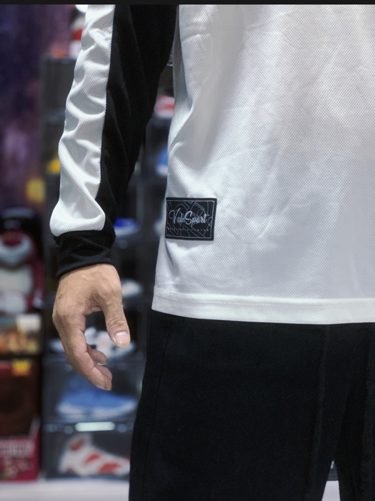 今天上身来自 维动 VEIDOORN 家的强袭系列投篮服,黑白撞色的经典搭配,插肩的设计胸口帅气的字母涂鸦,面料透气舒适吸汗不闷热。美式复古的版型设计,初秋穿搭实在不要太帅气!@维动运动穿搭 #长袖投篮服 #篮球热身投篮服 #秋冬篮球穿搭 #维动投篮服