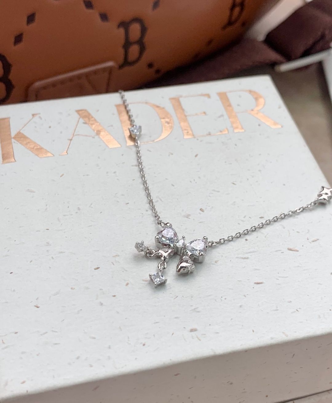 图片拍不出实物的美,是很漂亮的蝴蝶结精致到挪不开眼的一条,氛围感拉满,真的很少女谁懂,还是银925的,可以带着洗澡!