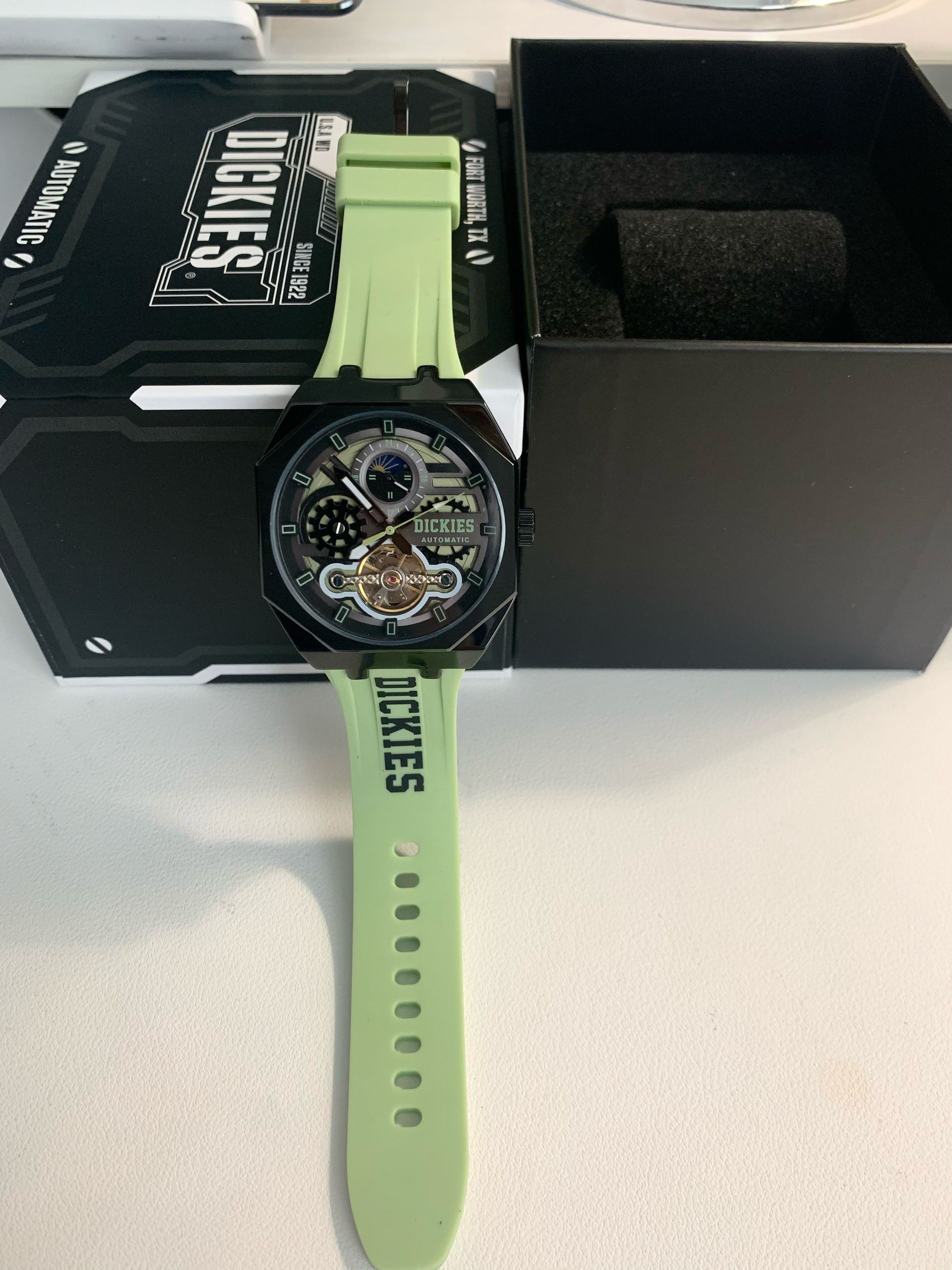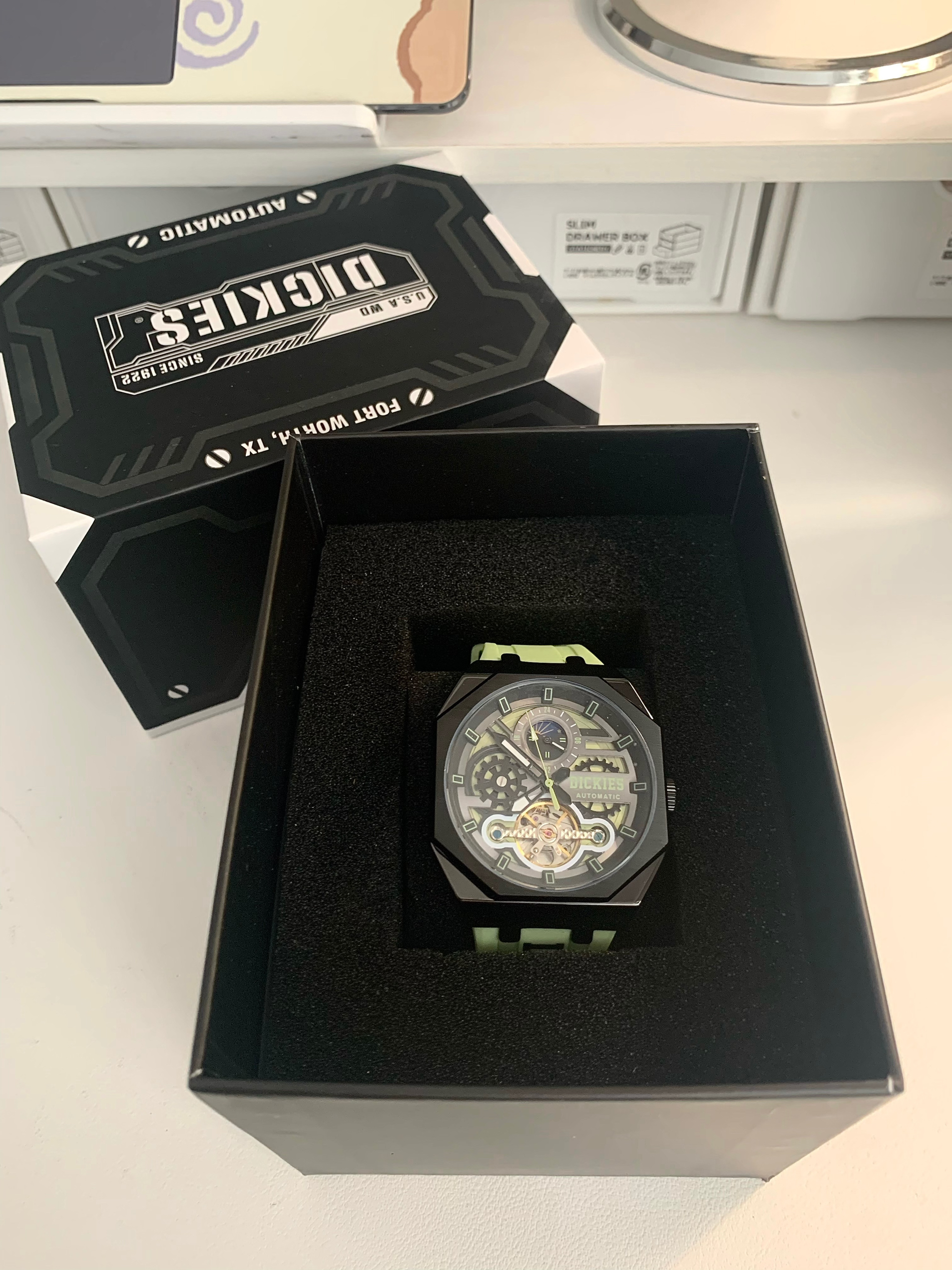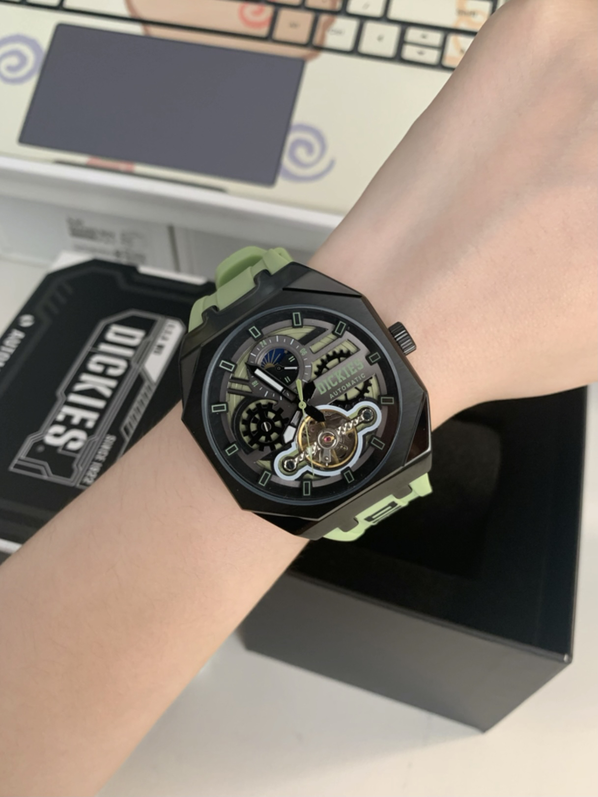 本篇笔记关联了Dickies/帝客 日月星象 大表盘背透镂空学生多功能防水酒桶形氚气自动机械男士手表 绿色 220M60LYXCL-485P3-13JX等商品,为用户提供真实的使用体验和购买参考。