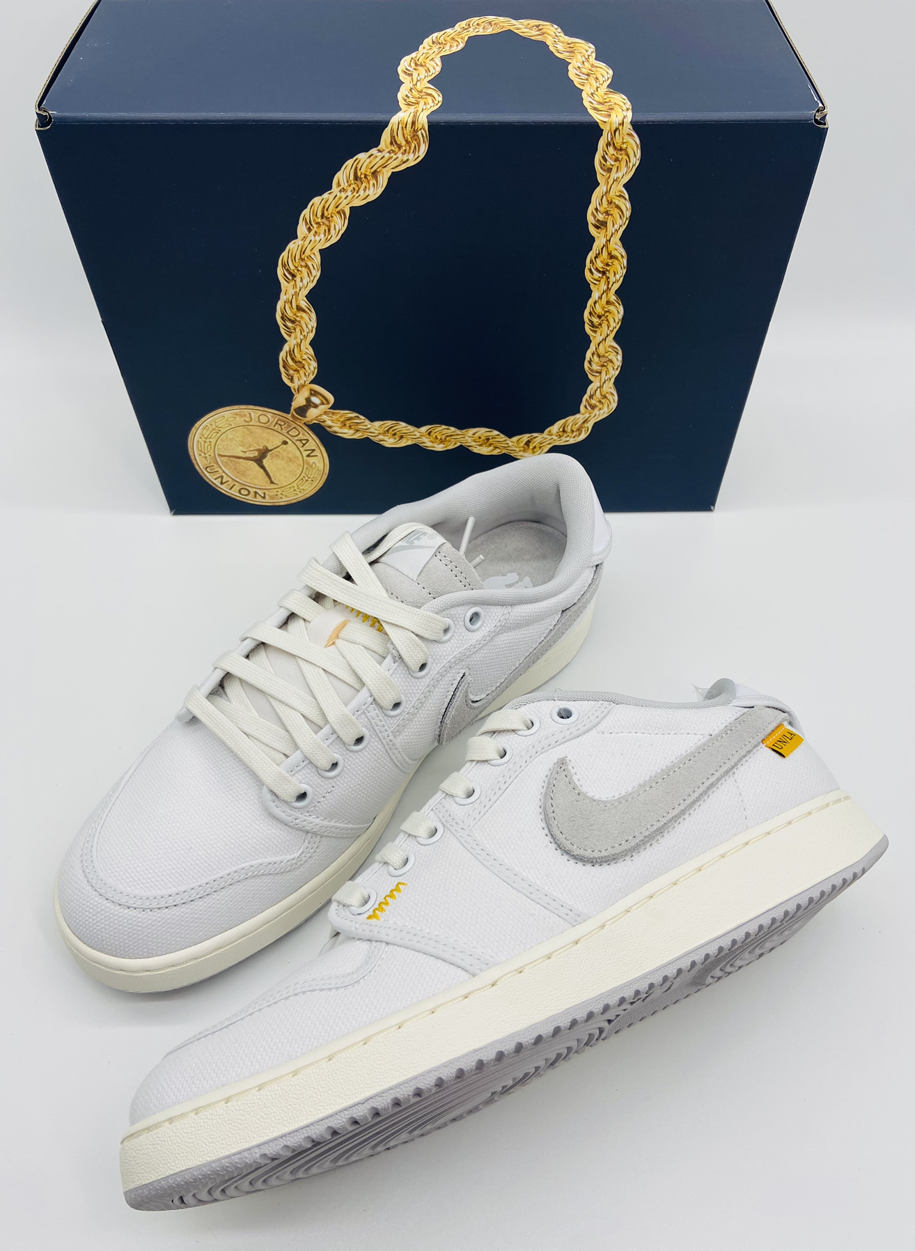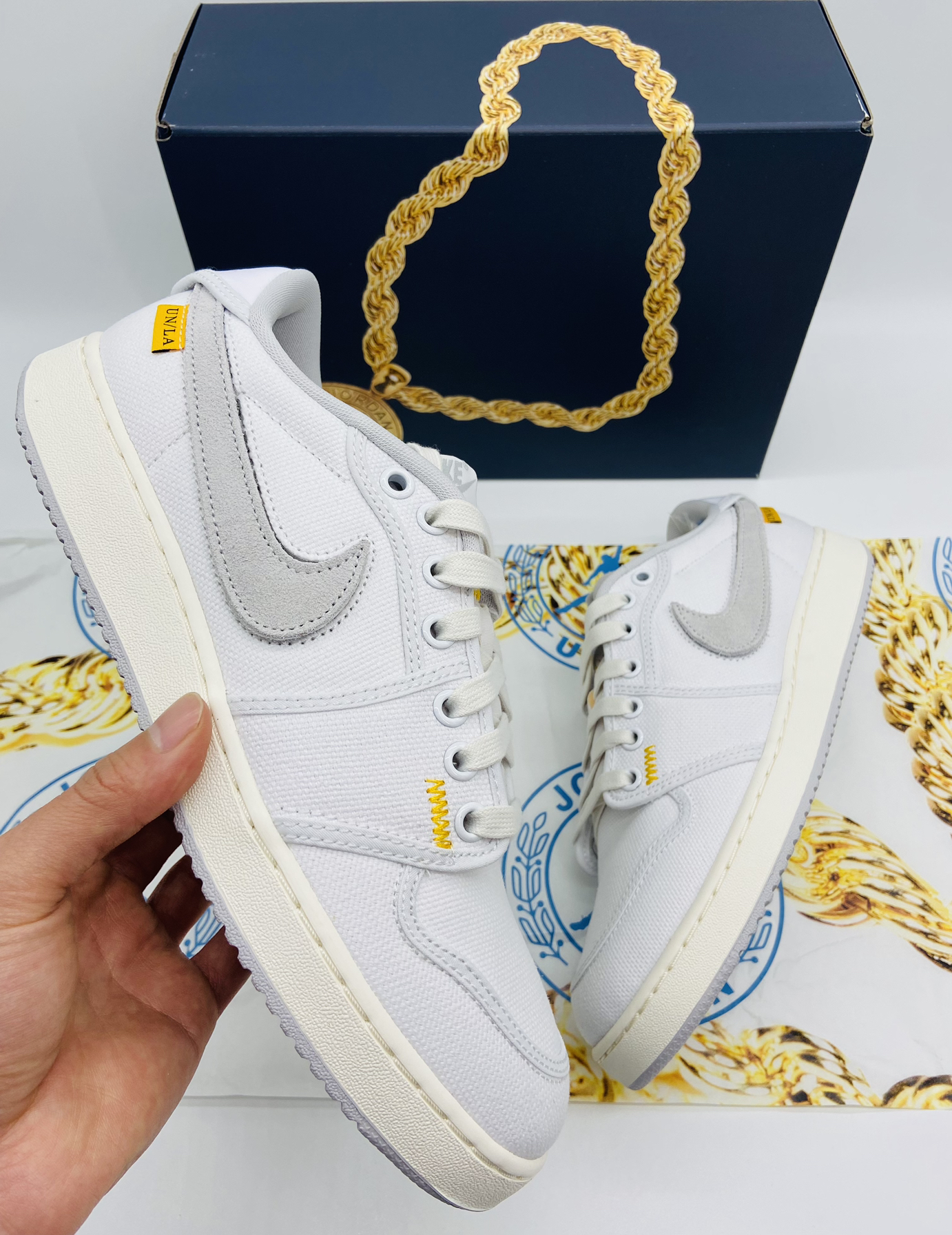 🤔宝藏三位数联名复古板鞋推荐,见惯了千篇一律的Dunk、AF1,今天来点不一样的! 🤨话不多说,隆重介绍今天的主角,就是这双Union LA x Air Jordan 1 KO Low白色! 😍 这双鞋款采用复古极简的风格,全鞋面帆布材质覆盖,细节点缀黄色缝线以及黄色“UN/LA”小标,既提亮了视觉效果又彰显了联名身份! 🥰中底采用泛黄做旧的效果,鞋底与内衬则以百搭的灰色呈现,复古味十足,两...