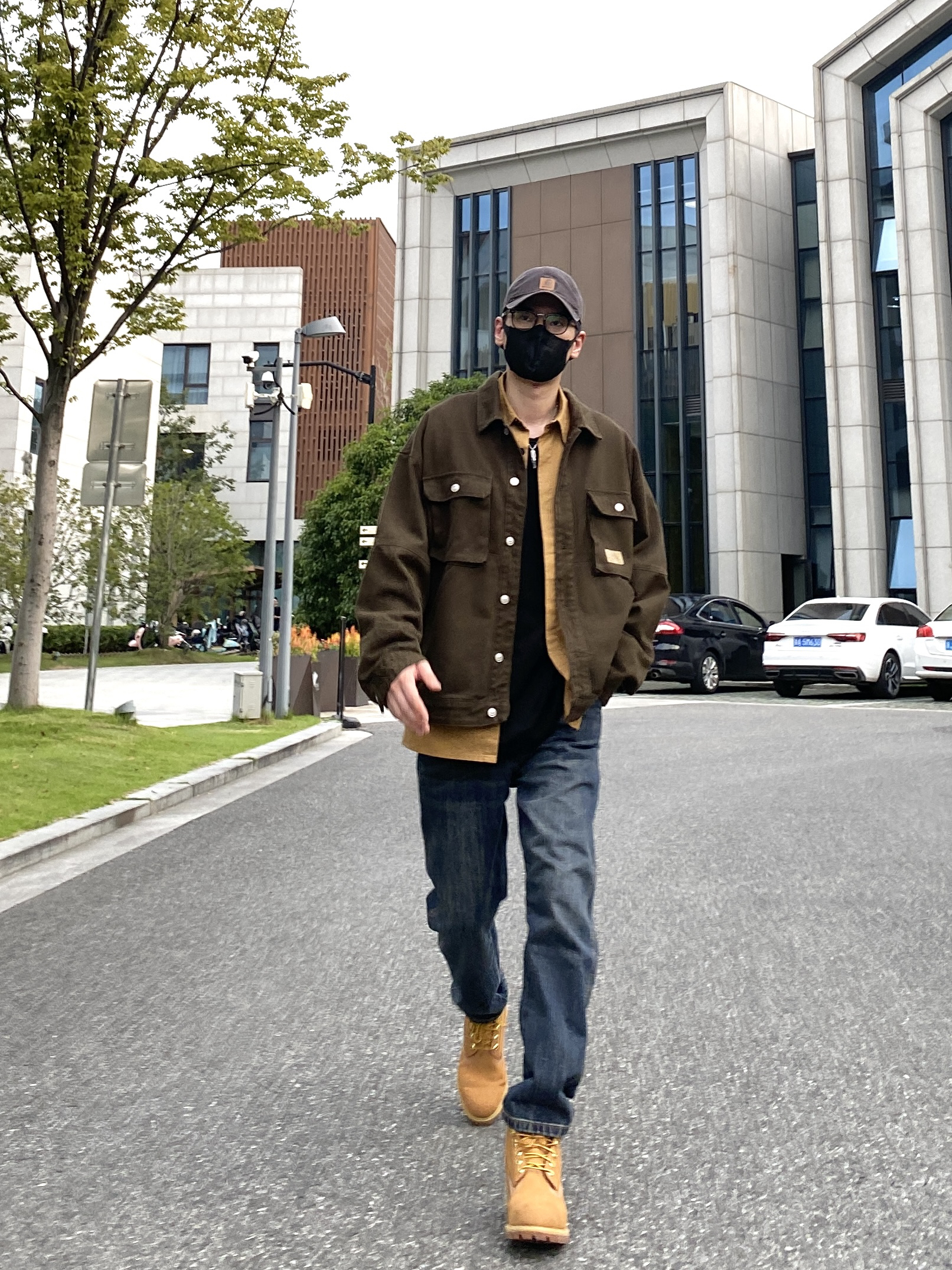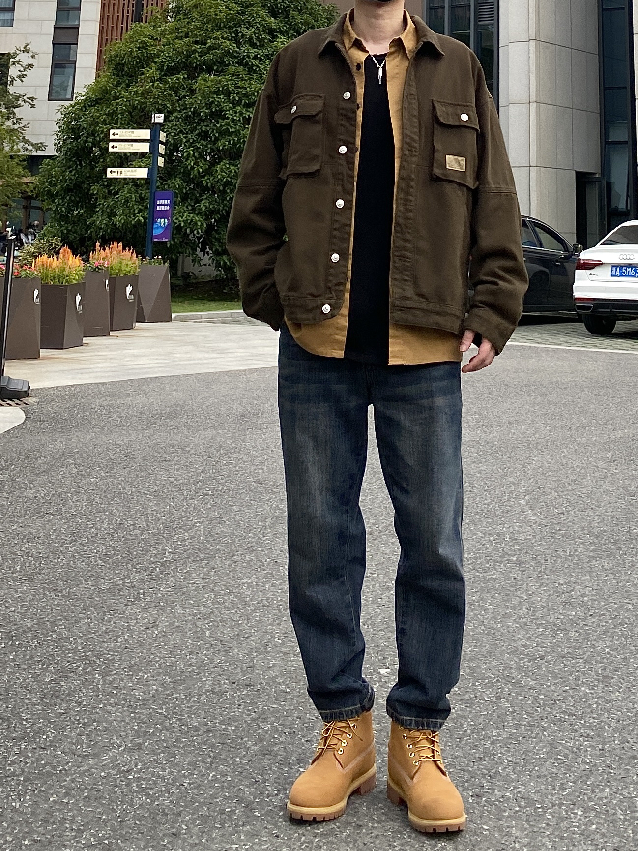 今天这套先用卡其色工装衬衫做内搭,裤子选择不挑腿型的水洗直筒牛仔裤,鞋子上脚秋冬必备的timberland大黄靴,接着套上军绿色宽松阔版重磅工装夹克,最后戴一顶深灰色做旧棒球帽,OK,出门看看搭配效果吧! - 今日穿搭 衣服裤子:NICE LILI 鞋子:timberland