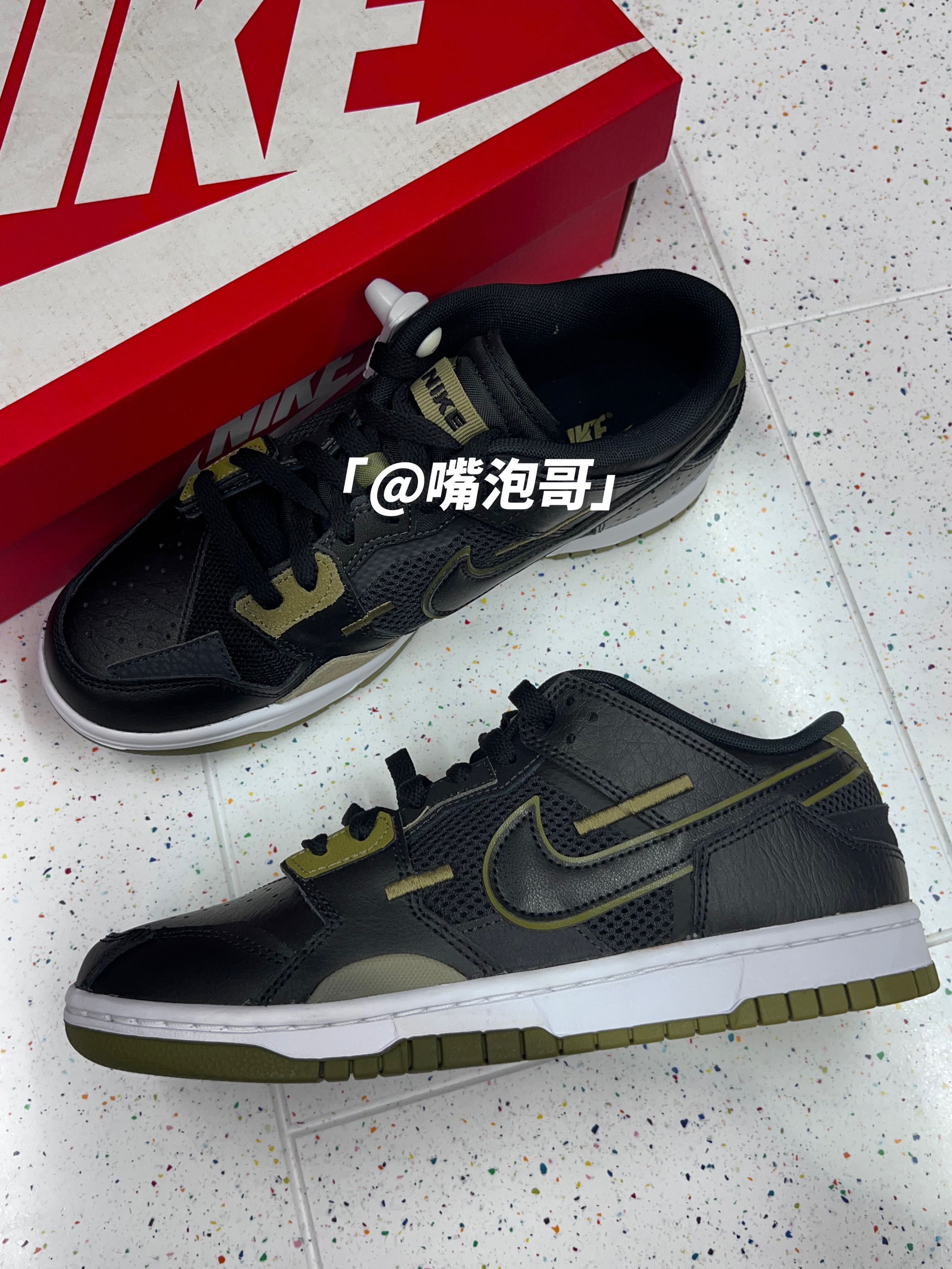 👟:Dunk Low Scrap "Black Olive" 黑绿色 简介: 鞋款虽然是低帮Dunk滑板鞋,但整体外观上与其他款Dunk还是有些较大的区别,整双鞋子在外观设计中选用了叠加解构来呈现,使其外观更具个性,总体脚感依旧保持原有Dunk的感觉,并没有提升。 细节: 鞋面采用了复合皮革、织物网布、耐磨橡胶等材料组合而成,并且鞋面是以不规则拼接的组合搭配,有叠加解构的时尚感,两侧的...