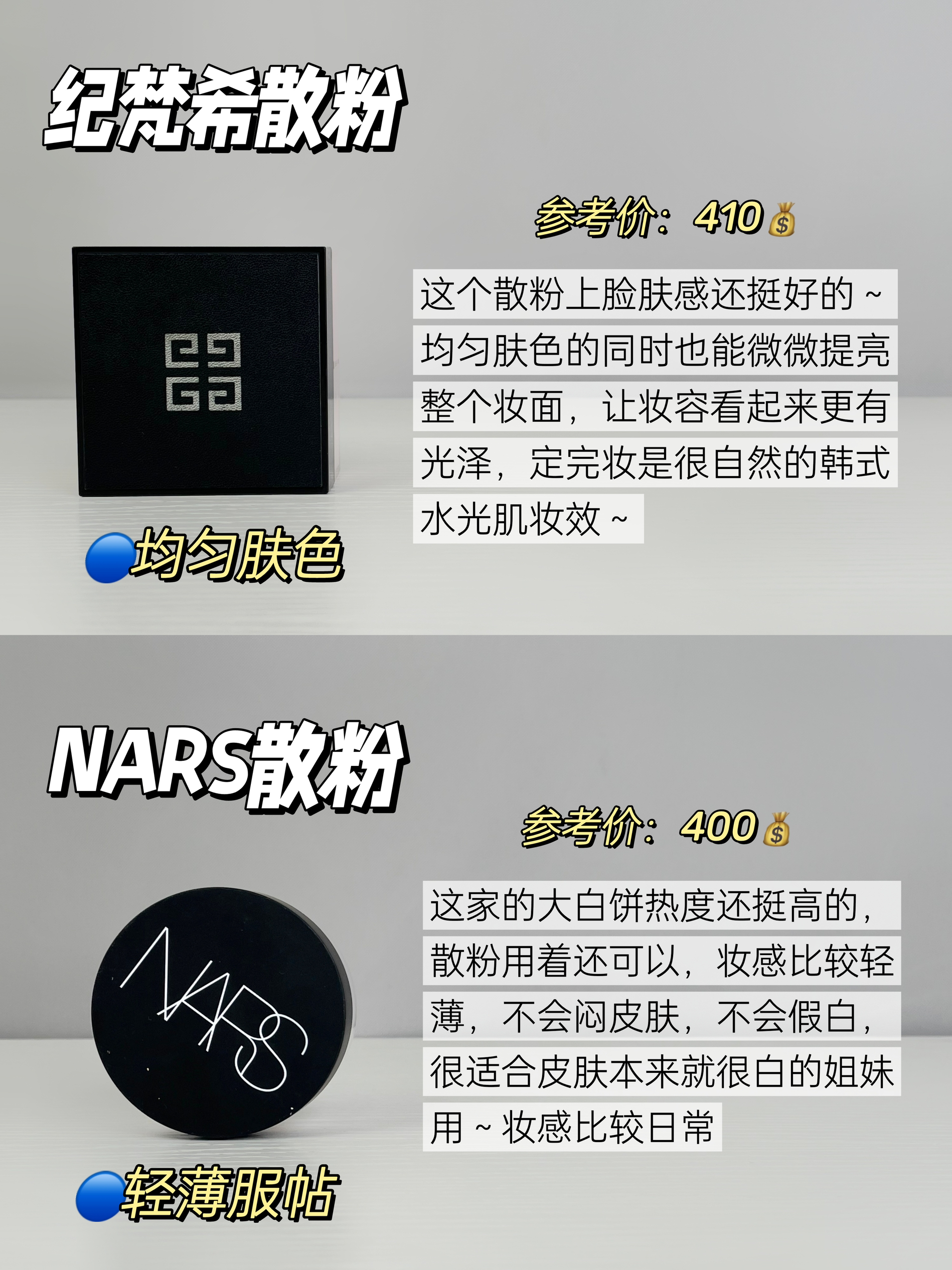 本篇笔记关联了NARS 流光美肌清透散粉 哑光 10g 透明色 适合所有肤色、Givenchy/纪梵希 四色四宫格散粉 哑光柔雾持妆匀亮修饰肌肤 01百搭滤镜 一般亚洲肤色、花西子 傣族印象定制版玉女桃花轻蜜粉 8.5g #03妆似雾(透明哑光)等商品,为用户提供真实的使用体验和购买参考。