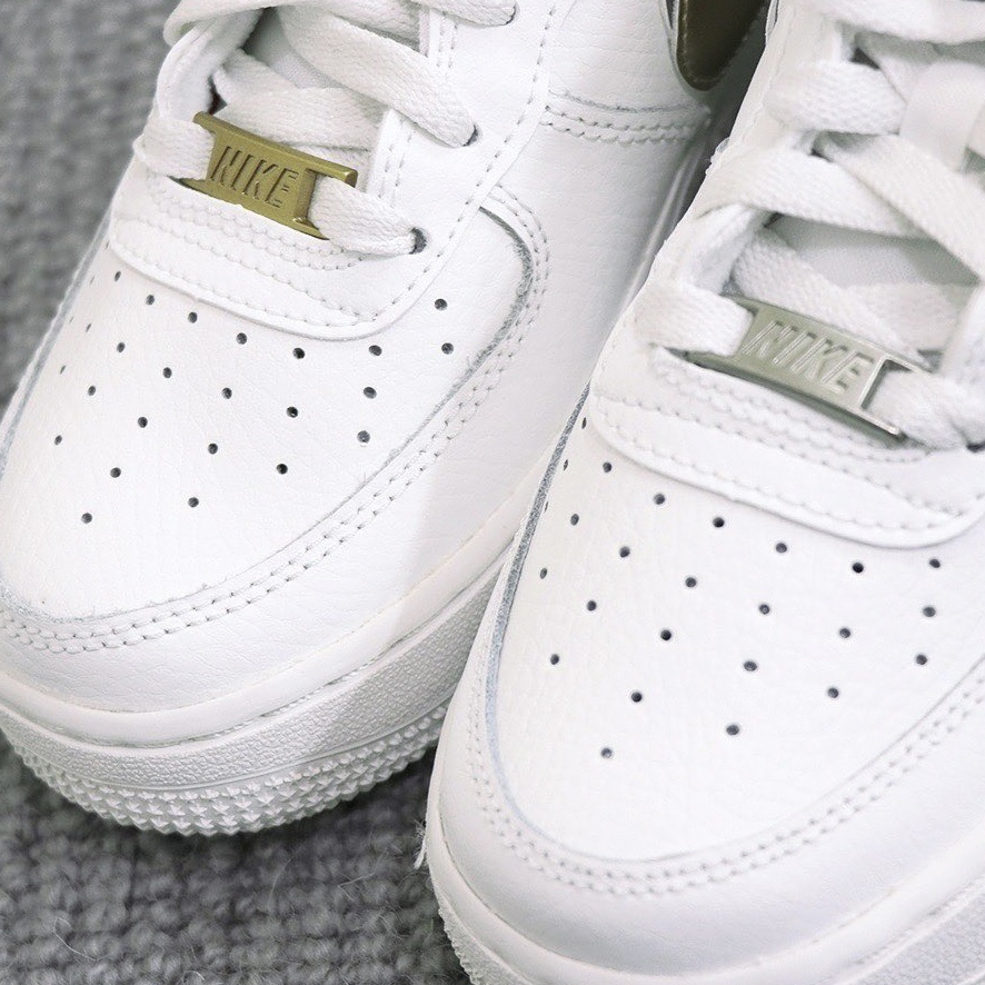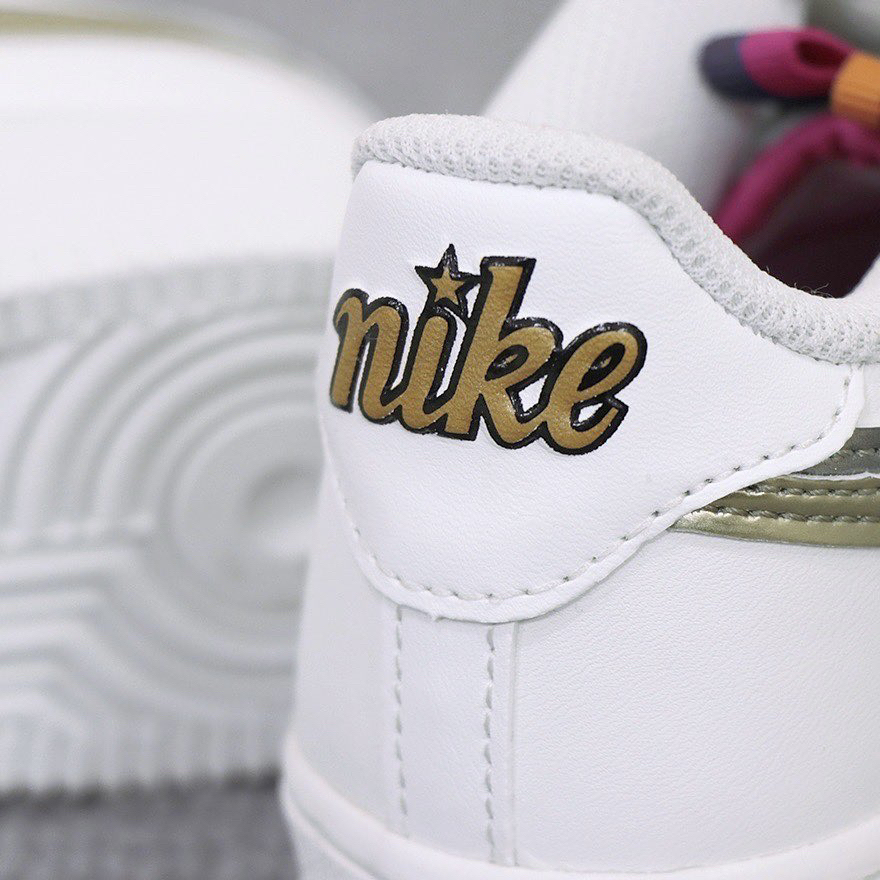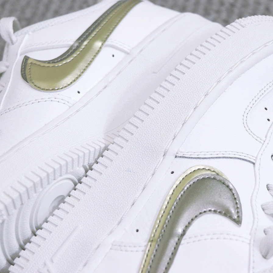 鞋名:Air Force 1 Low 白金银 外观及细节: 虽然鞋子是的外观并不陌生,是采用空军一号的鞋型设计来呈现,但在细节处做出了改动,是鞋子很有质感及时尚感,纯白色的鞋面与基础款区别不大,但在两侧的swoosh logo设计上这双更具有特色,使用了金色与银色漆皮的swoosh叠加起来,小高级感立马就有了,而且鞋舌上还有两条狗彩色织带作为小点缀,后跟上的Nike标志也换成了更具街头涂鸦感...