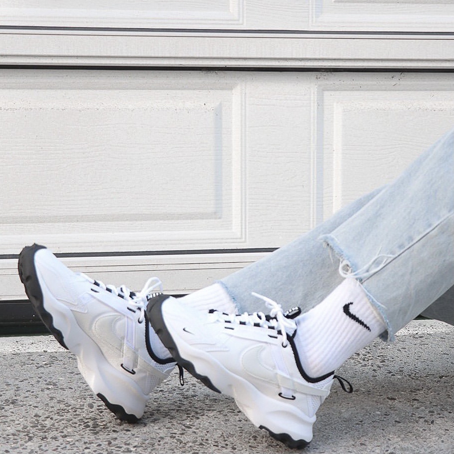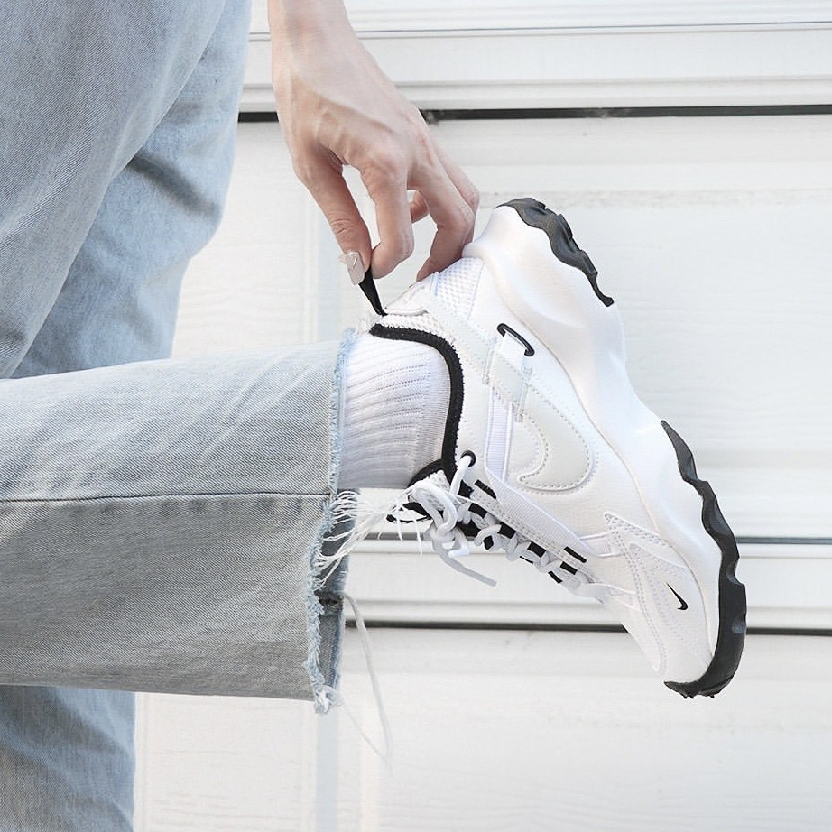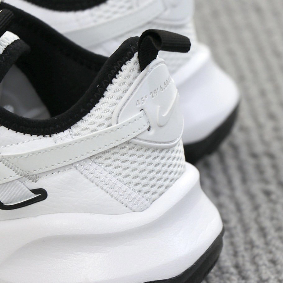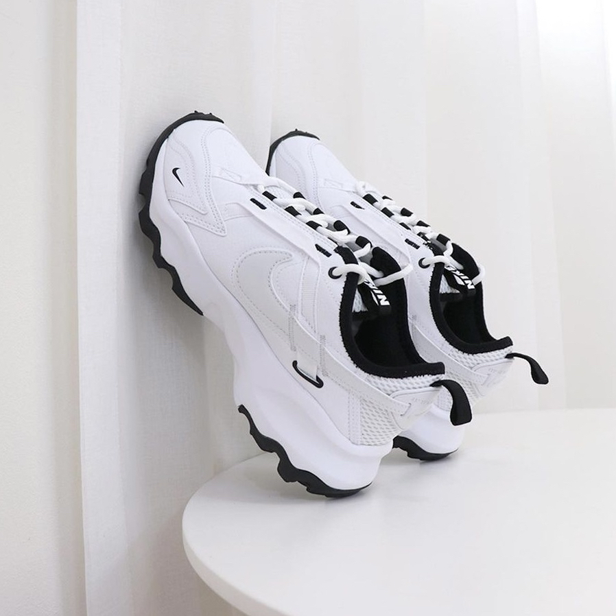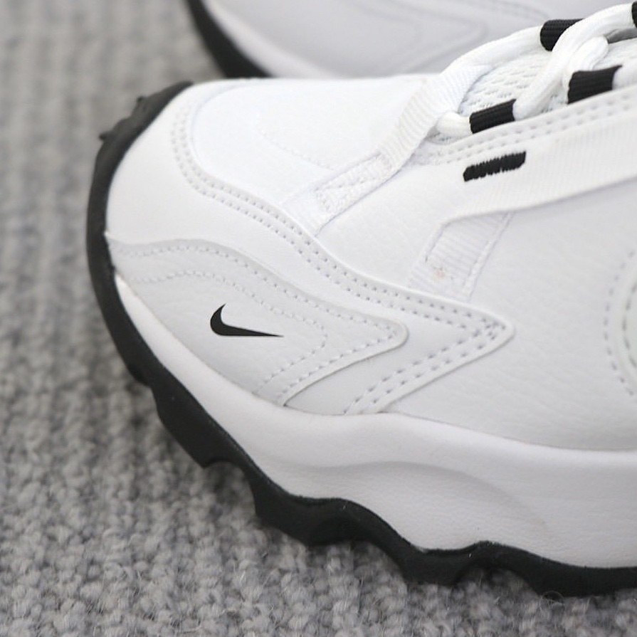 鞋名:TC 7900 TC白黑色 外观及细节: 这双鞋子外观的配色还是很简约百搭的,鞋型上是休闲鞋的样式设计,运用了白色的复合皮革制作整个鞋面,包括两侧的swoosh logo也是用了白色皮革,与鞋面保持一致,黑色的织物鞋带扣,增强了固定的效果,后跟上和鞋舌都是用网眼布,透气性是不需要担心,加厚的中底泡棉,使得脚感舒适,前后掌设计的外底,又很有复古老爹鞋的感觉。