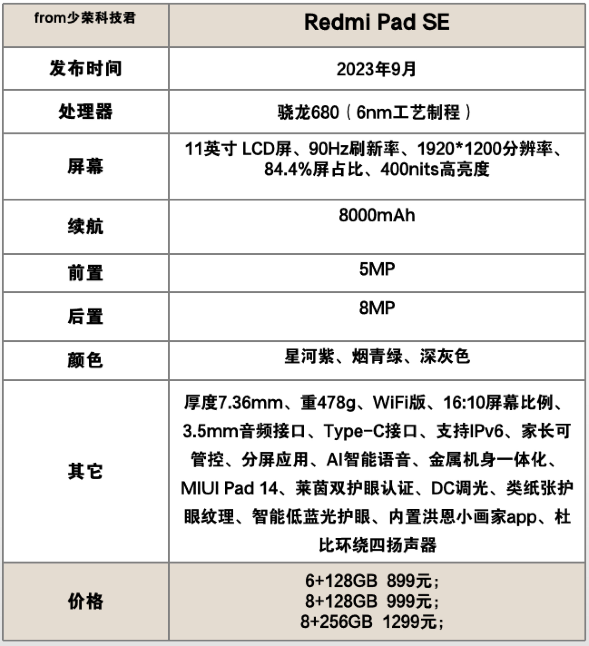 前几天红米发布会推出了一款Redmi Pad SE 千元平板,售价899元起,感觉很适合家里的小孩写写画画或者上网课,亦或是对平板需求不大,也就是买后爱奇艺的需求用户。 Redmi Pad SE搭载了一款11英寸 LCD屏幕,1920*1200分辨率、还内置洪恩小画家app,配上一支笔,妥妥的小朋友学习生产力。 金属机身一体化着实质感不错,478g的重量有点重手,单手握持看个书什么的,会有点累...
