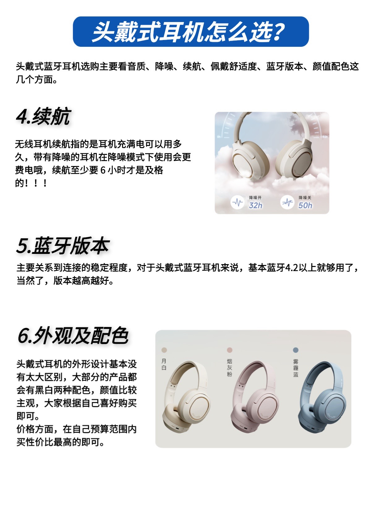 大家好,这里是 @TK玩数码 如果你需要一个不入耳能听歌,可以看下头戴式耳机,这篇给大家分享百元到千元的头戴式耳机选购,谨防踩坑。 一、头戴式耳机怎么选? 二、头戴式耳机品牌有哪些? 头戴式蓝牙耳机选购主要看音质、降噪、续航、佩戴舒适度、蓝牙版本、颜值配色这几个方面(参考图2~3) 三、耳机品牌有哪些? 🎧耳机品牌主要分为四类: 国内音频大厂、外设厂商、国际音频大厂、互联网衍生品牌(查看图...