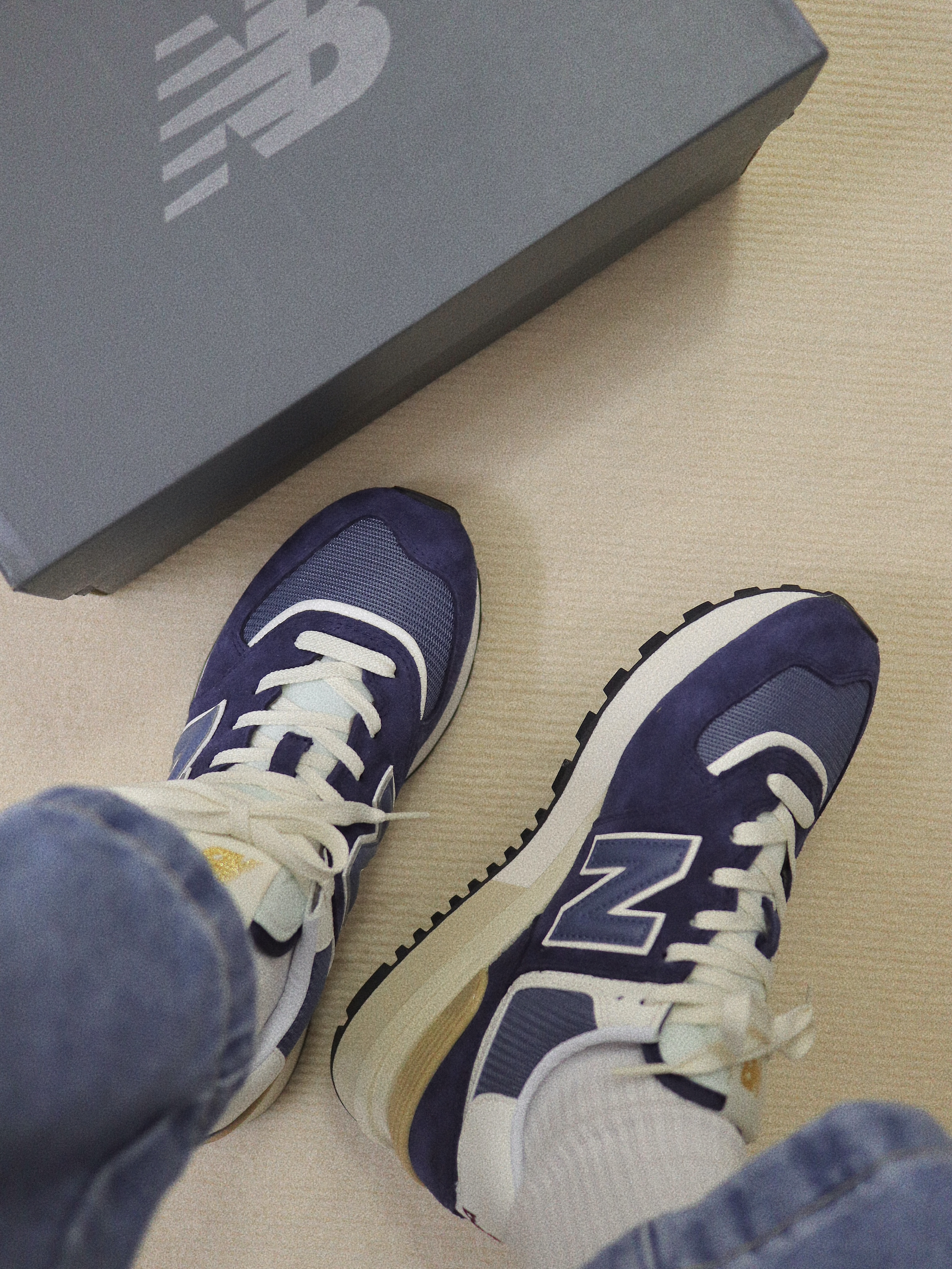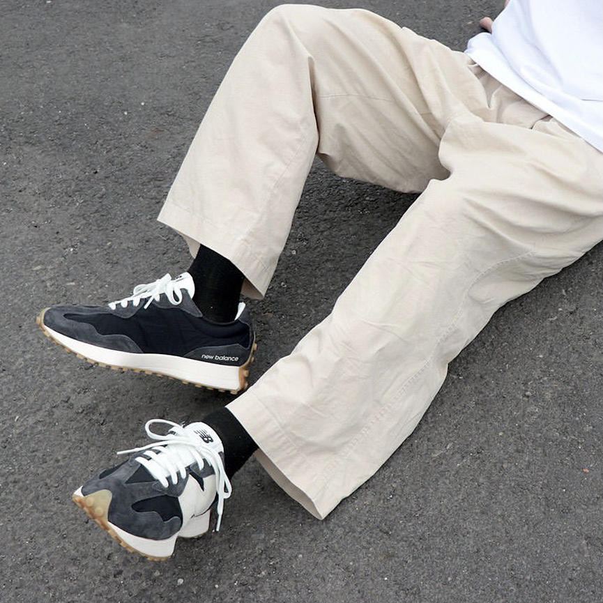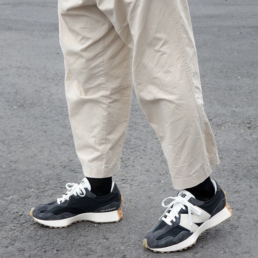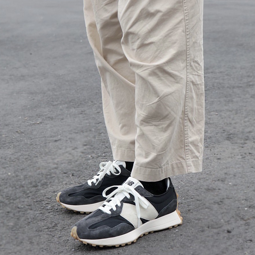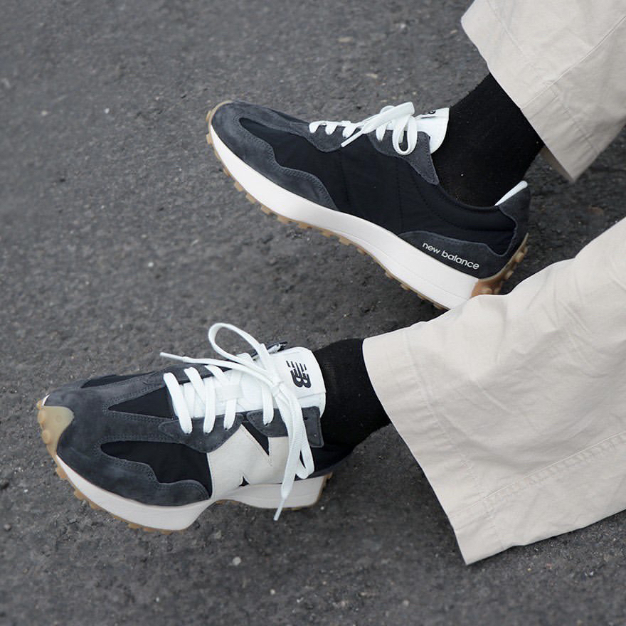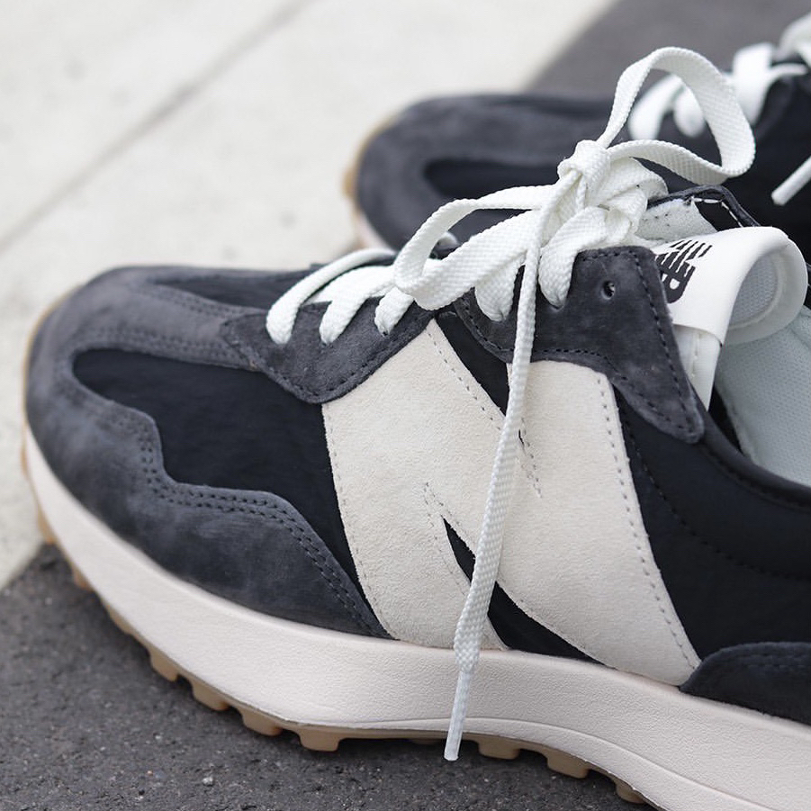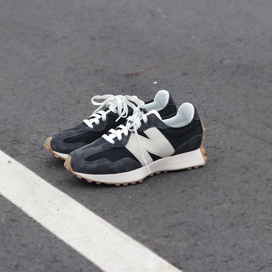 鞋名:New Balance 327 黑蓝色 外观及细节: 鞋子单从外观上看并不陌生,就是比较经典的New balance 327系列复古休闲鞋,配色及用料上还是和其他327有点不一样的,鞋面采用带有刷色感的黑蓝色麂皮与织物布组合而成,外侧巨大的“N”很有视觉冲击力,轻薄的织物鞋舌又可与脚部更贴合,柔软的中底泡棉提供了软弹的脚感,生胶材料制作的外底,为鞋子增加了复古感,很适合夏日复古穿搭。