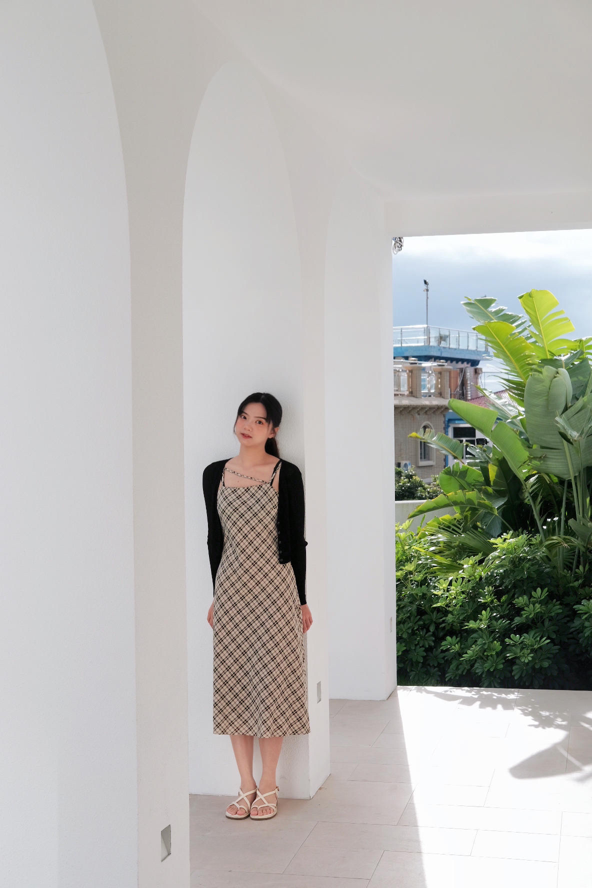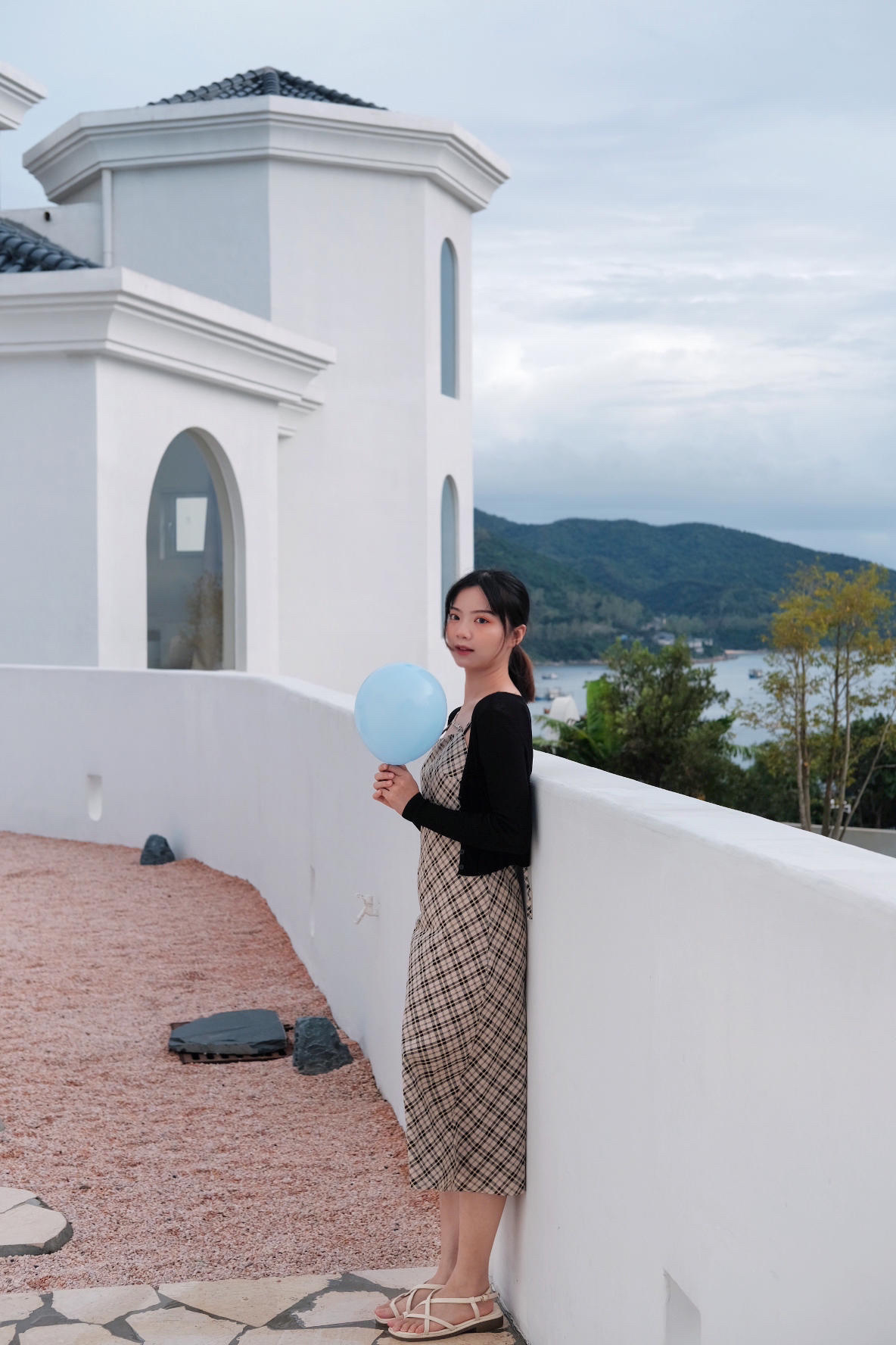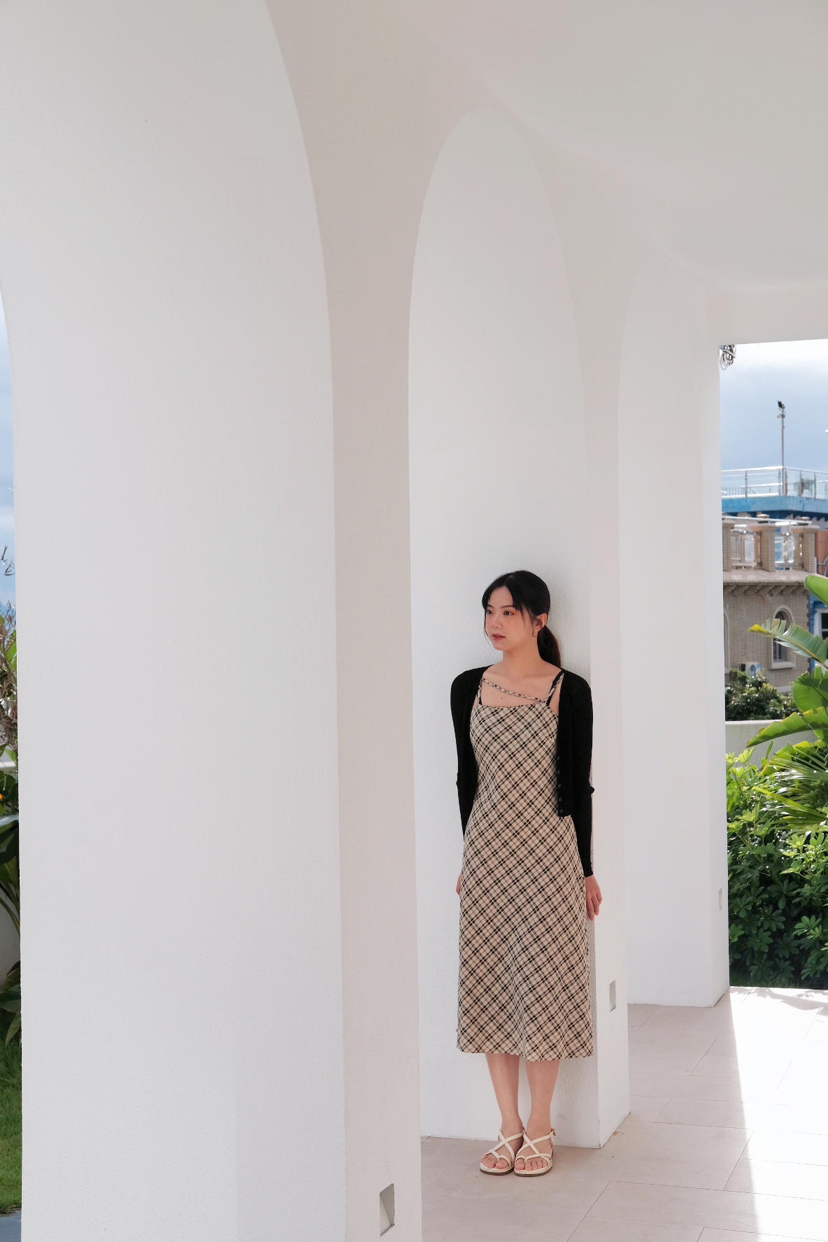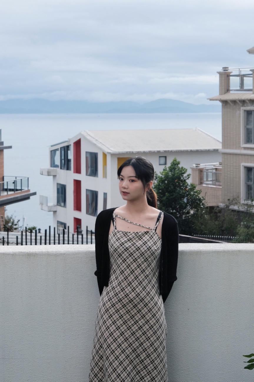 最近去看海了 天空很蓝 海水很清 在海边当然要穿裙子呀 格子吊带连衣裙真的是永不过时 外搭一件镂空的短款外套 遮肉又防晒 出片率💯