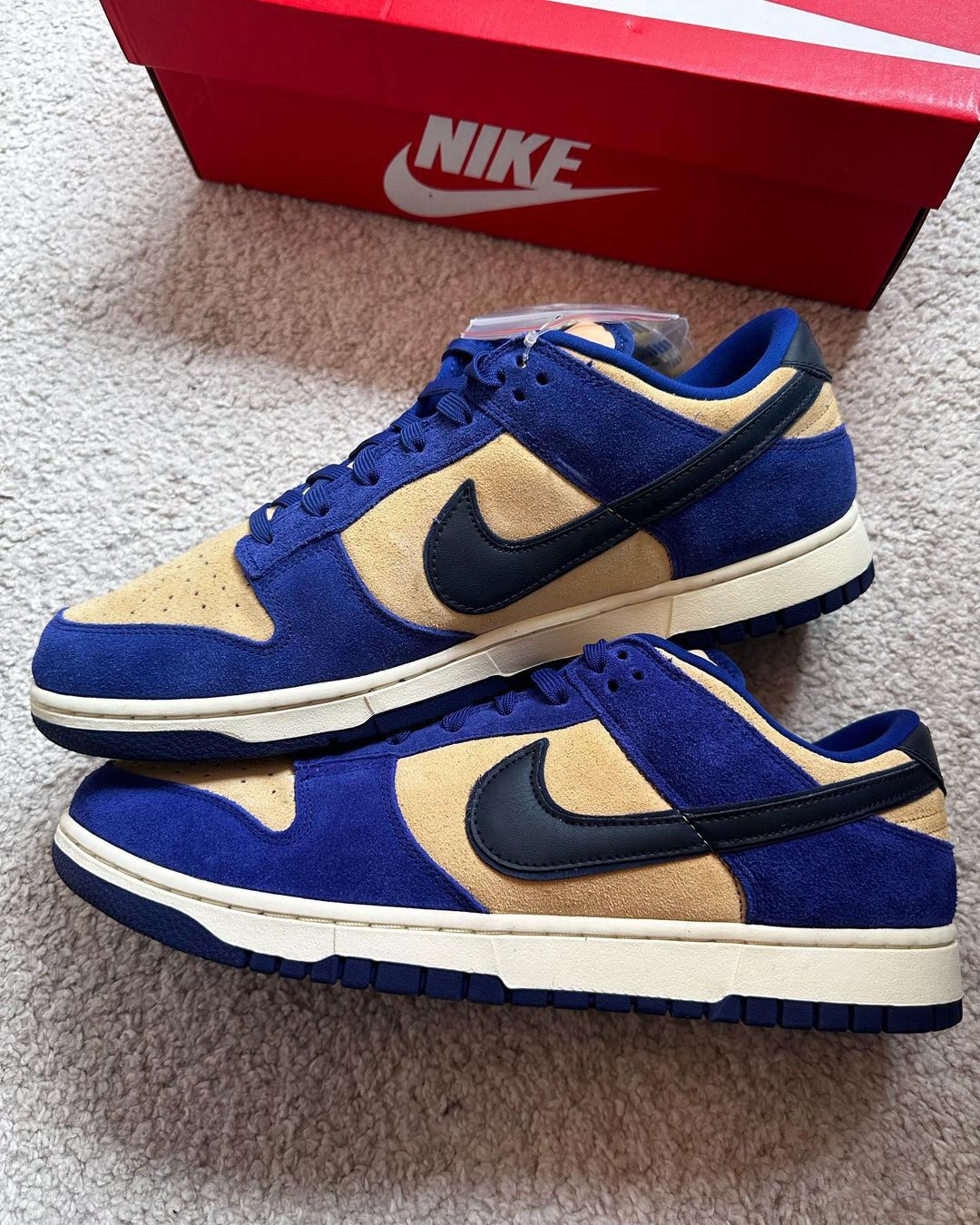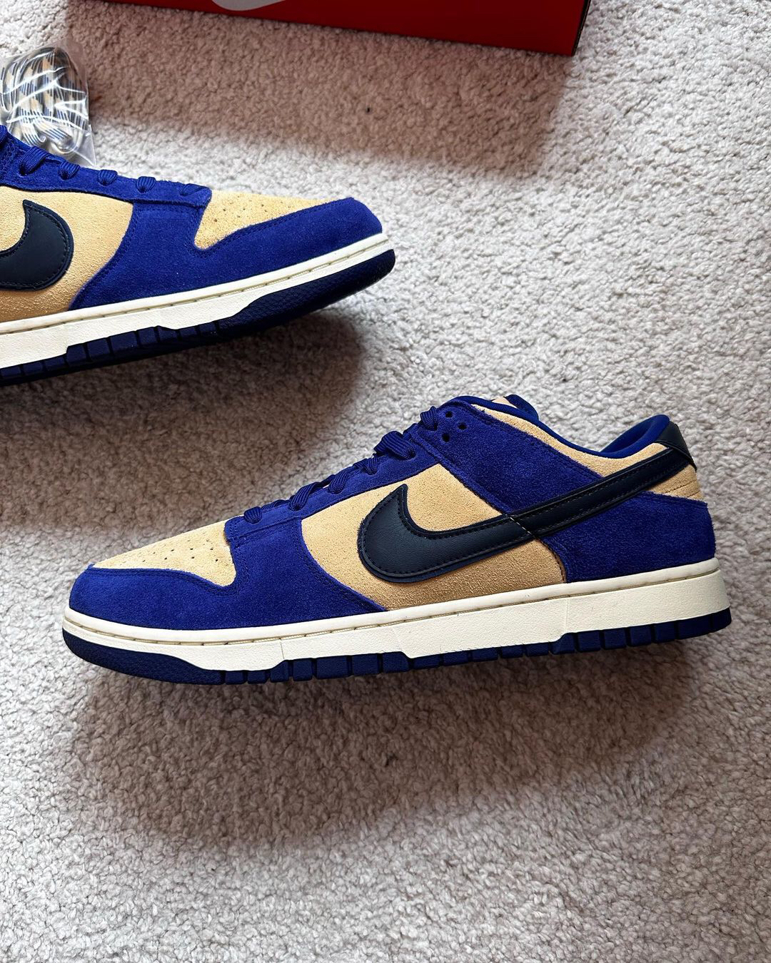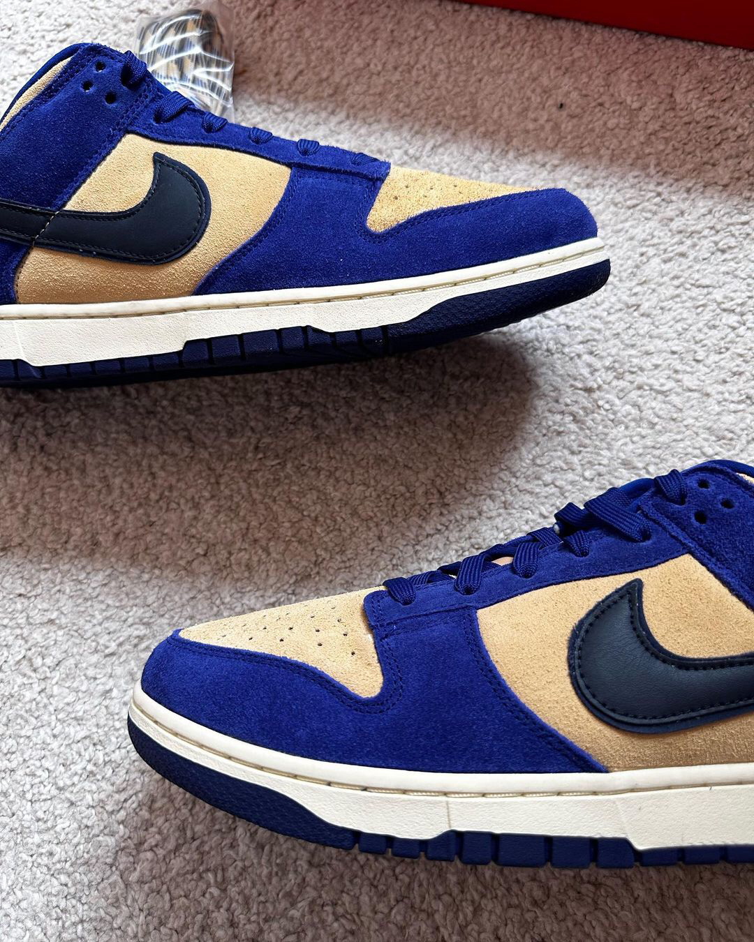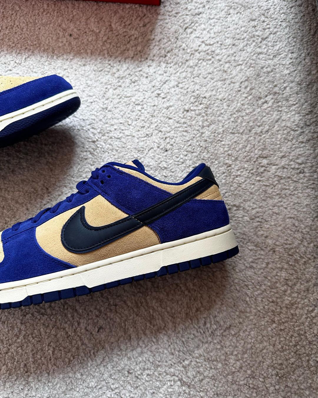 这是一双具有较高质感的低帮Dunk‼️鞋子整个鞋面都是用了麂皮材料来制作的🍎颜色选用了蓝色和浅棕色为主🔆有加入了黑色🥗从整体来看并没有很亮眼⁉️不过上手后的感觉还是很不错的🥝织物鞋舌也是确保了透气性✅白色的中底和蓝色的大底🫐使得设计完整🥦