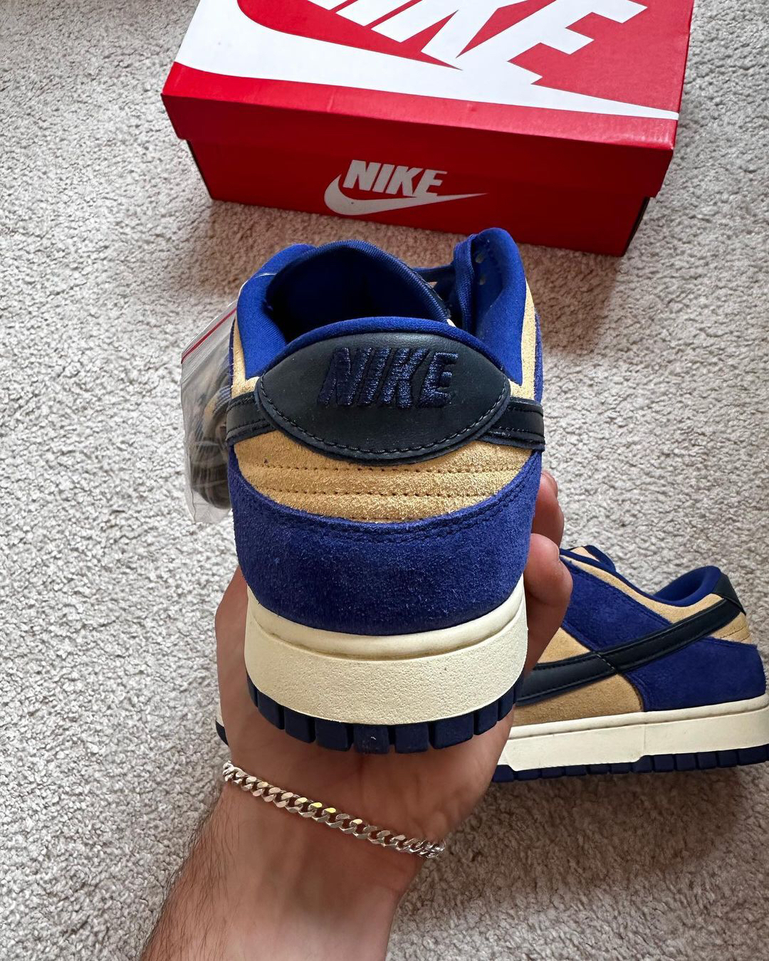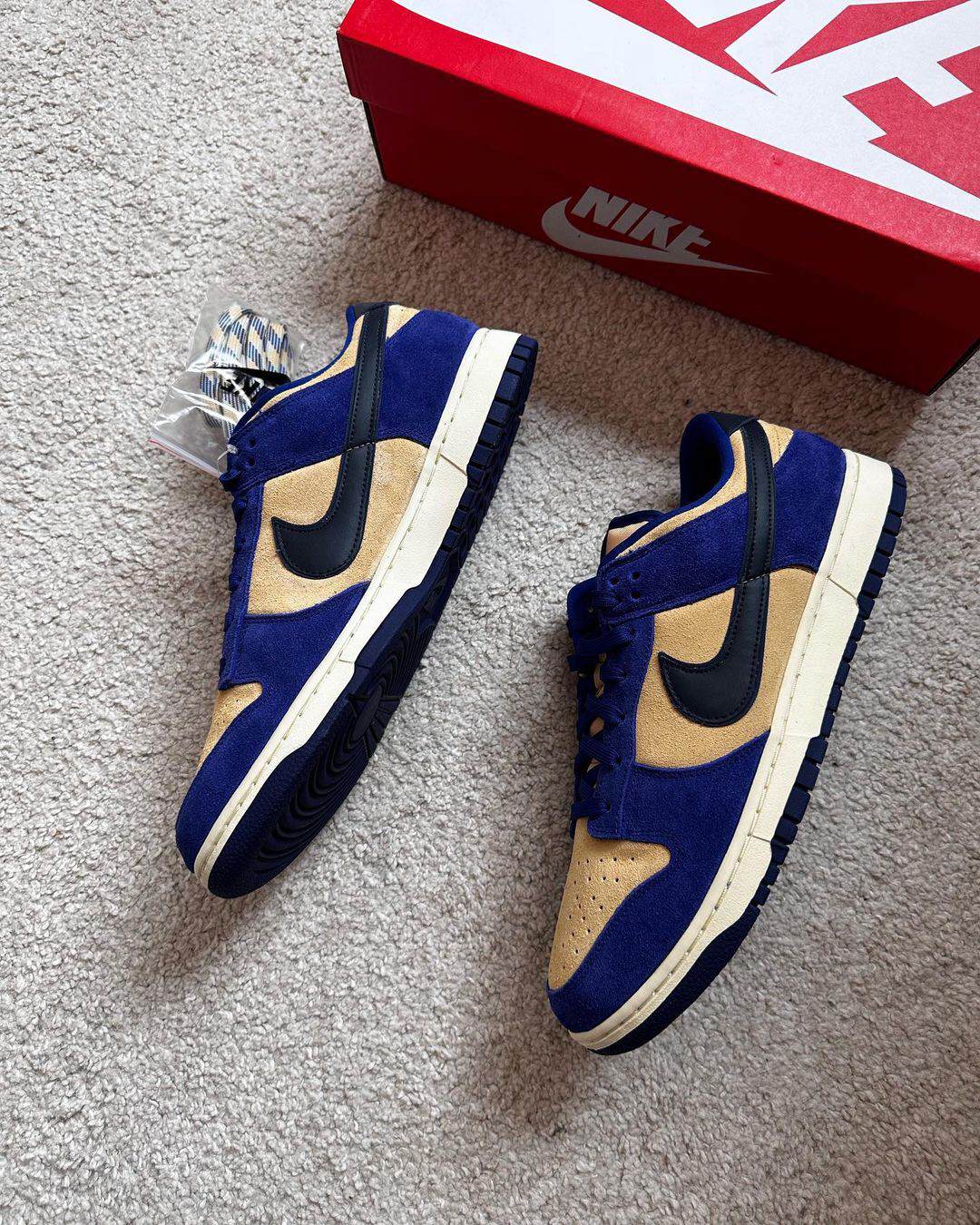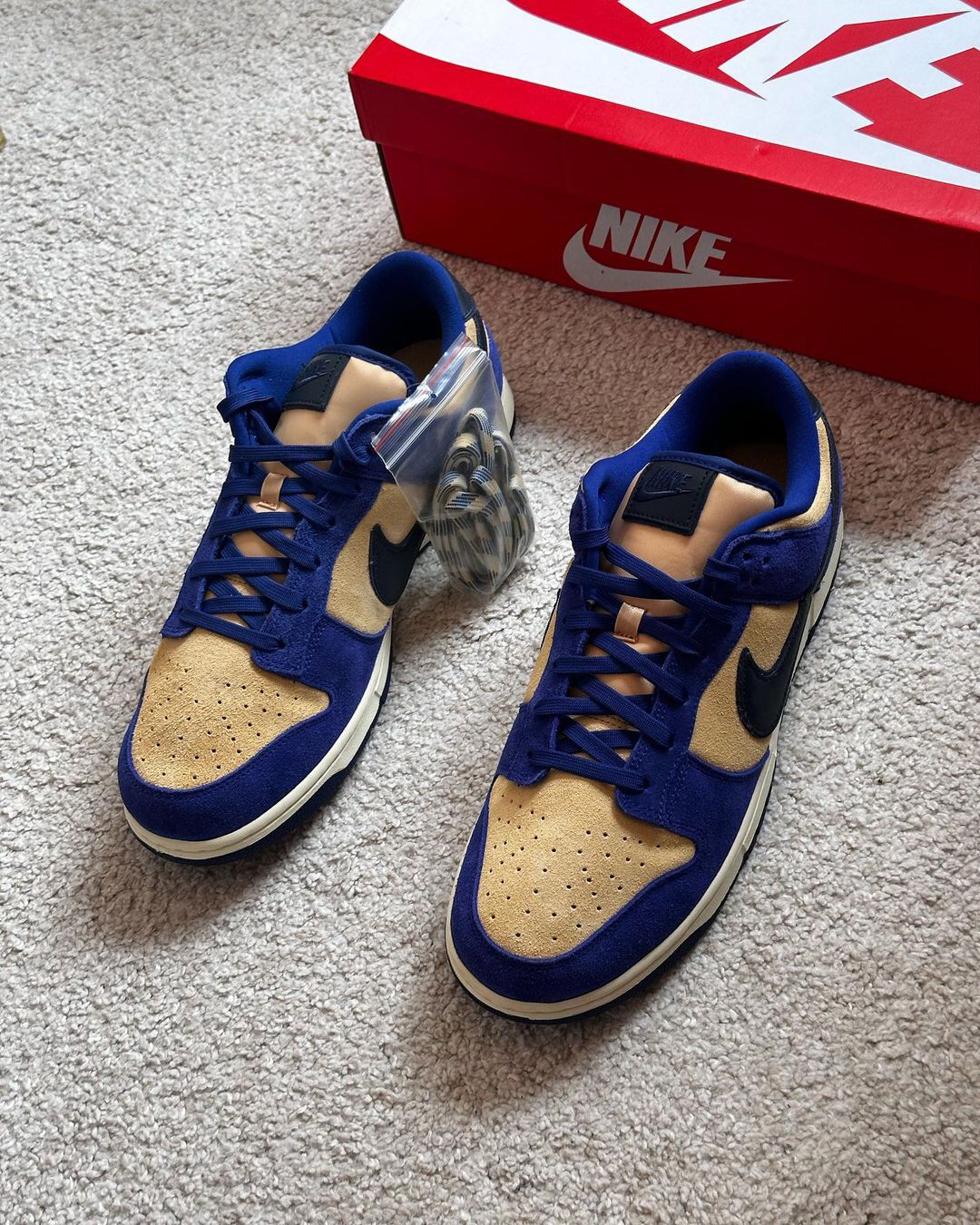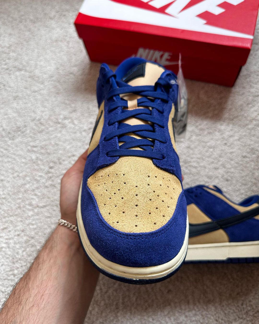 这是一双具有较高质感的低帮Dunk‼️鞋子整个鞋面都是用了麂皮材料来制作的🍎颜色选用了蓝色和浅棕色为主🔆有加入了黑色🥗从整体来看并没有很亮眼⁉️不过上手后的感觉还是很不错的🥝织物鞋舌也是确保了透气性✅白色的中底和蓝色的大底🫐使得设计完整🥦