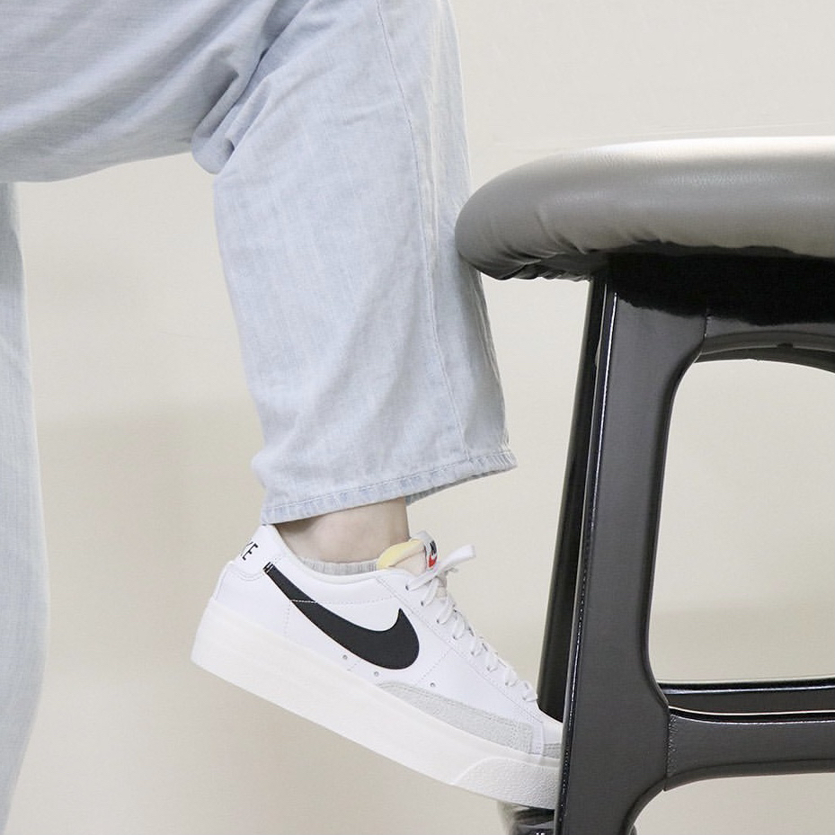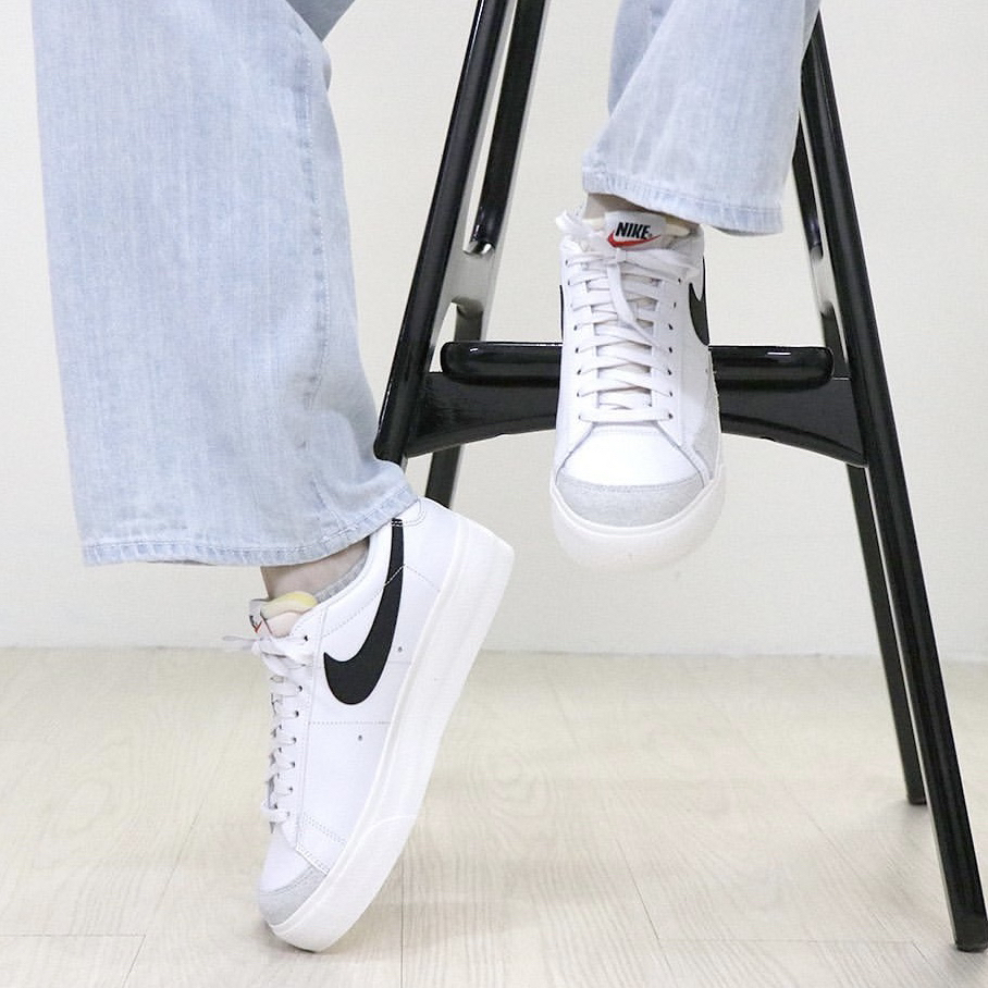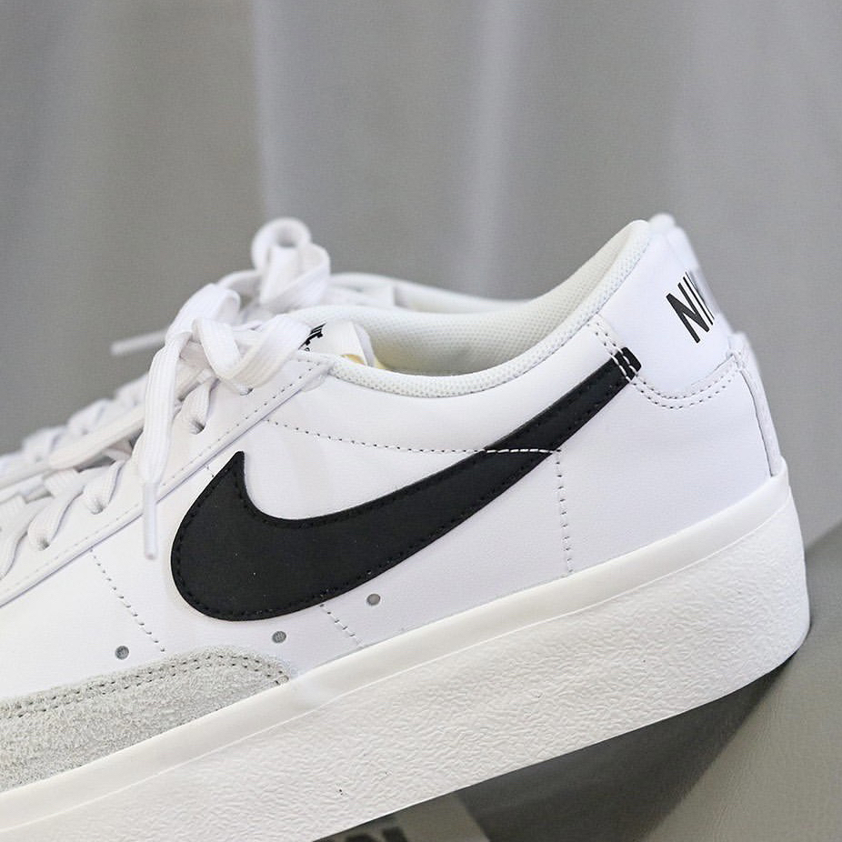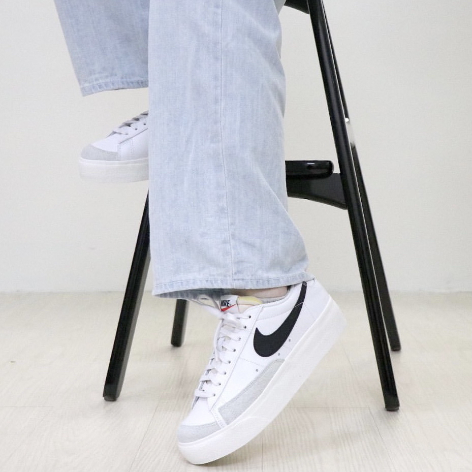鞋子名:Blazer Low Platform 黑白色 外观及细节: 这双低帮的Blazer中底进行加厚设计,所以是具备增高效果的,整体的配色很简约,以百搭的白色作为主色,黑色点缀装饰,皮革鞋面打理起来也比较容易,而且鞋头的位置又有耐磨性更好的麂皮材料,层次感也不错,swoosh logo是黑色的,造型上比较圆润复古,解构设计的鞋舌很有街头时尚感,中底是用了白色耐磨橡胶包裹。