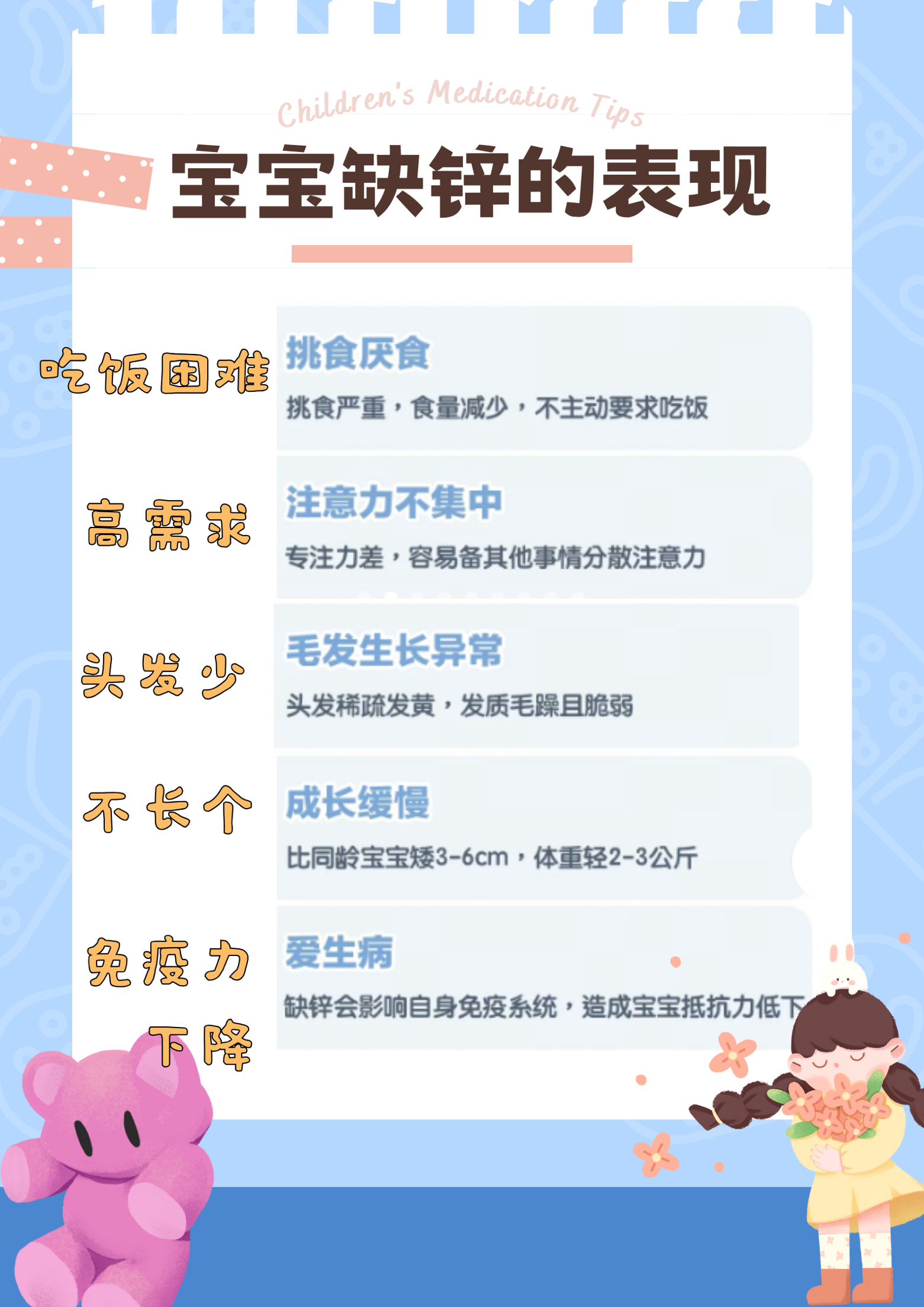 葡萄糖钙、铁、锌三效同补, 酸酸甜甜水果味 易吸收!宝贝吃饭香香!身体棒棒! ⭕️宝宝缺锌的表现 ✅锌正常:机体的生长发育,物质代谢,生殖功能,激素调节免疫功能,细胞分化,味觉形成。 ✅锌缺乏:生长发育迟缓,性发育不良,免疫力下降,诱发各种感染,认知行为改变,脑发育受损,智力减退。食欲不振,味觉异常或异食癖。 💙配方好: ✅葡萄糖酸钙+乳酸钙,双钙源升级,双重吸收效果好。💗 ✅有机钙源,钙含量高...