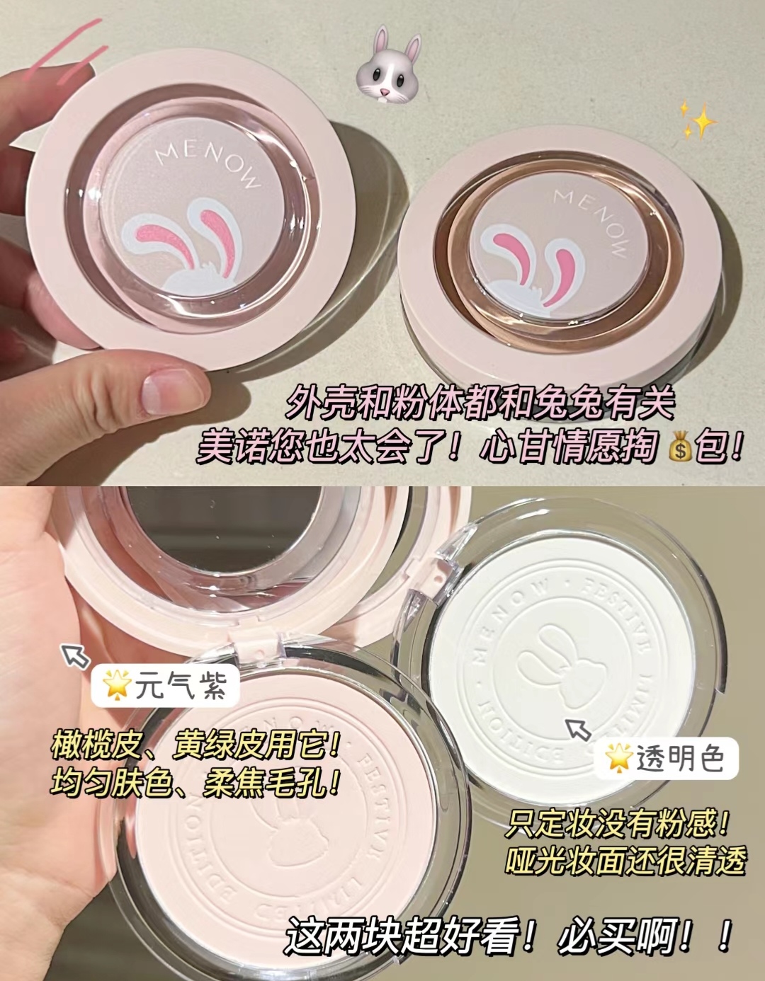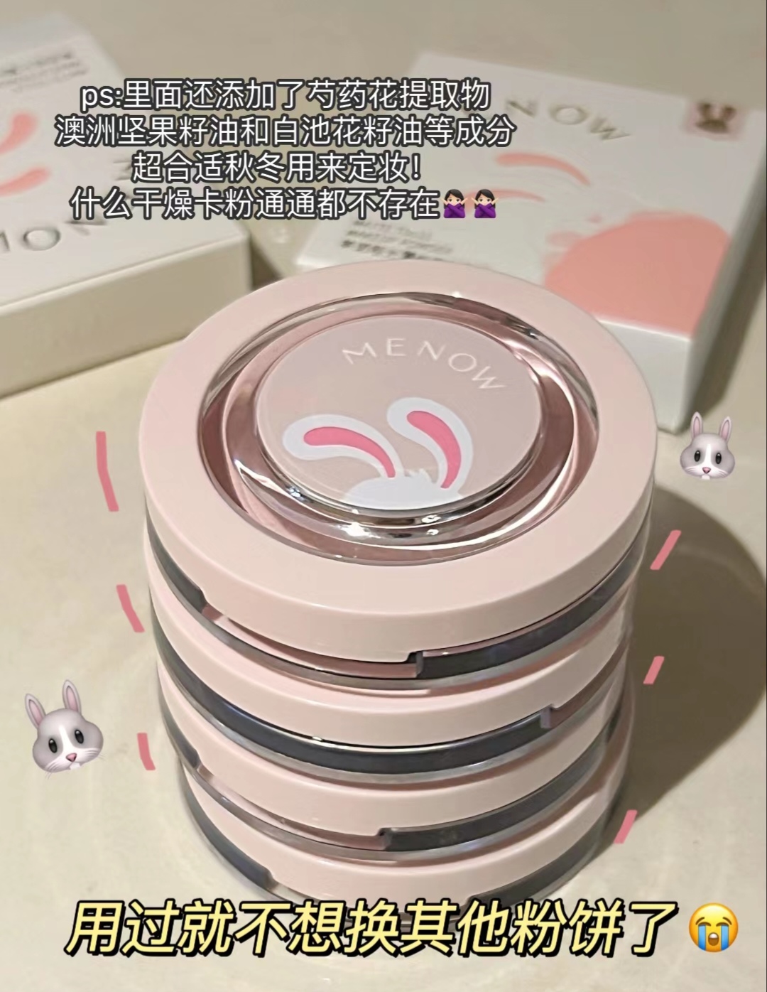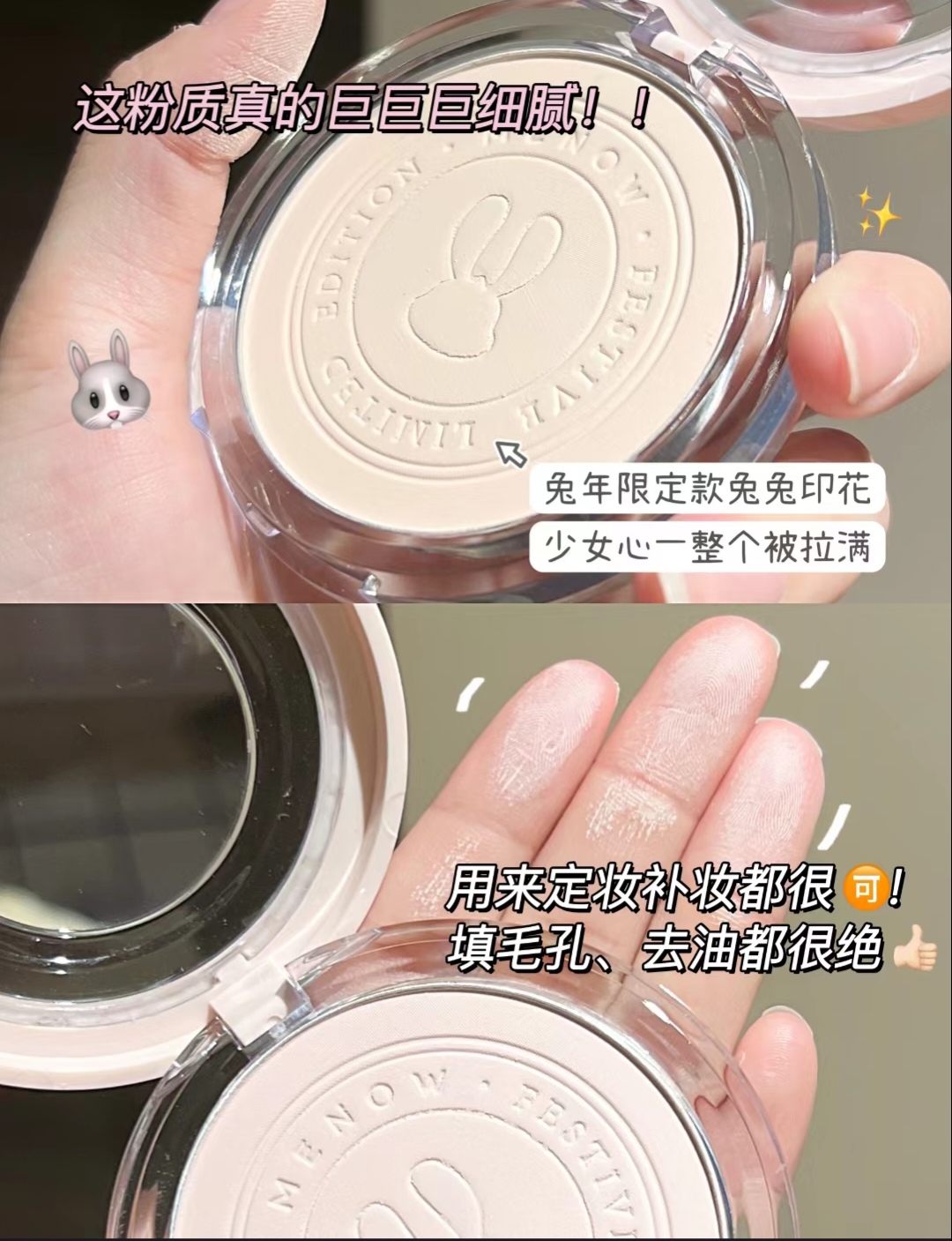 !任何一个人不知道美诺这款兔年限定款的!我都会伤心的 ok ?? 我身边的闺蜜几乎人手一块了… 我自己也回购它家的粉饼三年了…毕竟吃油吃的嘎嘎猛,而且平价又好用!轻松 get 柔焦妆感谁不爱啊!!!甚至超越了我手头上大几百粉饼的妆感!特别是看到这个爆可爱的兔年限定款本颜控直接闭眼全部 all in !!! 美诺兔子粉饼!妥妥的国货之光! 要知道!秋冬底妆对油皮来说! 就是一整个灾难现场 不做好定妆...
