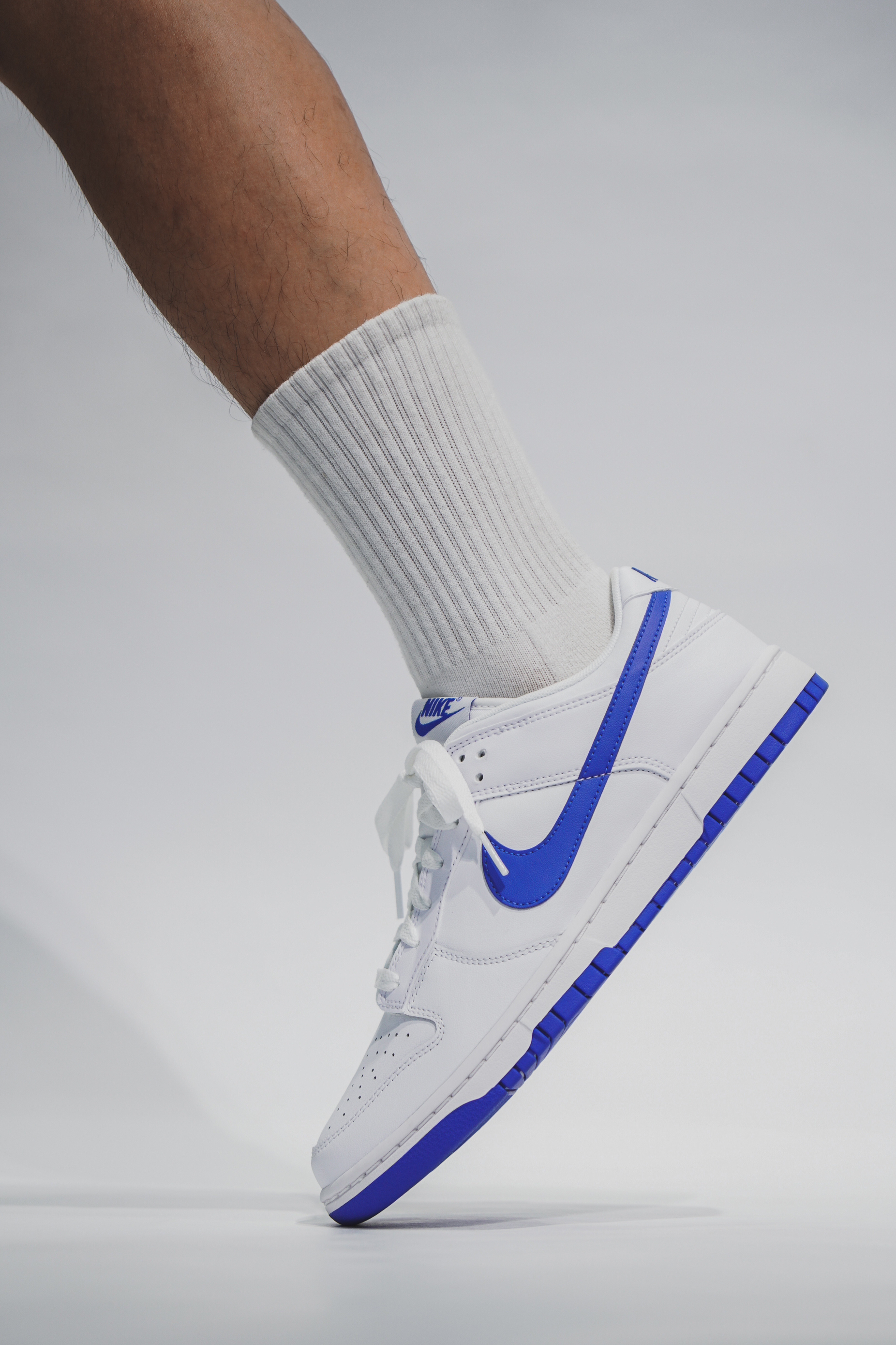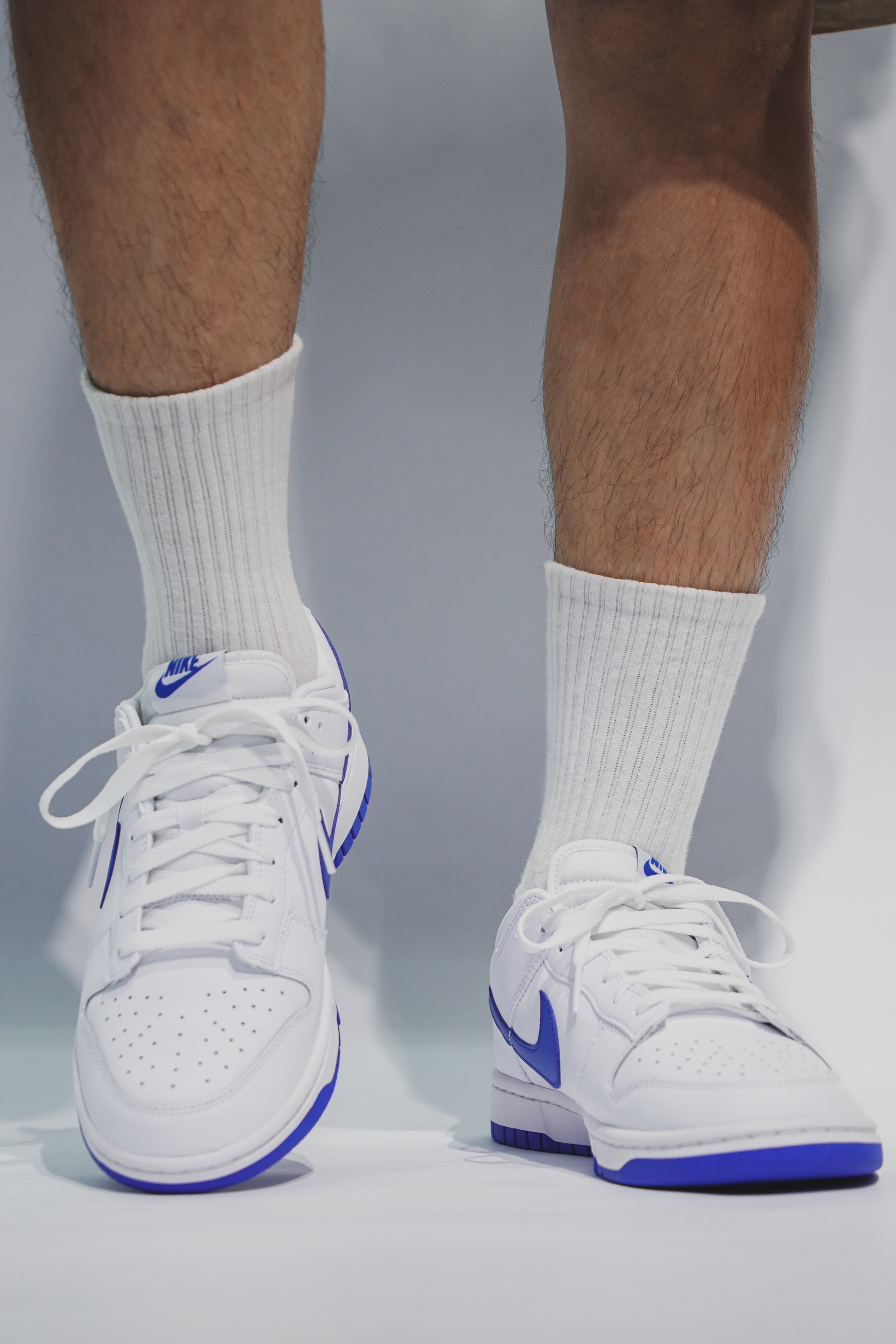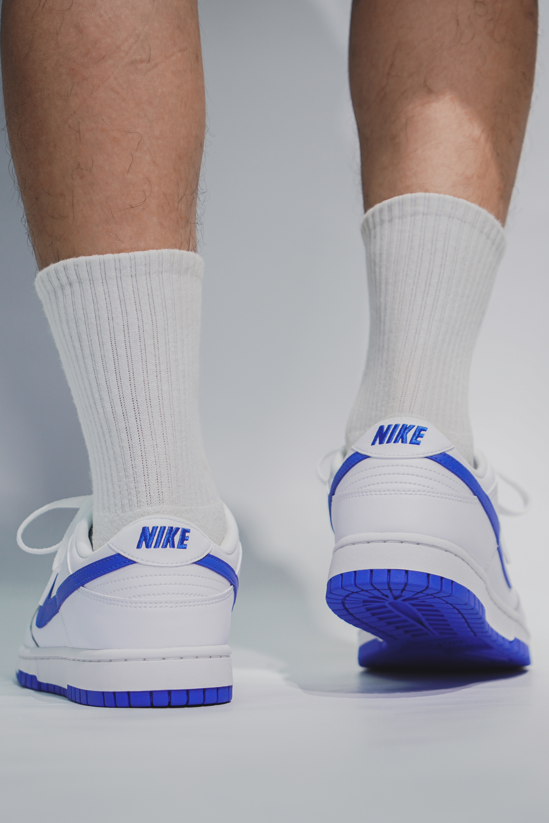 该款全新配色的 Nike Dunk Low Hyper Royal,整双鞋在配色设计上十分简单,整体选用白色皮革,之后在鞋舌绣标和鞋尾位置融入蓝色点缀,与此同时,鞋侧 Swoosh 和外底同样辅以蓝色,完成整体设计。 虽然看似简单,但是由于它的配色设计与先前藤原浩上脚的 Fragment x Travis Scott x Air Jordan 1 Low OG 十分相似,引起大家的关注!