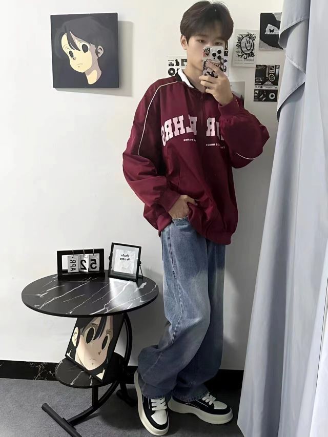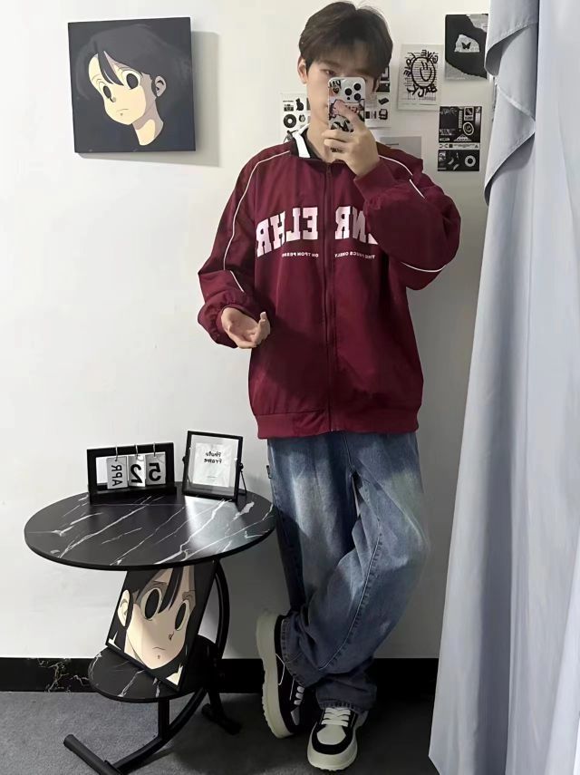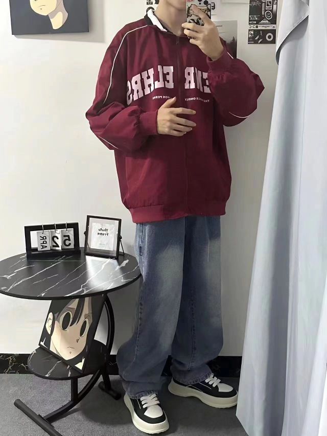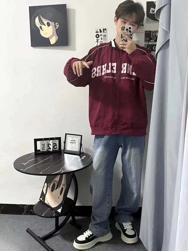 美式少年穿搭 酒红色复古夹克,白色字母和线条点缀,一键搞定美式复古穿搭 蓝色渐变牛仔裤,直筒的设计,显腿长,面料舒适版型好 穿搭黑白拼接休闲板鞋,穿搭舒适,还有小增高 一套美式复古阳光少年穿搭来咯