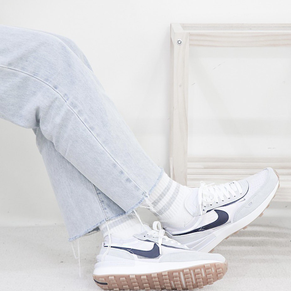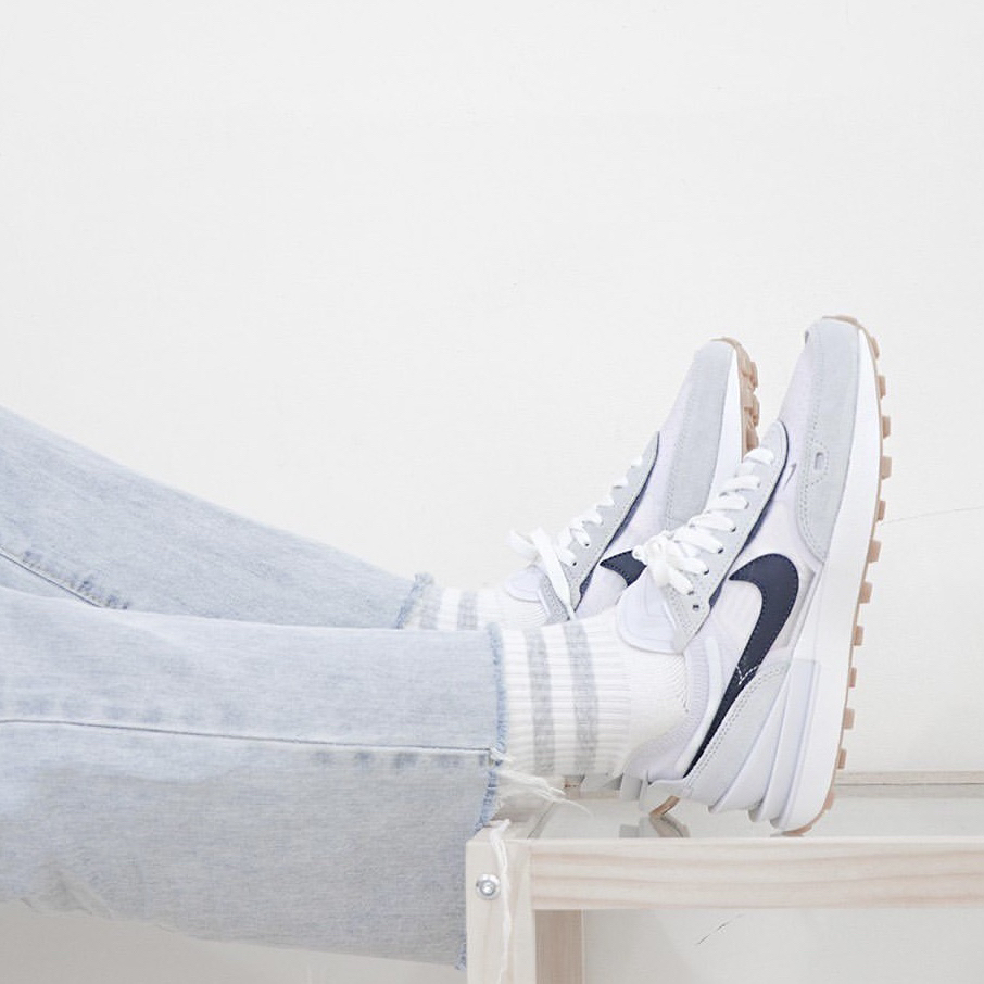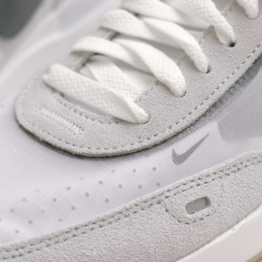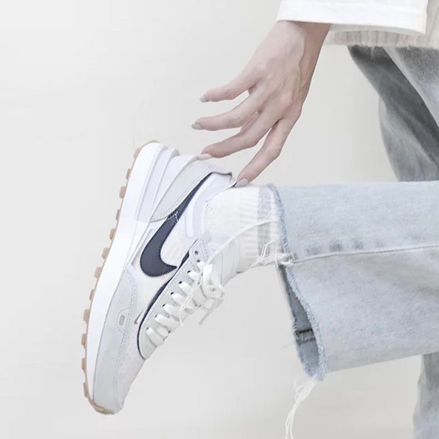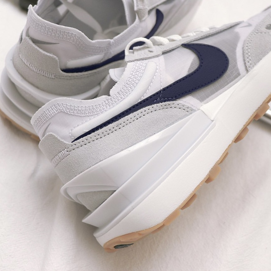 鞋名:Waffle One 灰色 外观及细节: 这是一双经典复古的华夫鞋,鞋子的颜色还是具有百搭性的,用了灰麂皮和半透明的蝉翼材料来制作鞋面,swoosh logo用了深海军蓝色,后跟上镶嵌了类似sacai多层后跟设计的TPU框架,不仅使鞋子稳定性增强并且又使鞋子很有时尚感,中底是缓震泡棉,大底是生胶材料制作的华夫格大底,鞋子复古感又增加了,在夏日的复古穿搭中更是吸睛。
