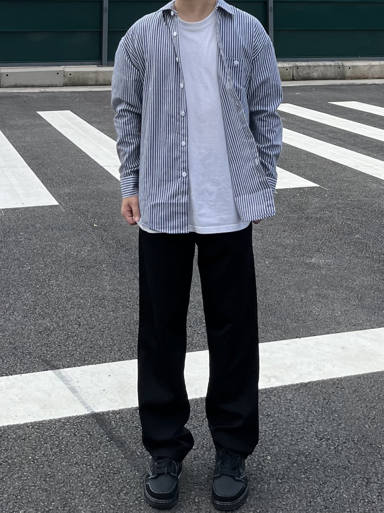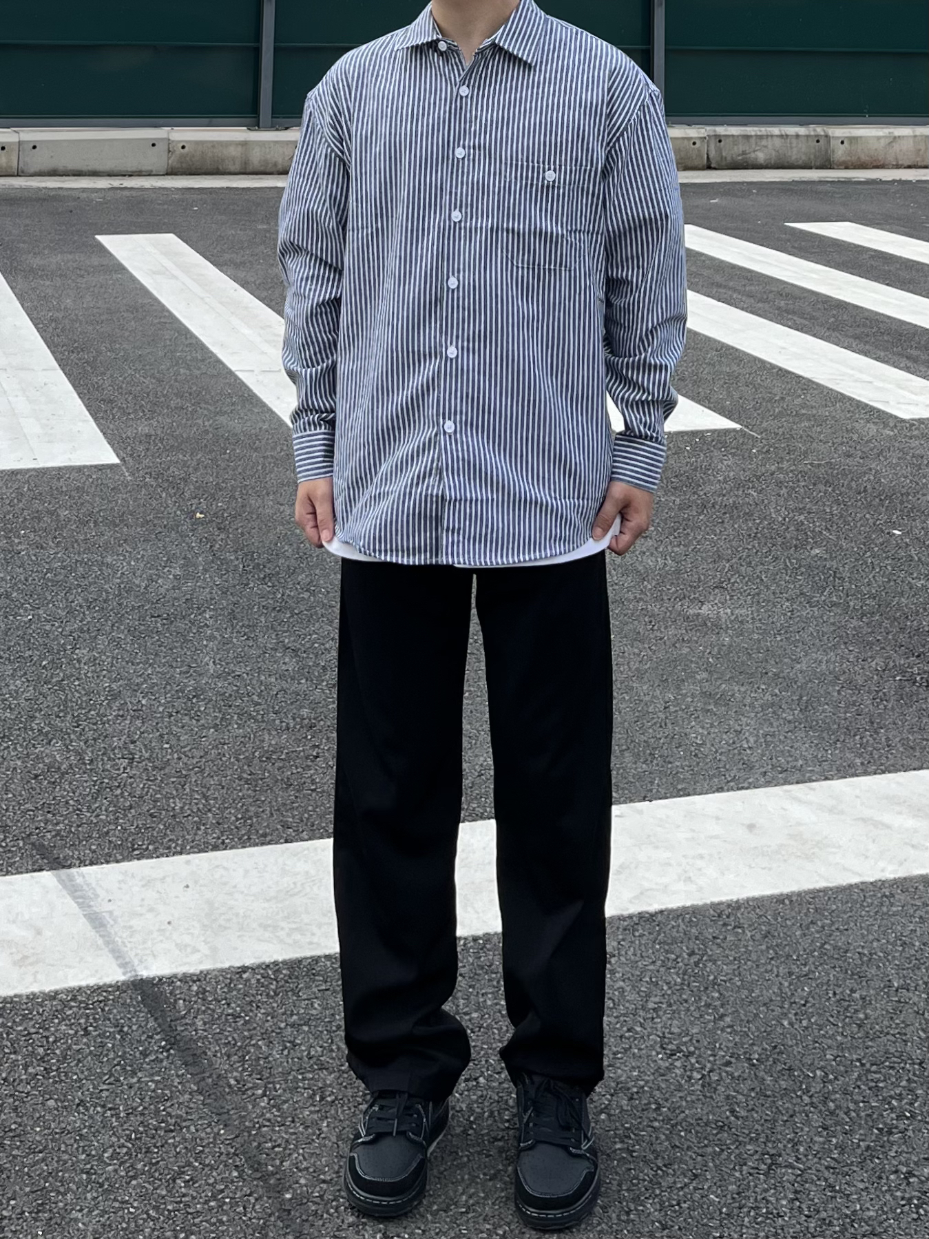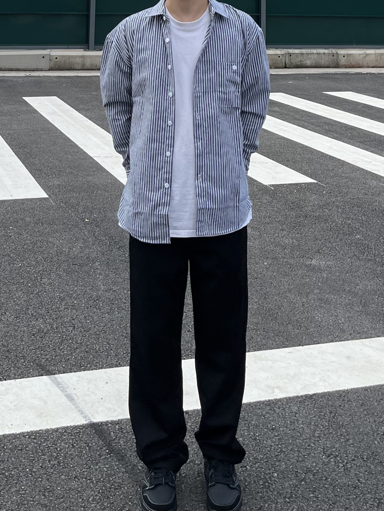 -今日穿搭分享🤓 ——————————— 🙋🏻♂️:170 / 110 · 👔:COMOWA复古条纹工装衬衫👕 男生怎么穿?可以尝试穿得日系街头出门,回头率百分百高✌️打底白t外搭蓝色条纹长袖衬衫 下半身搭配休闲西裤 然后搭配黑色板鞋整套搭配宽松舒适 日系街头感十足✔️ · 👖:休闲西裤 · 👟:BLACK/Phantom 黑武士倒钩⚫️⚪️ ———————————— -以上都是个人观点🥝欢...