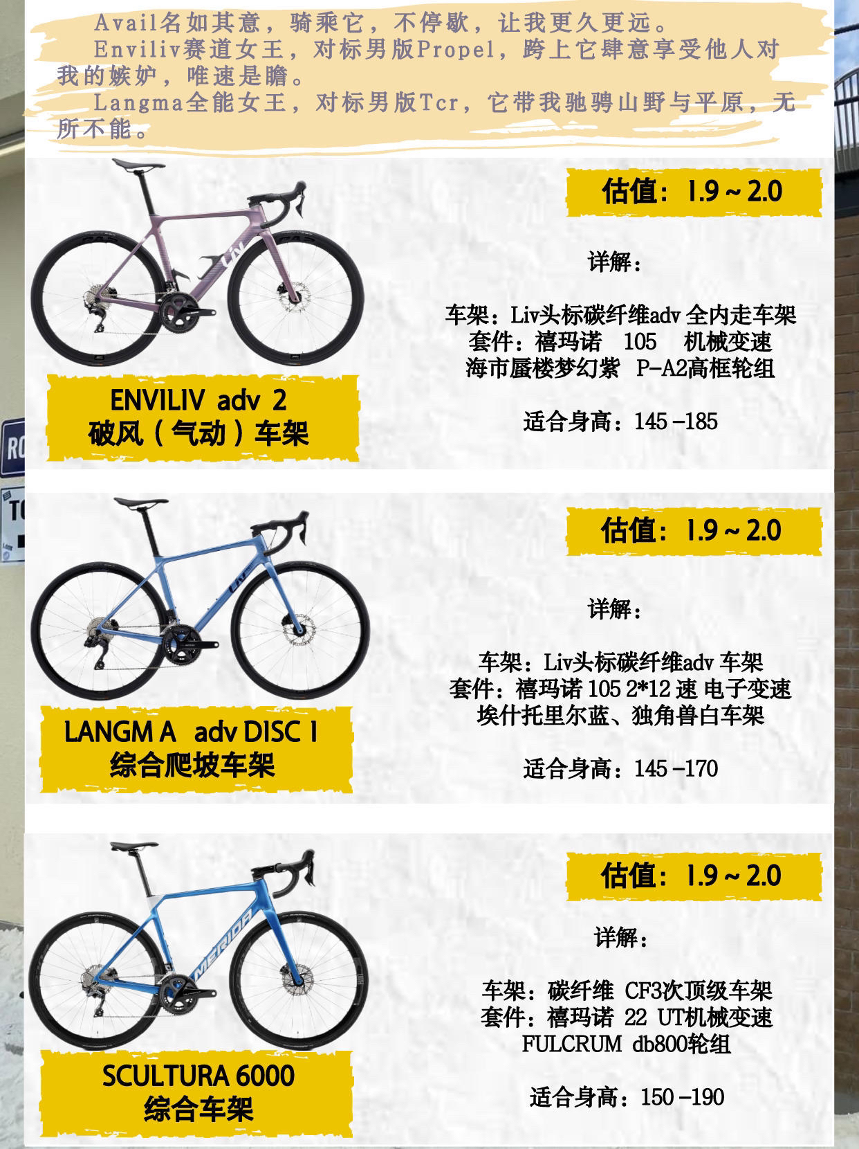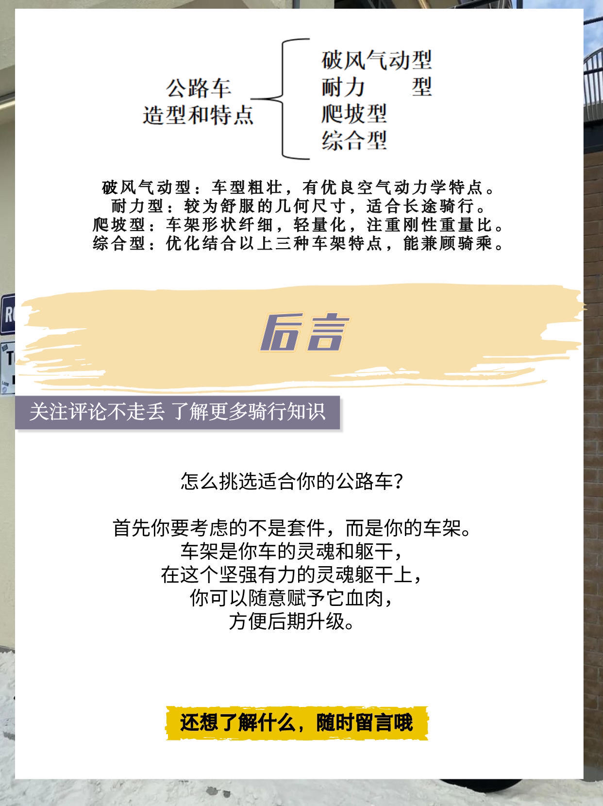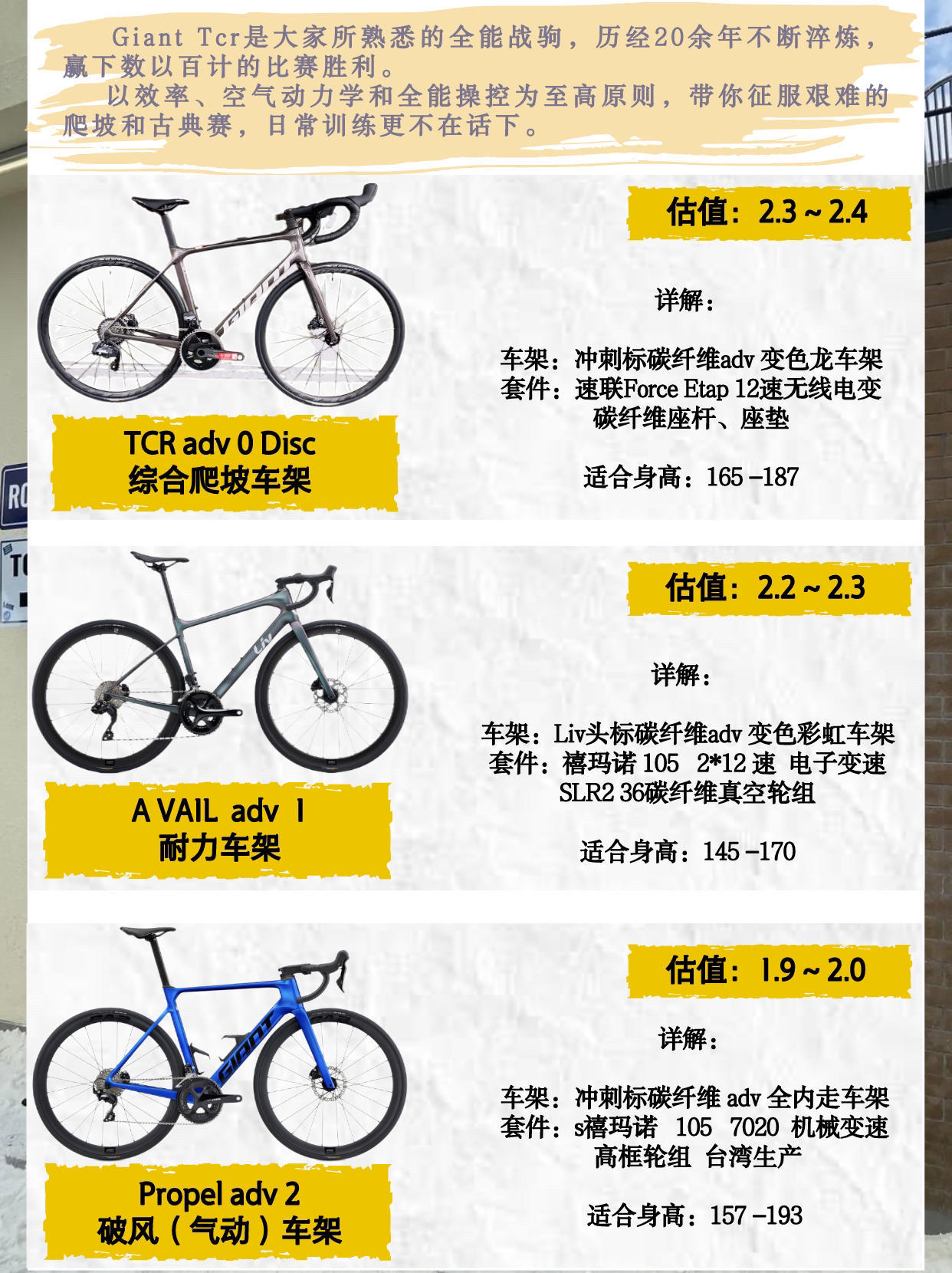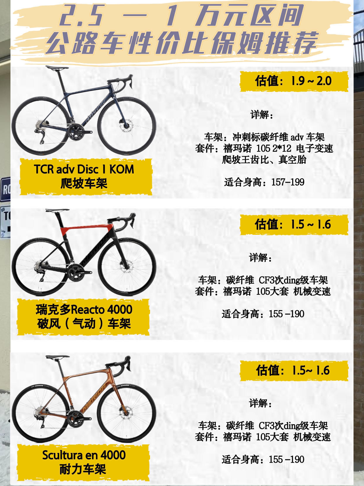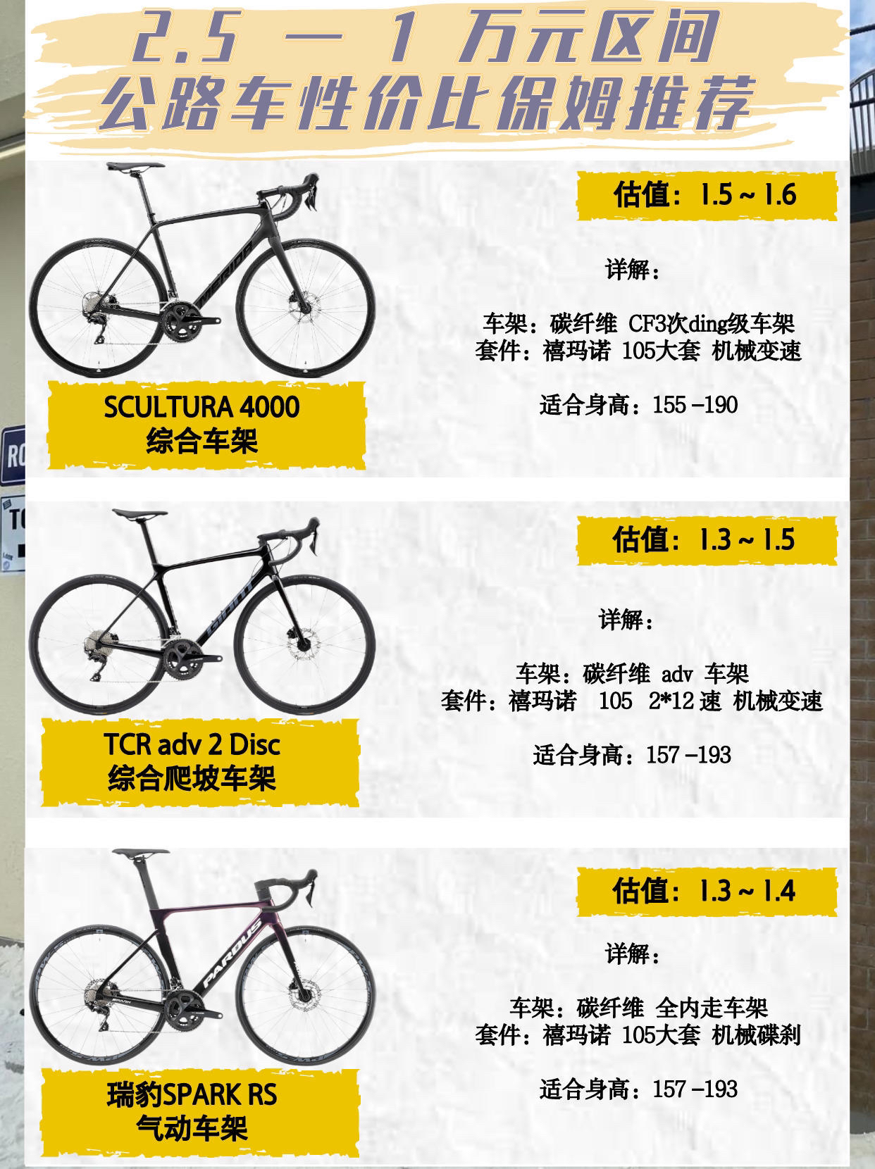 🤔2万元左右的公路车🚴已经有非常高的配置水平 🤔这个阶段一般会使用碳纤维车架、座杆或者一体把,搭配禧玛诺、速联中G端套件来进行整车销售💸,这个组合已经能用来进行G强度训练和比赛🏆了。 - 1️⃣怎么挑选适合自己的1-2.5万的公路车? 📑首先明确自己想要的是什么车架,次而是套件,Z后是品牌。 🚲车架是灵魂躯干,我们可以赋予它强大的血肉能力,后期磨损也可以随时更换或者升级。 - 2️⃣了解一款车...