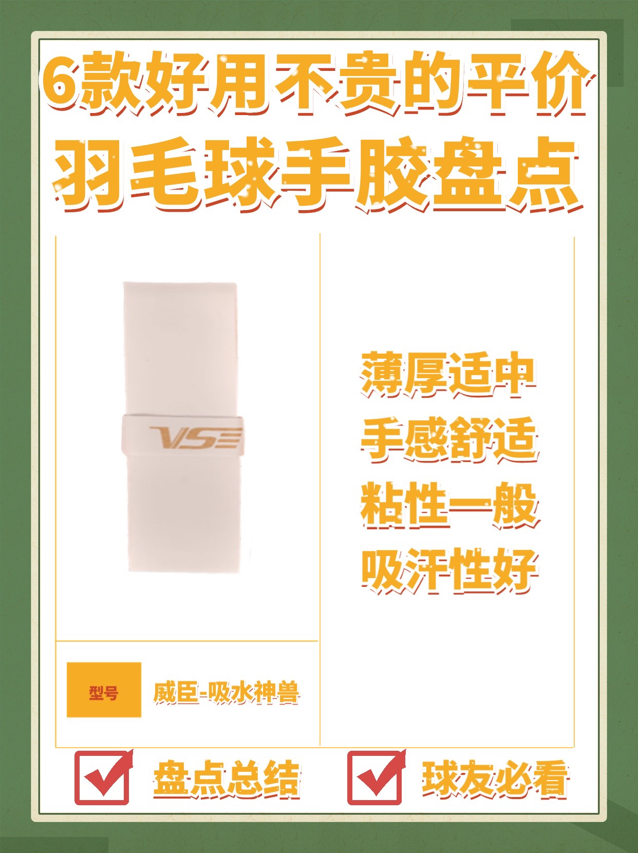本篇笔记关联了VENSON/威臣 吸水神兽 羽毛球拍 止滑 手感 握把胶 粘性 吸汗 缠绕 防滑舒适 平面皮胶 手胶 VG555 混色等商品,为用户提供真实的使用体验和购买参考。