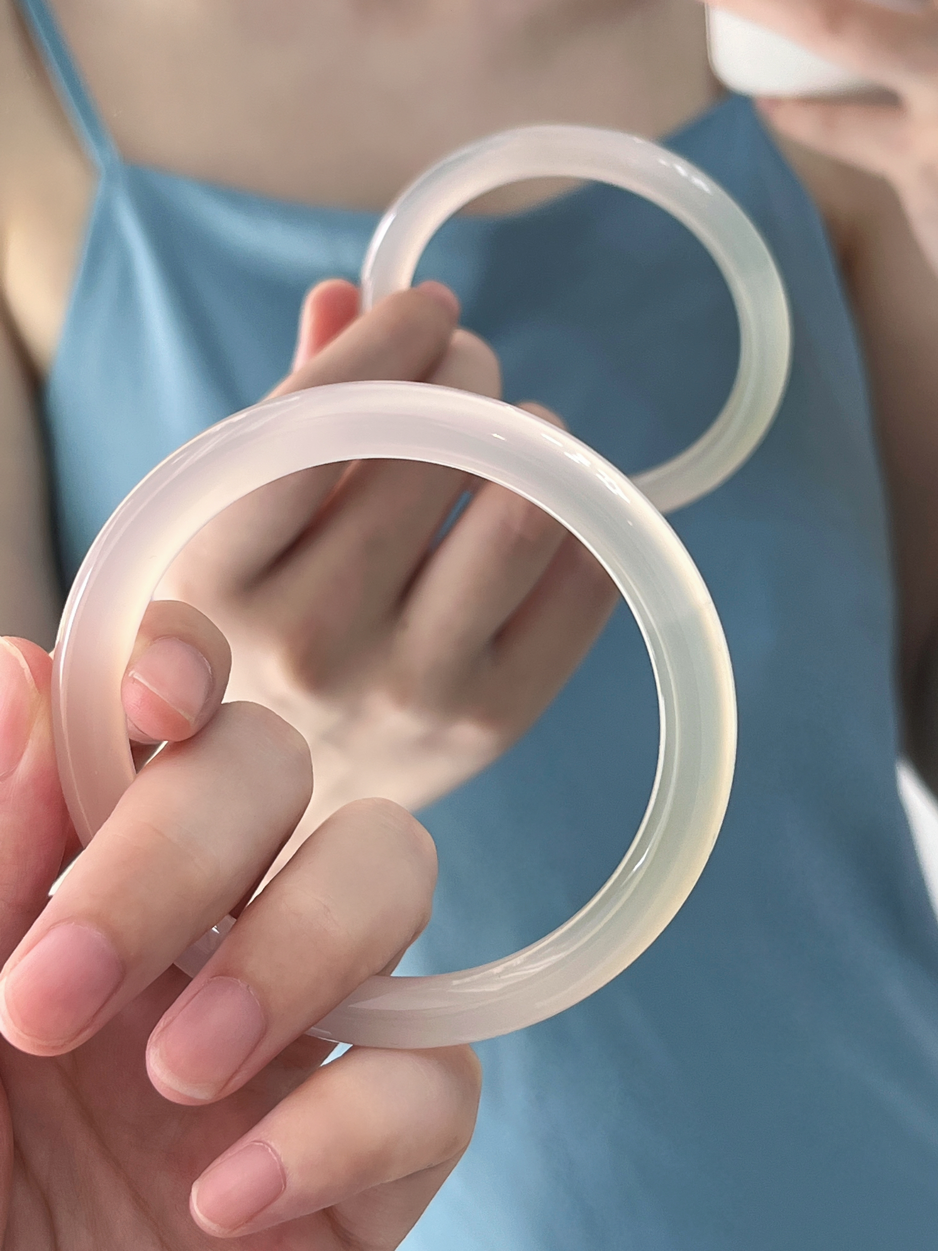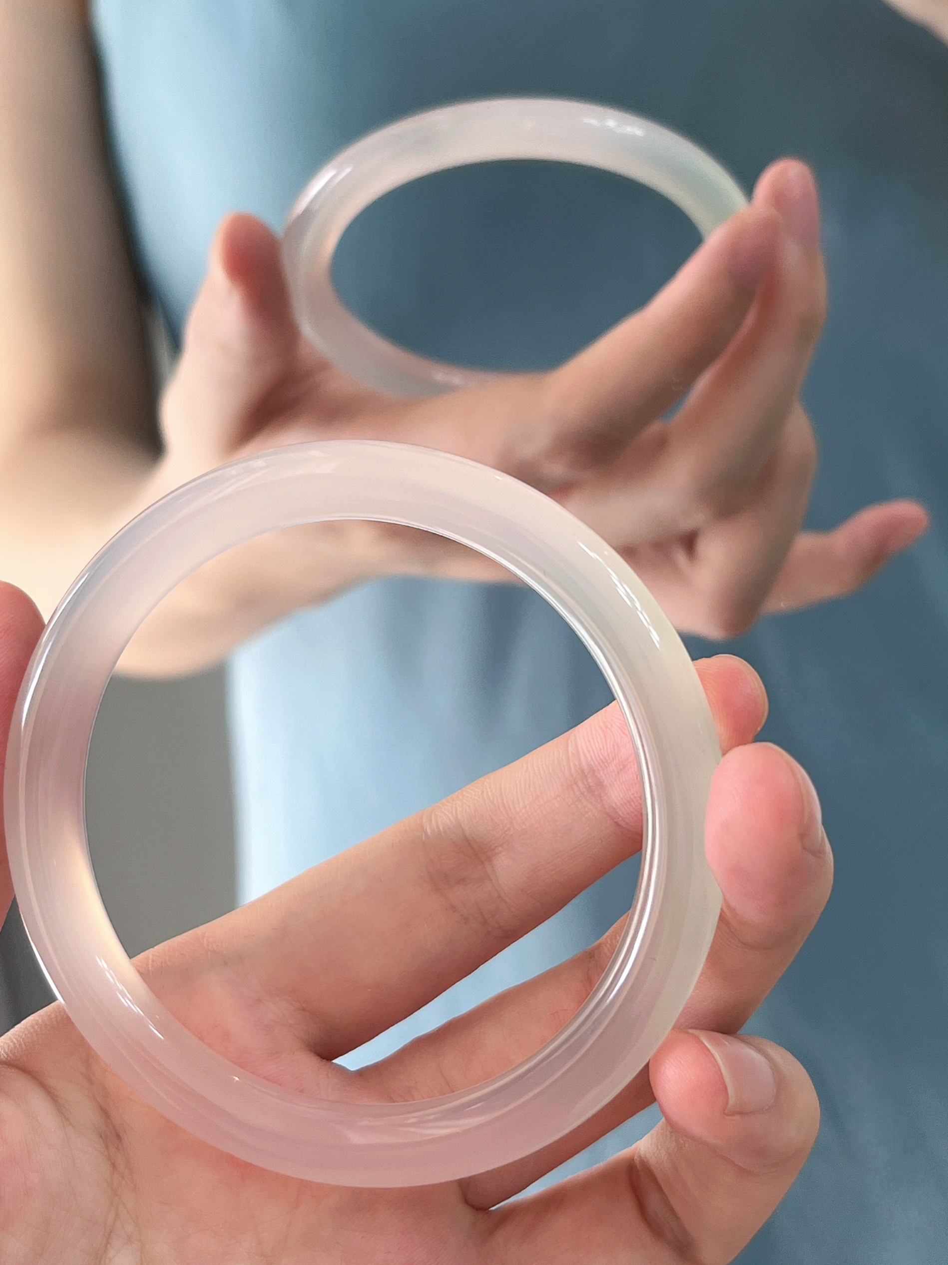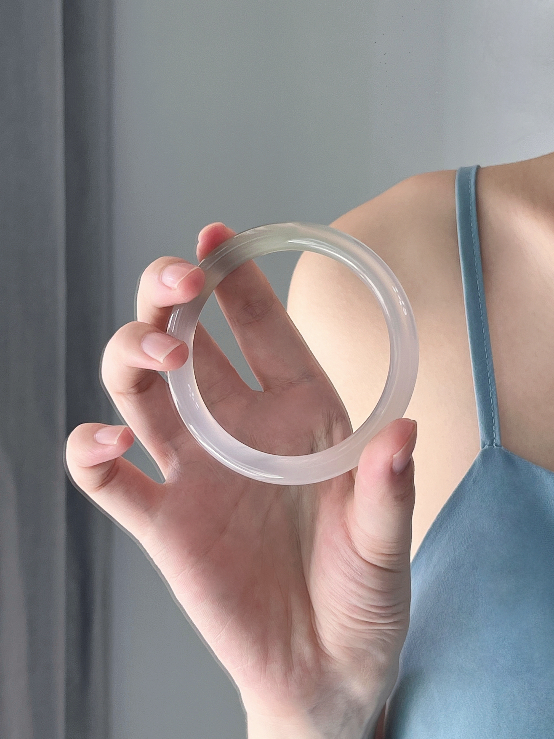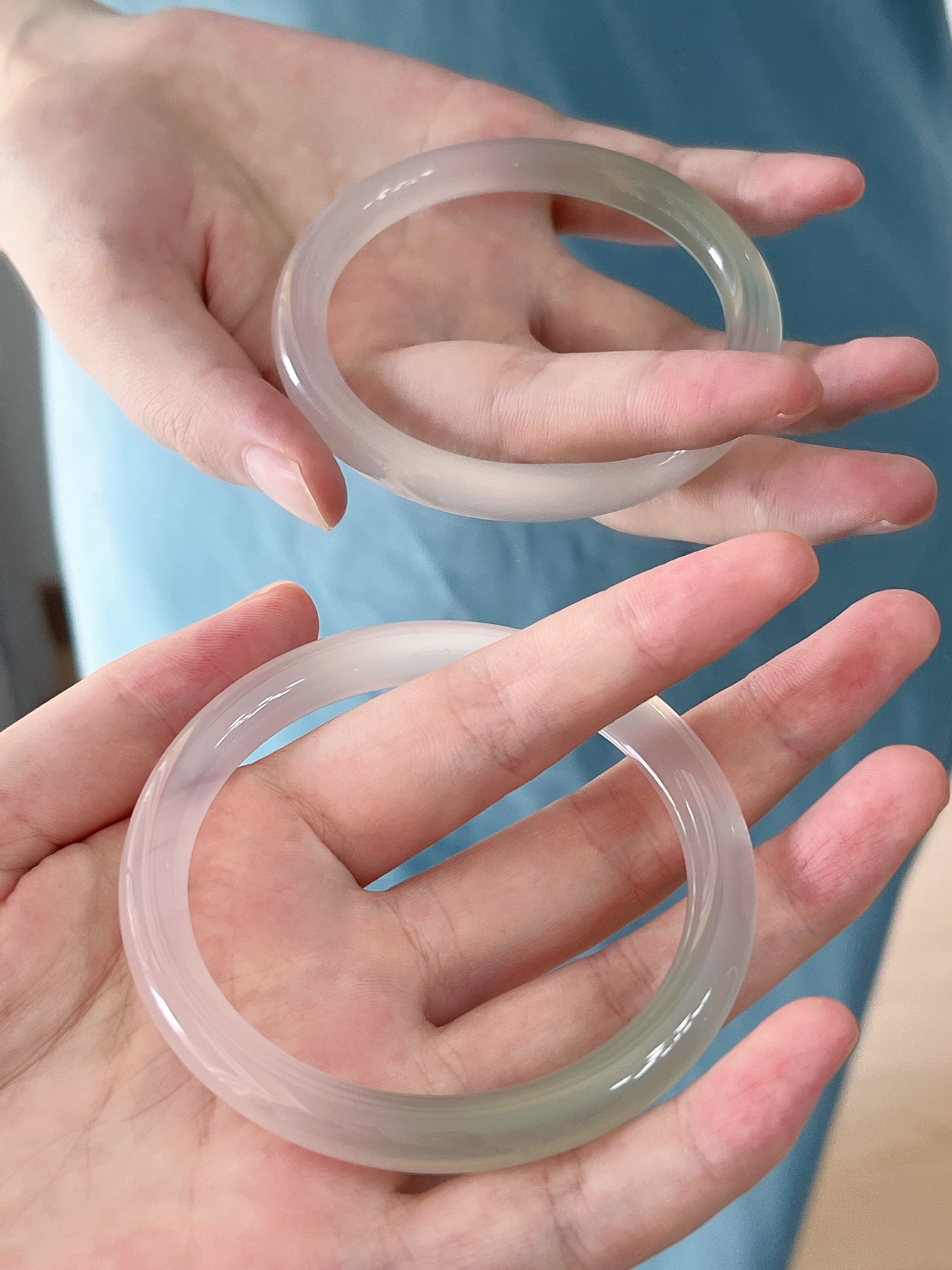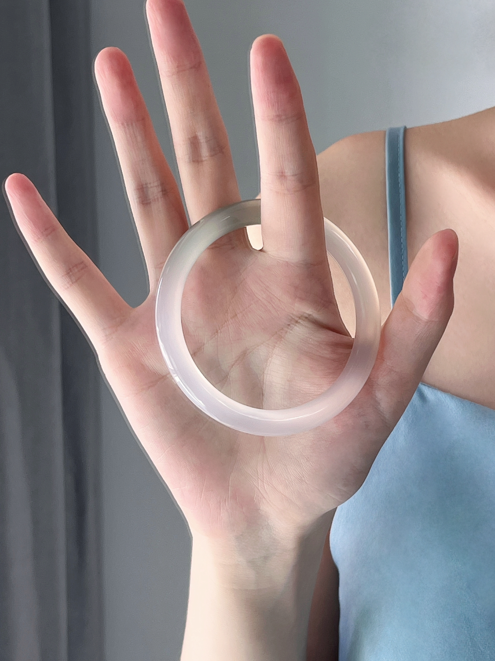 冰冰透透的玉髓手镯 是清新的淡绿色 佩戴在手上 举手投足间 有种岁月静好的美感 连肌肤都变得白皙了不少 有山水画的灵动感 超有意境 汉服旗袍能搭 日常服装也能搭配~