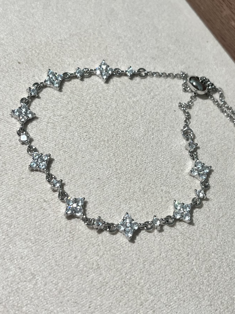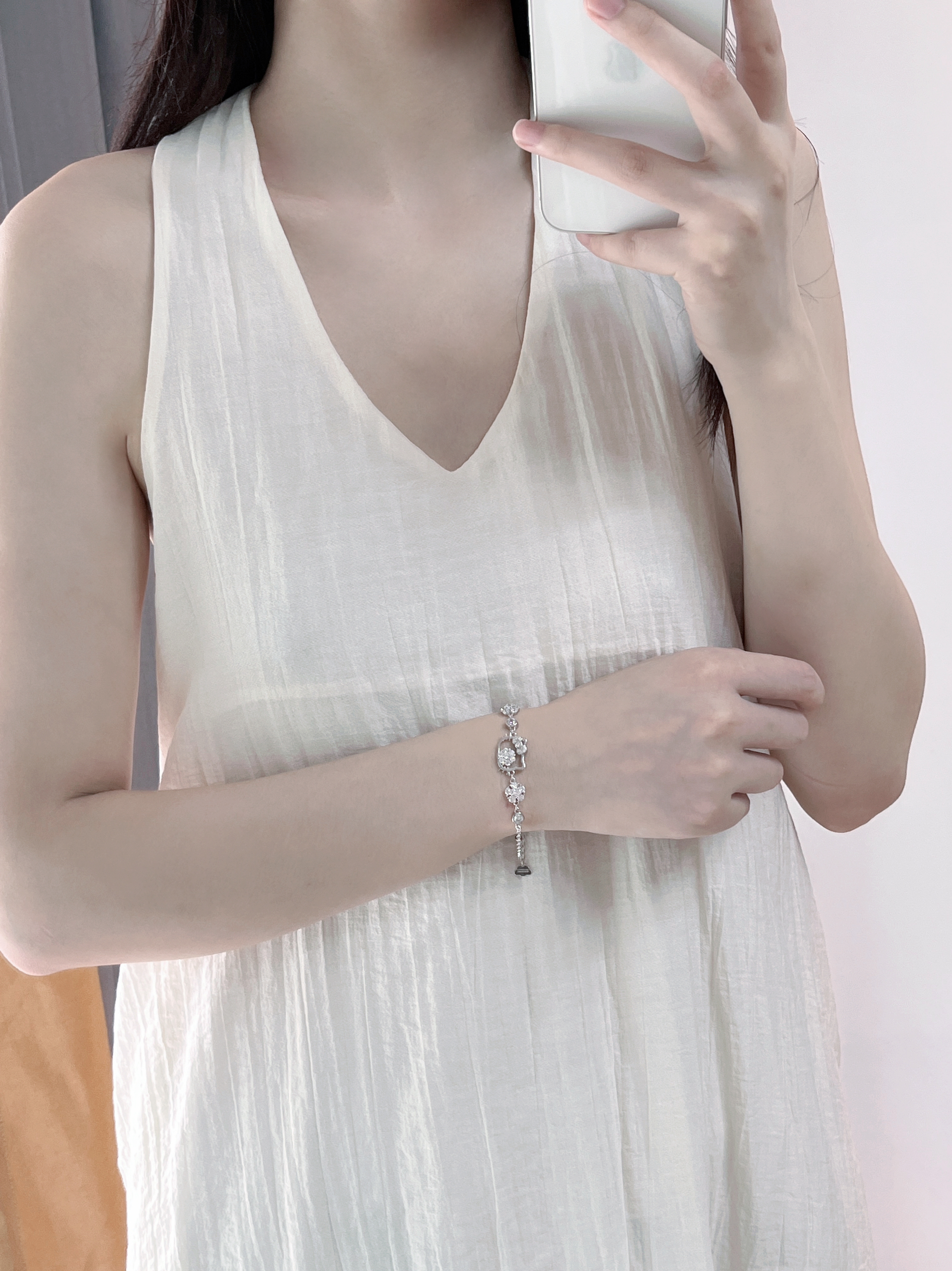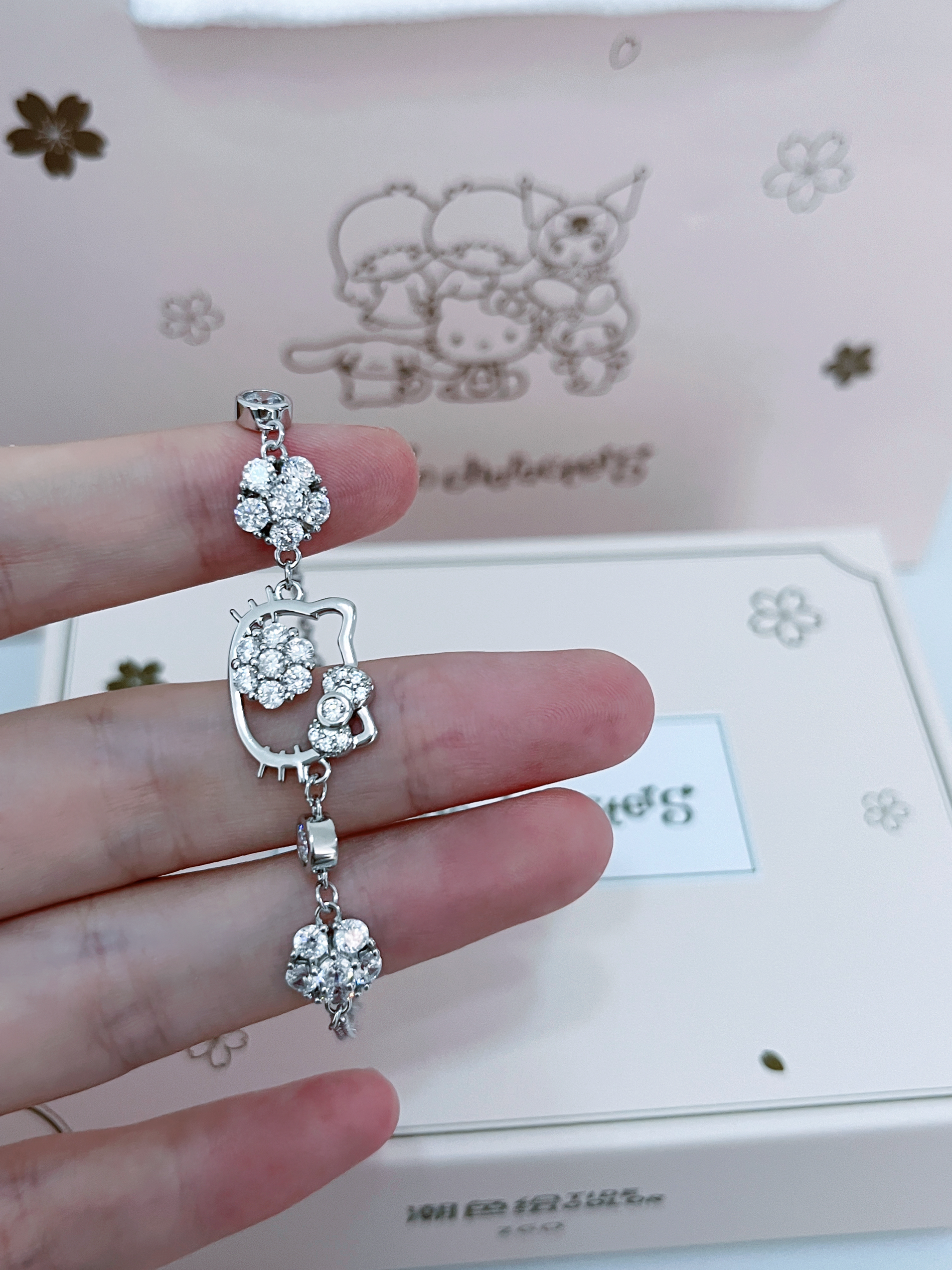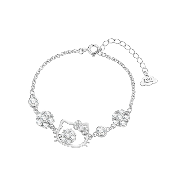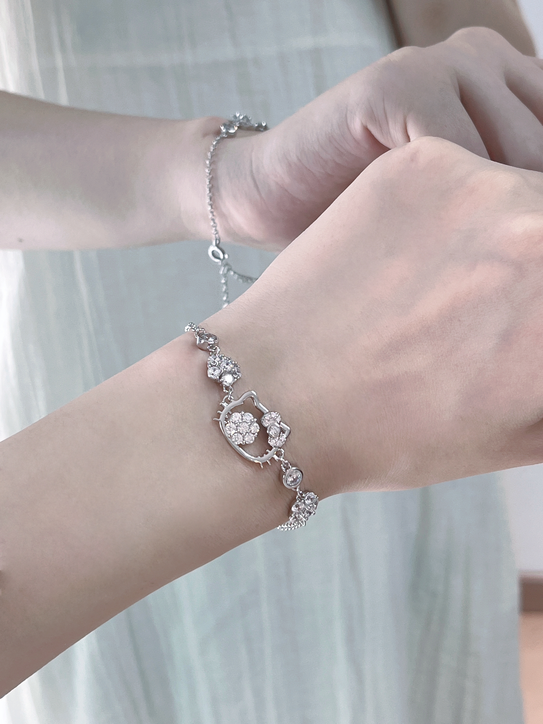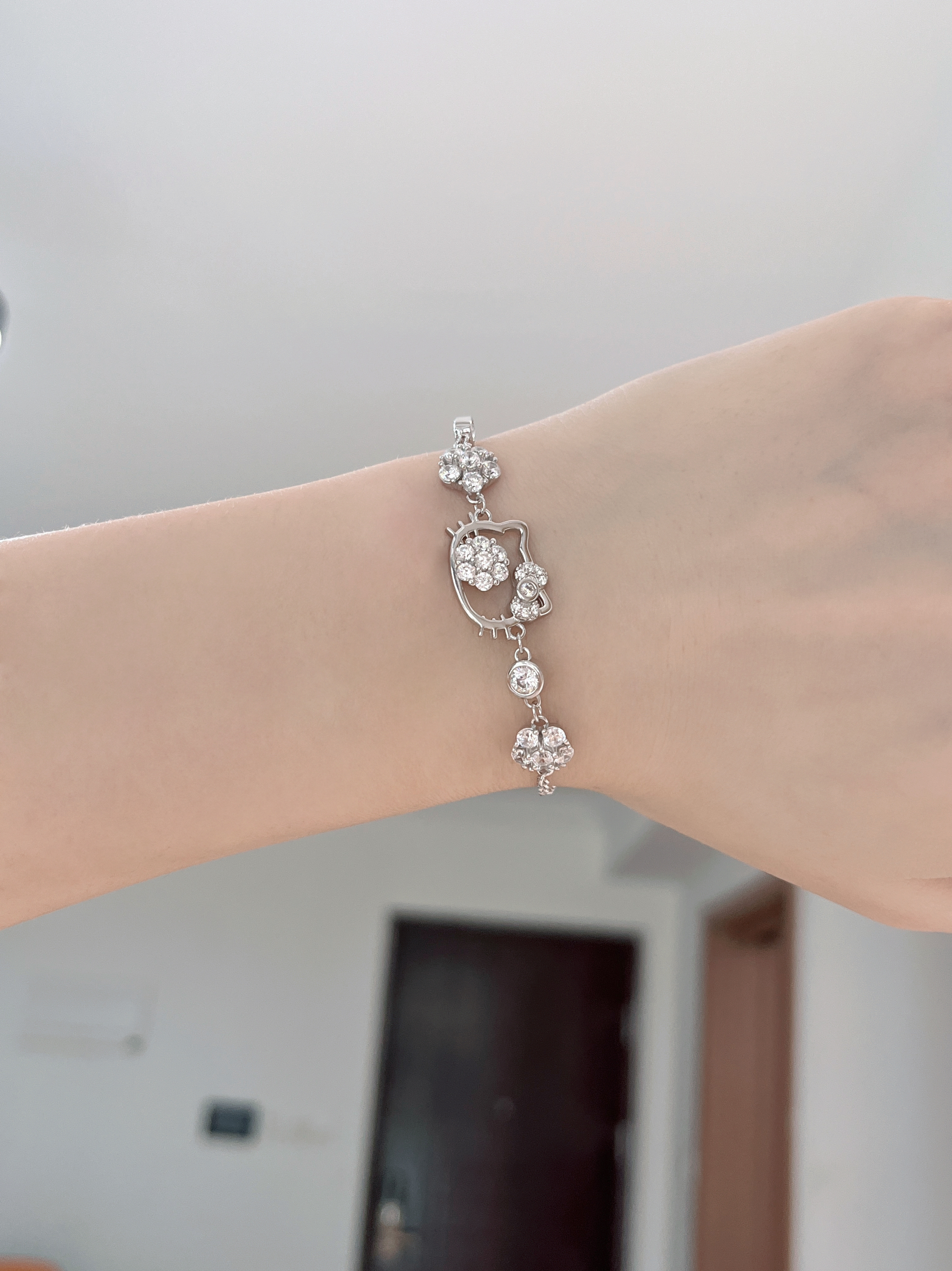 中间镂空的凯蒂猫造型连接超闪的锆石 是精致blingbling 的凯蒂猫手链 整体是冰冰透透的清冷感 银色戴上去很显白 925银的 不易过敏和褪色 日常穿个小裙子出门就很好看 礼盒超精致 很适合送礼!!