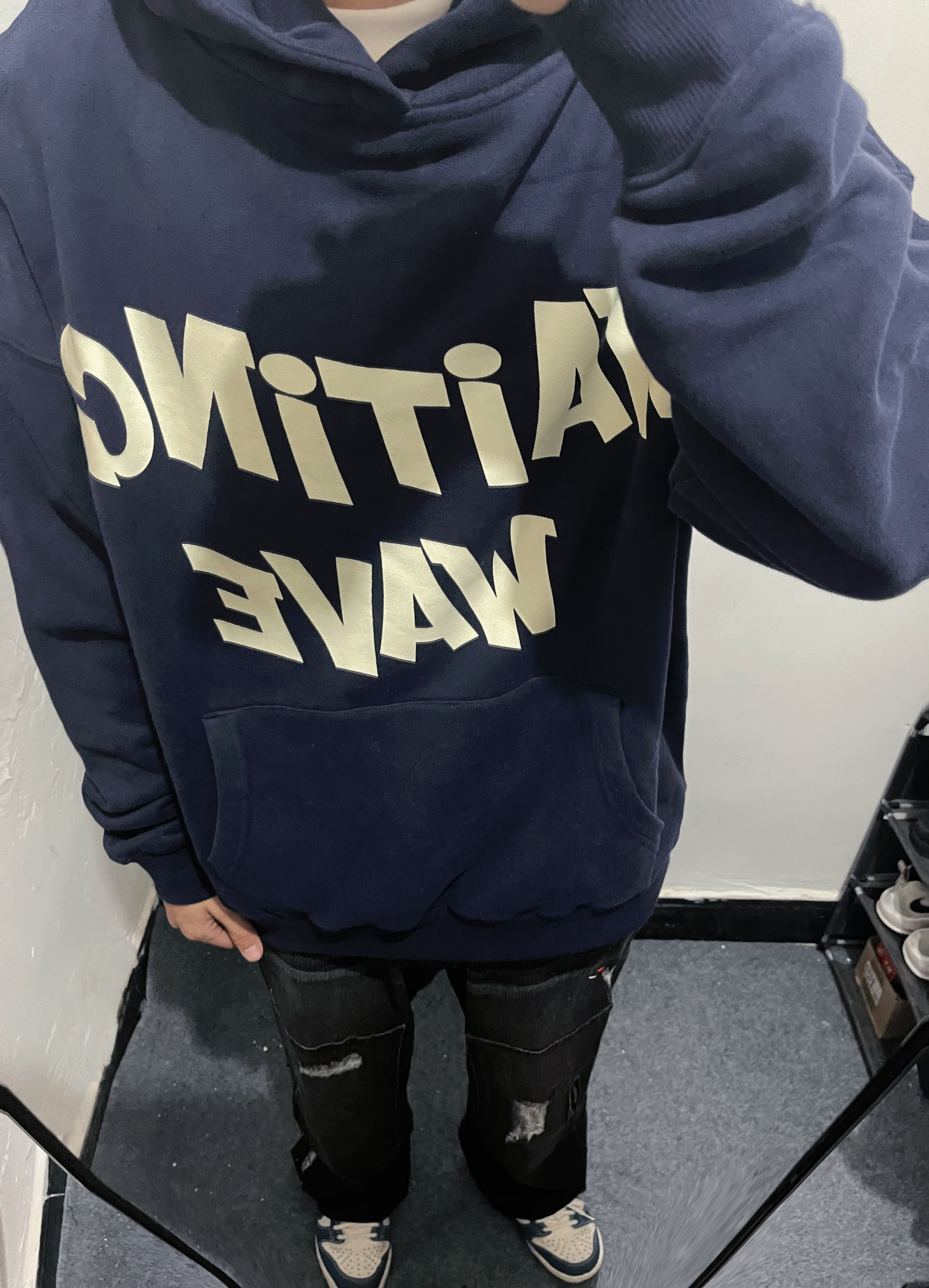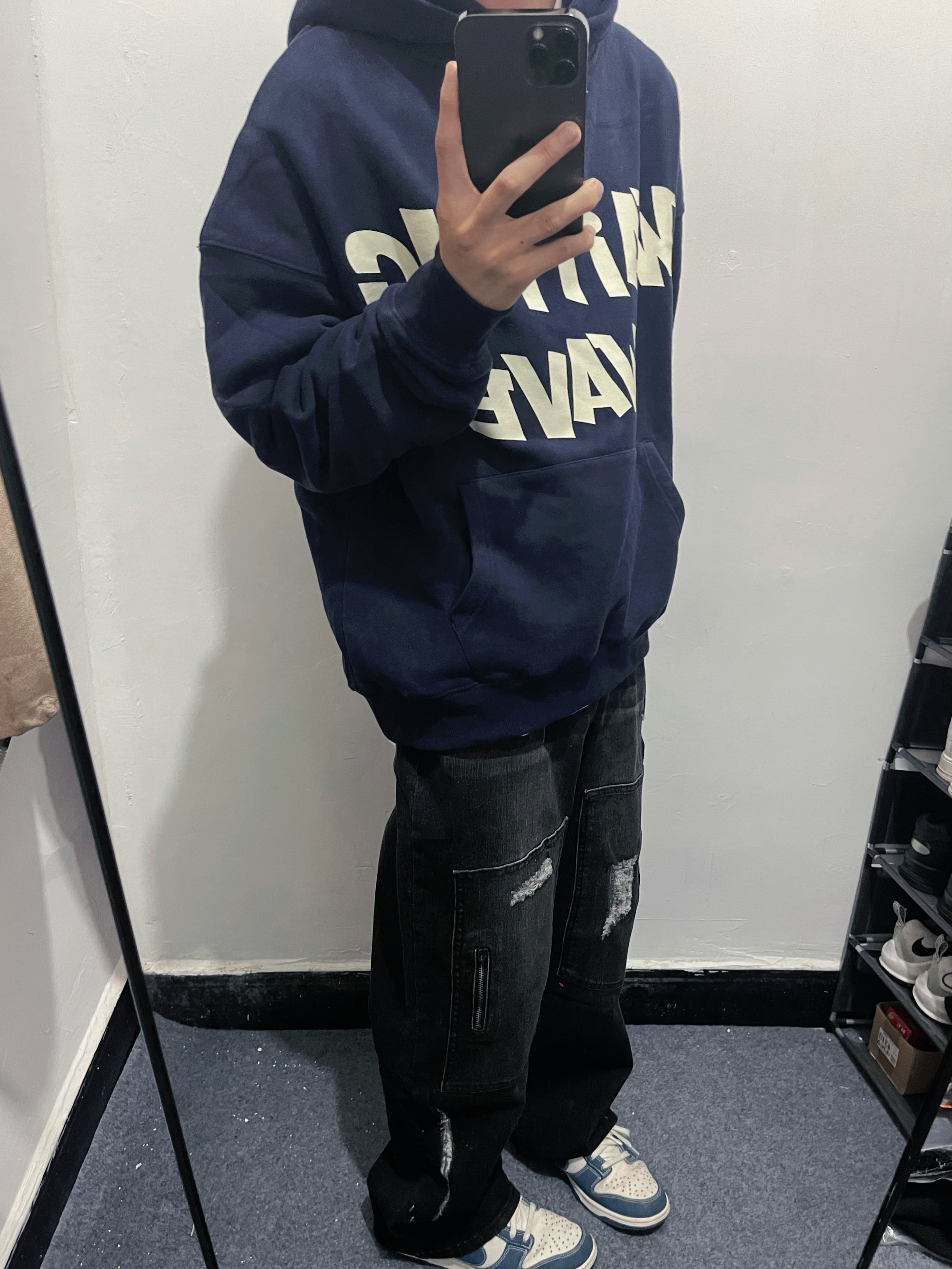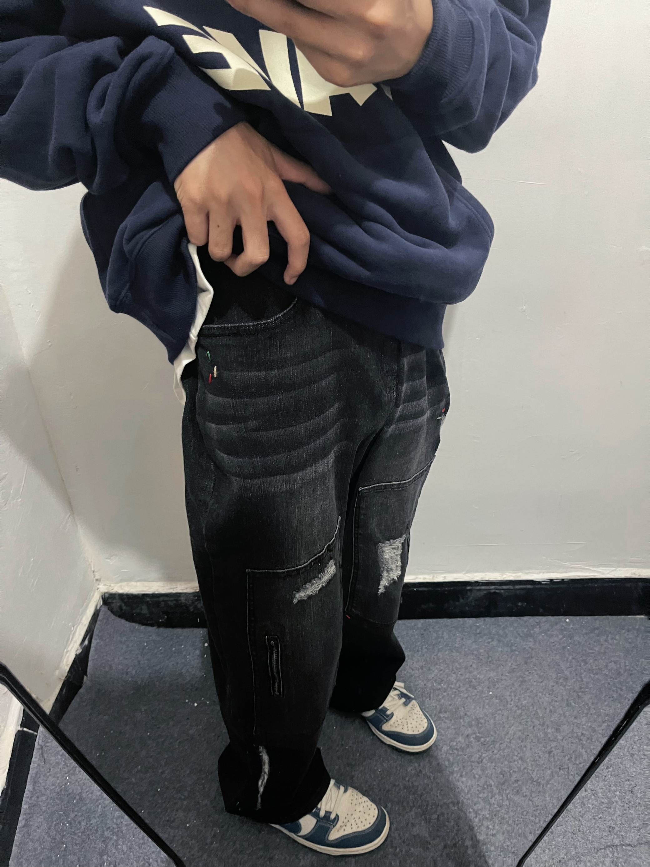 今天上身的是一件藏蓝色的卫衣和复古做旧牛仔裤细节慢慢来自侯浪。 这一套太帅啦