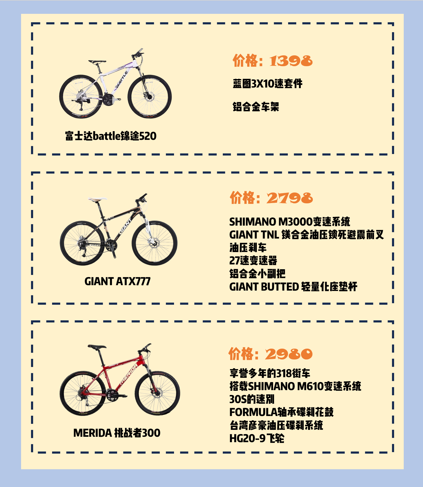 富士达battle锦途520 1.采用蓝图3X10速套件2.铝合金车架 GIANT ATX777 1.销冠王 2.搭载SHIMANO M3000变速系统,足以应对日常骑行需求 3.油压刹车,制动力在铺装路上游刃有余 4.GIANT TNL 镁合金油压锁死避震前叉 5.27速变速器 6.铝合金小副把 7.GIANT BUTTED 轻量化座垫...