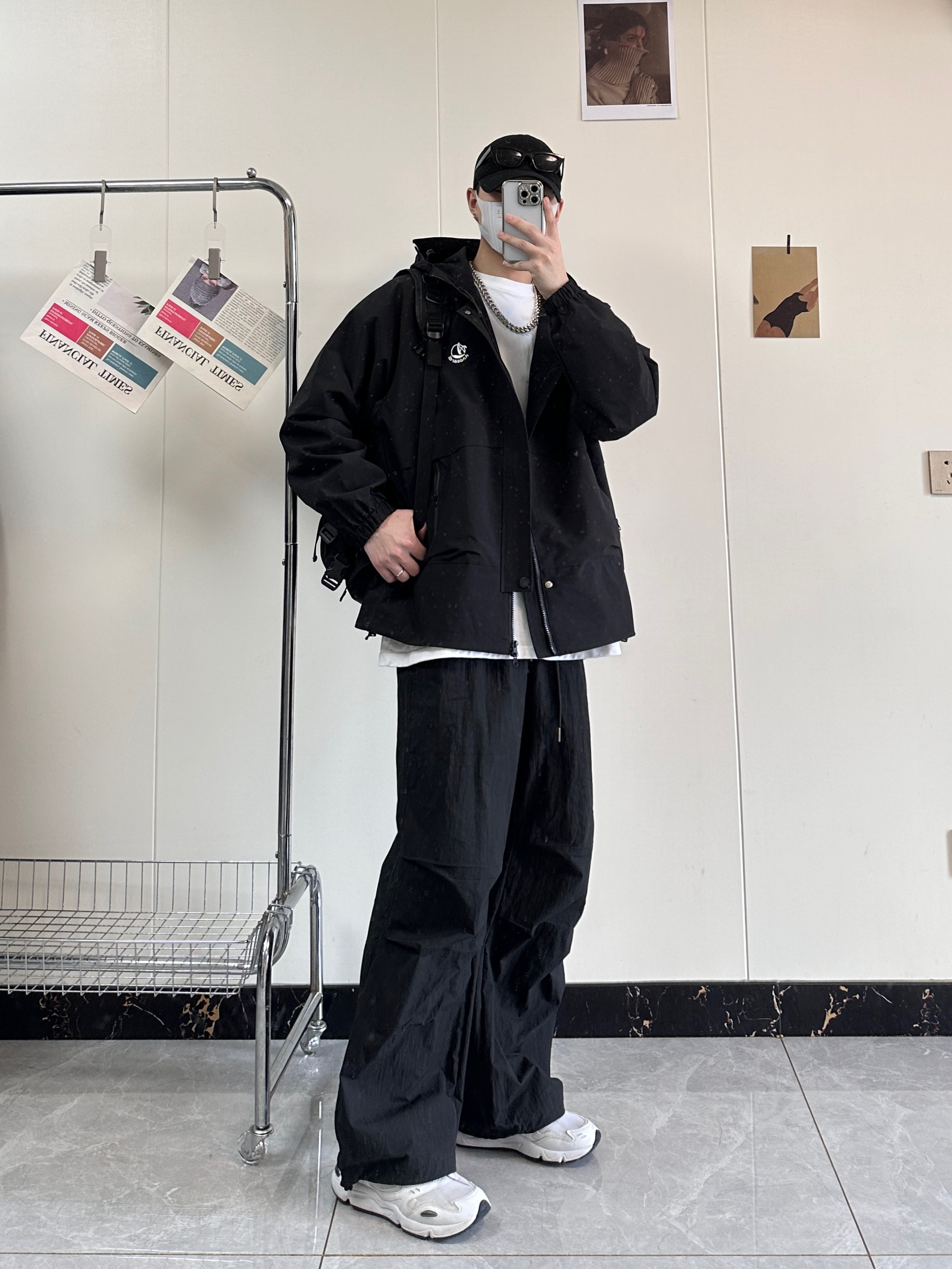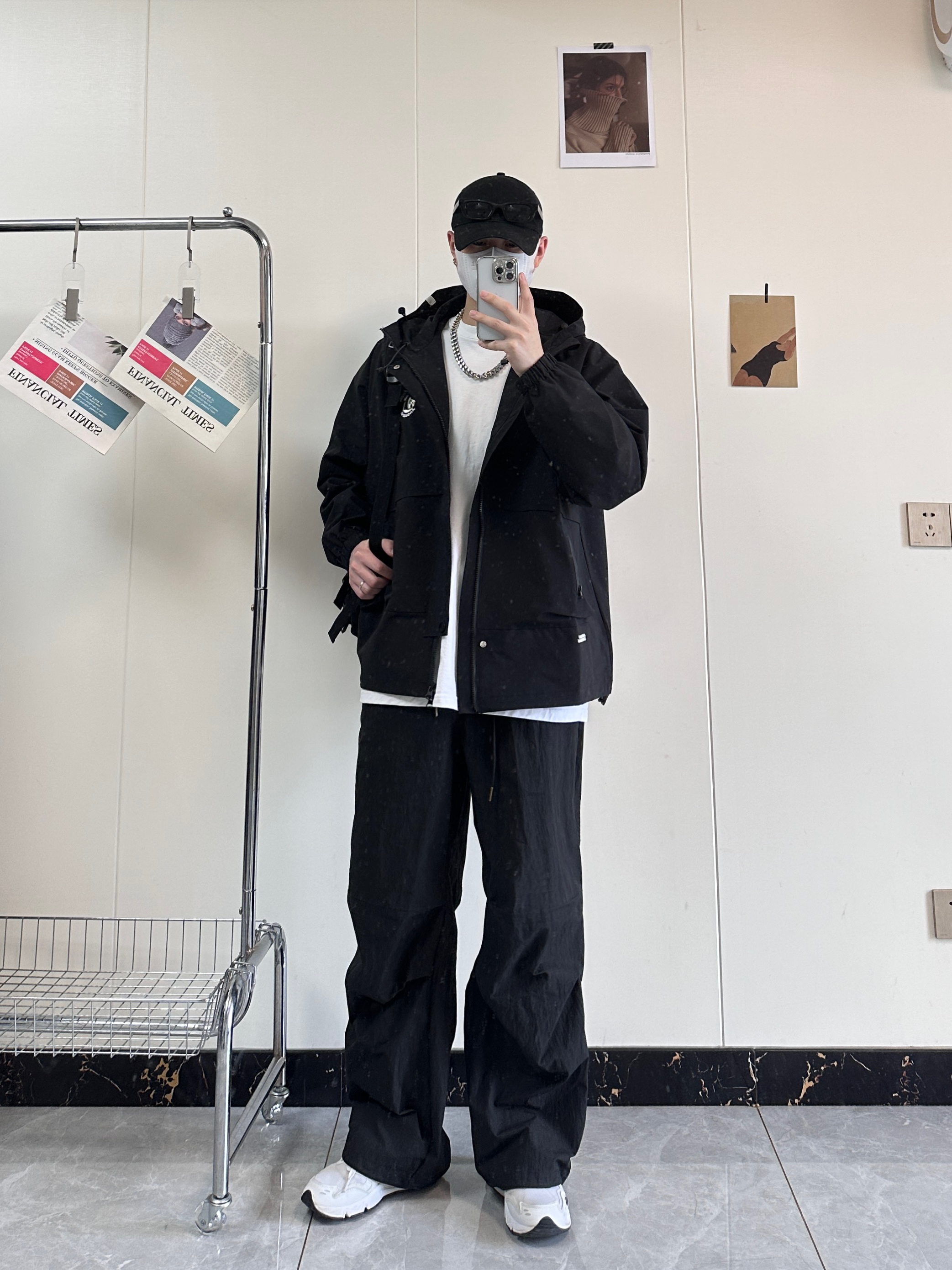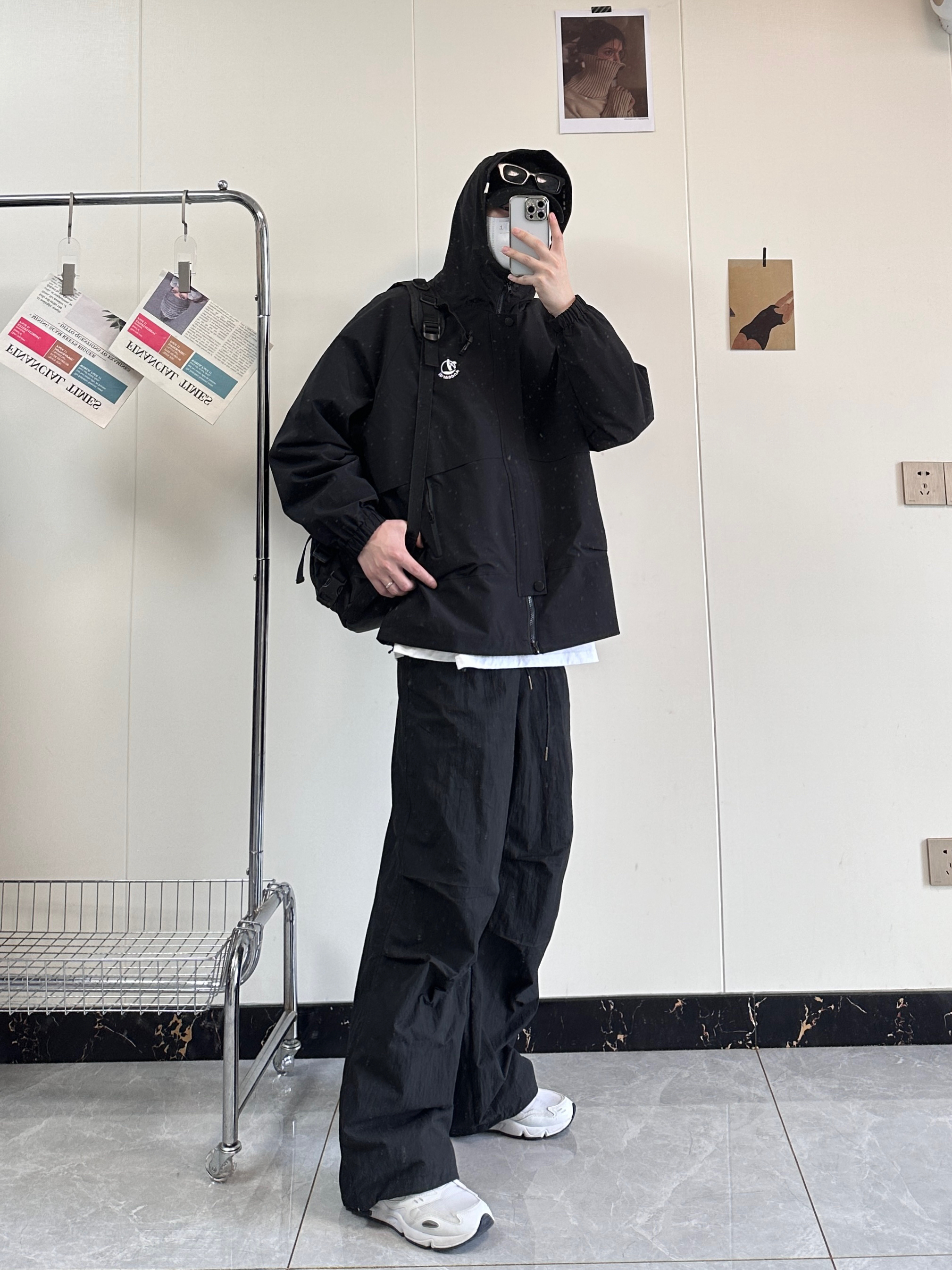 今日分享入秋酷酷的穿搭 最近要出去旅游的小伙伴相信我就穿这套会超酷 三防面料冲锋衣搭配微喇版型的伞兵裤真的很酷很酷 三防面料冲锋衣保暖有能在户外恶劣的天气下穿他 整体简约的设计也是非常的高级,连帽的款式遮风又挡雨,重点是性价比超高的啊。 裤子是宽松版型的伞兵裤很显腿长重点不挑腿型。 鞋子👟:NB426纯白色超百搭而且很舒服脚感好。