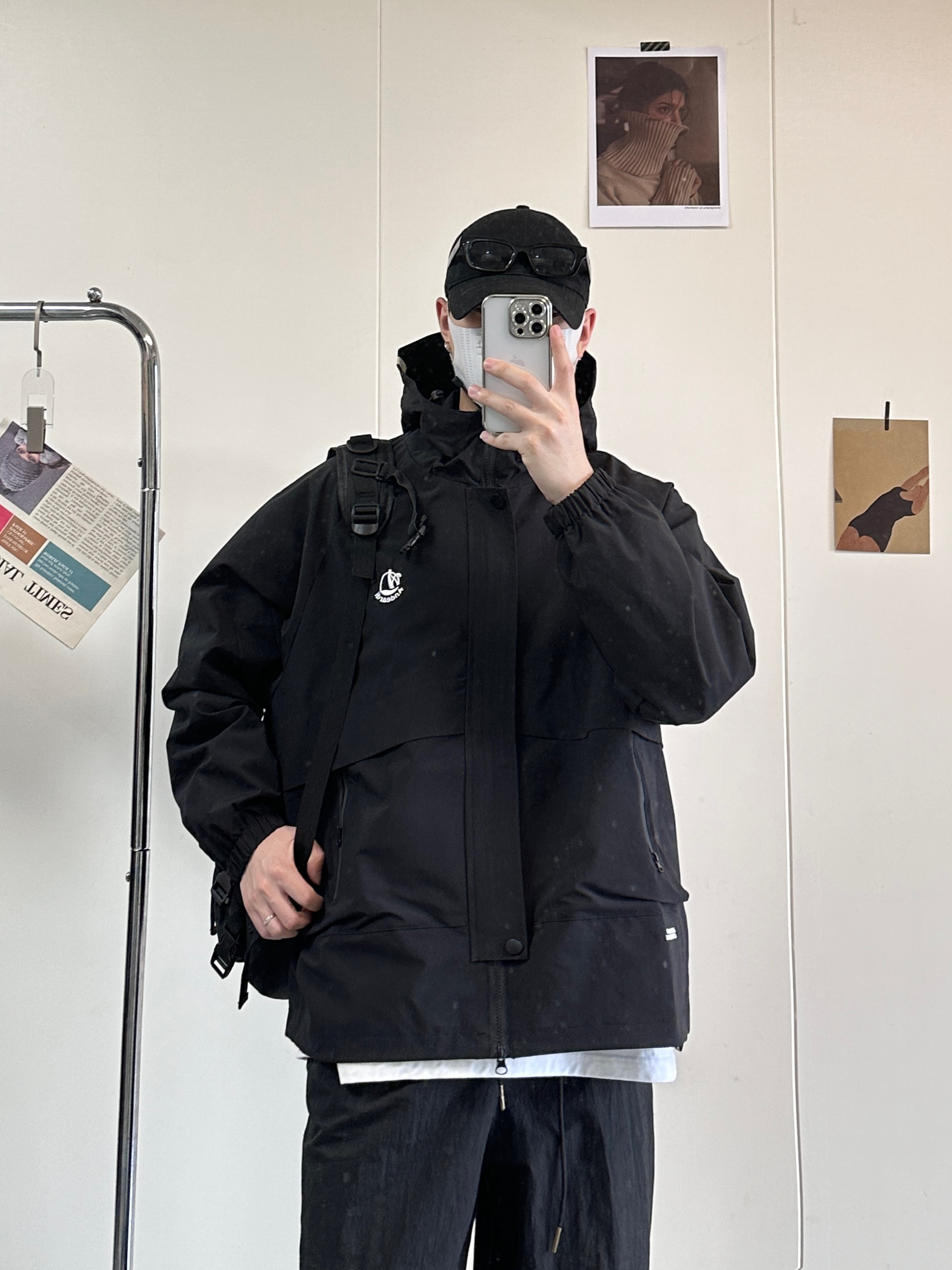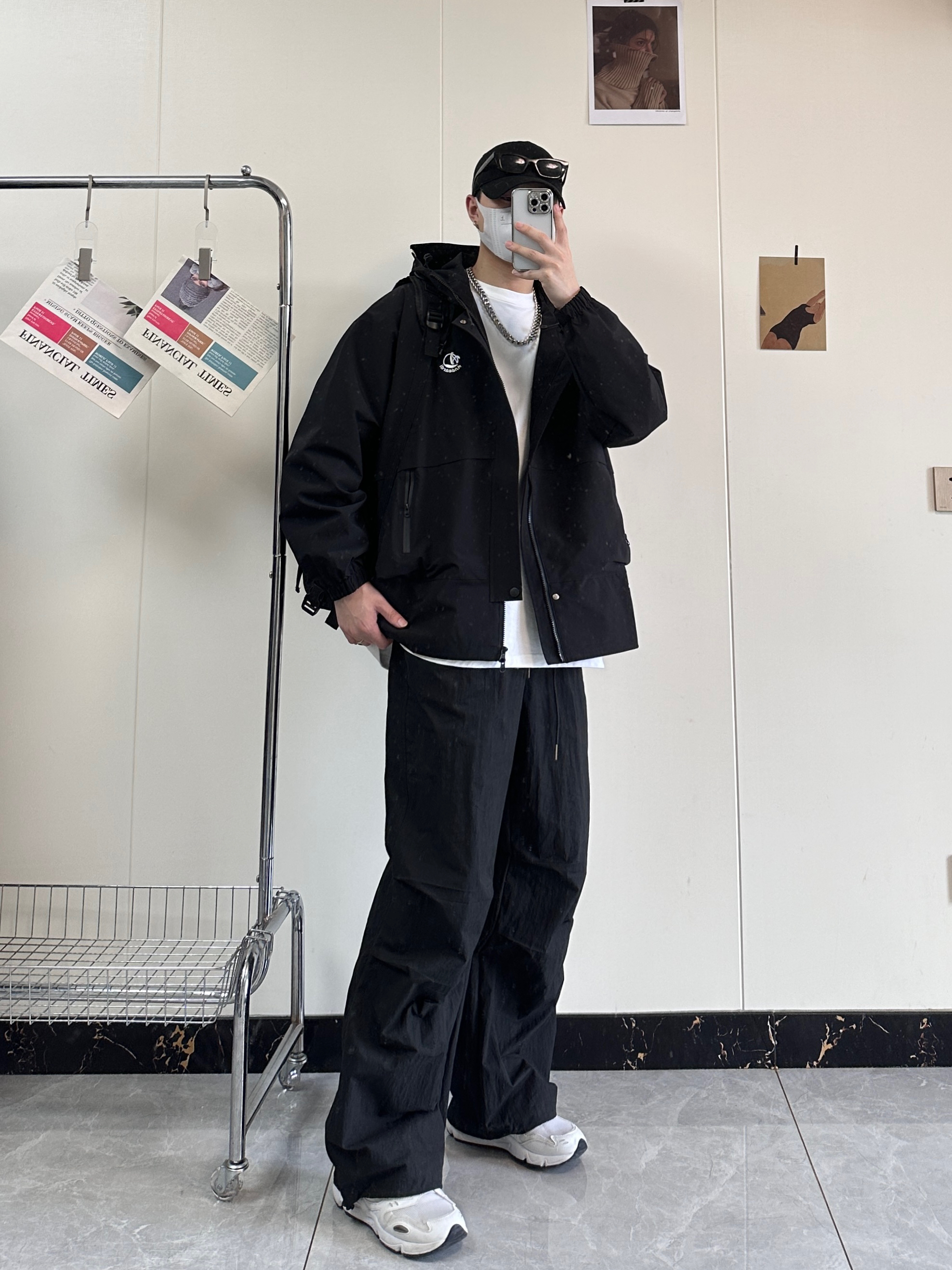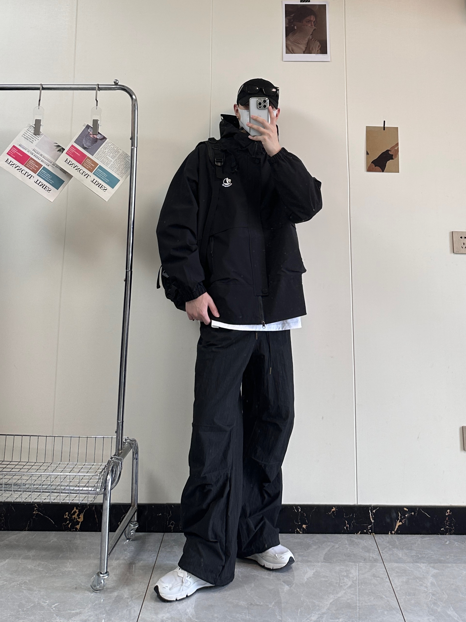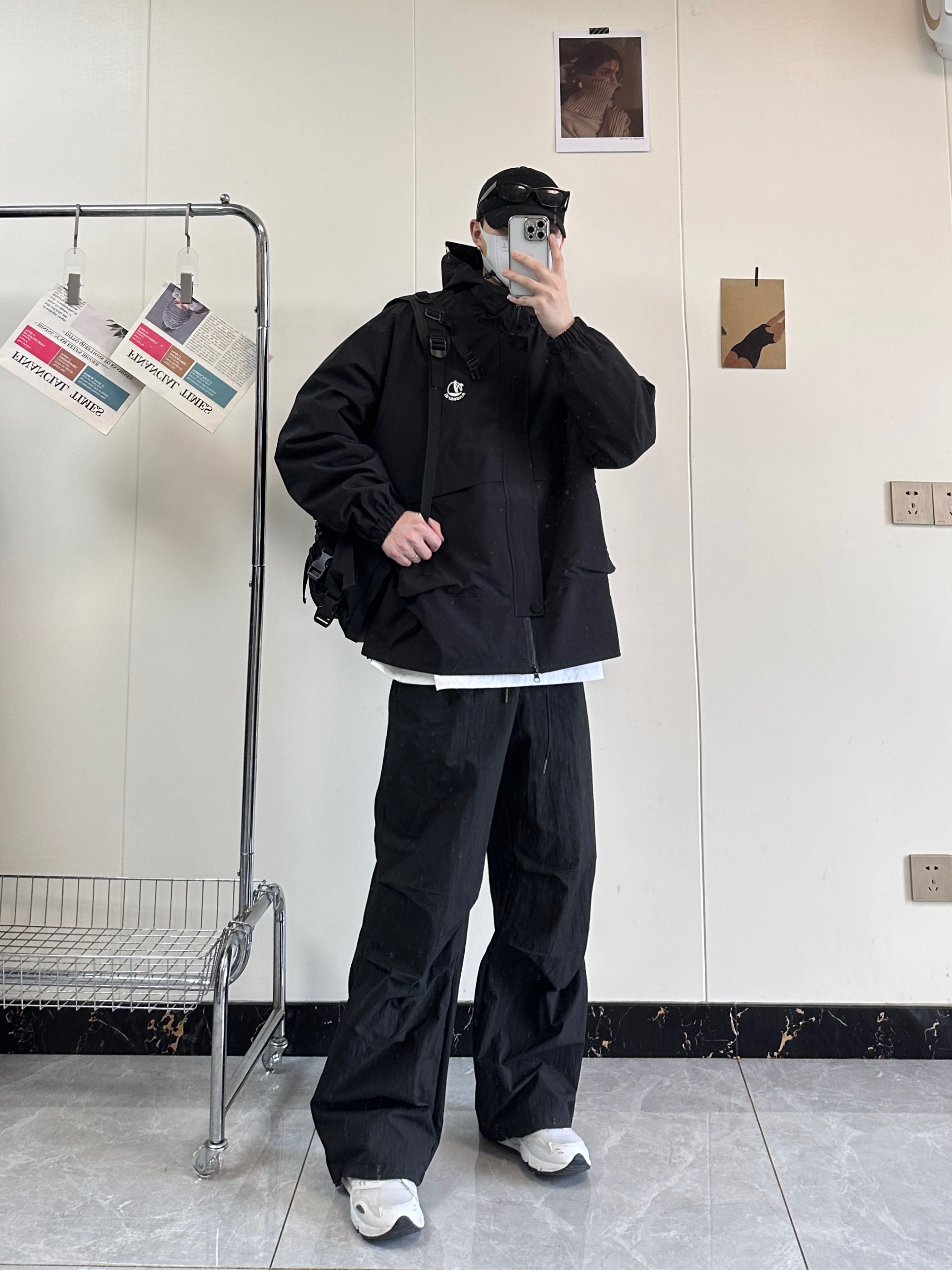 今日分享入秋酷酷的穿搭 最近要出去旅游的小伙伴相信我就穿这套会超酷 三防面料冲锋衣搭配微喇版型的伞兵裤真的很酷很酷 三防面料冲锋衣保暖有能在户外恶劣的天气下穿他 整体简约的设计也是非常的高级,连帽的款式遮风又挡雨,重点是性价比超高的啊。 裤子是宽松版型的伞兵裤很显腿长重点不挑腿型。 鞋子👟:NB426纯白色超百搭而且很舒服脚感好。