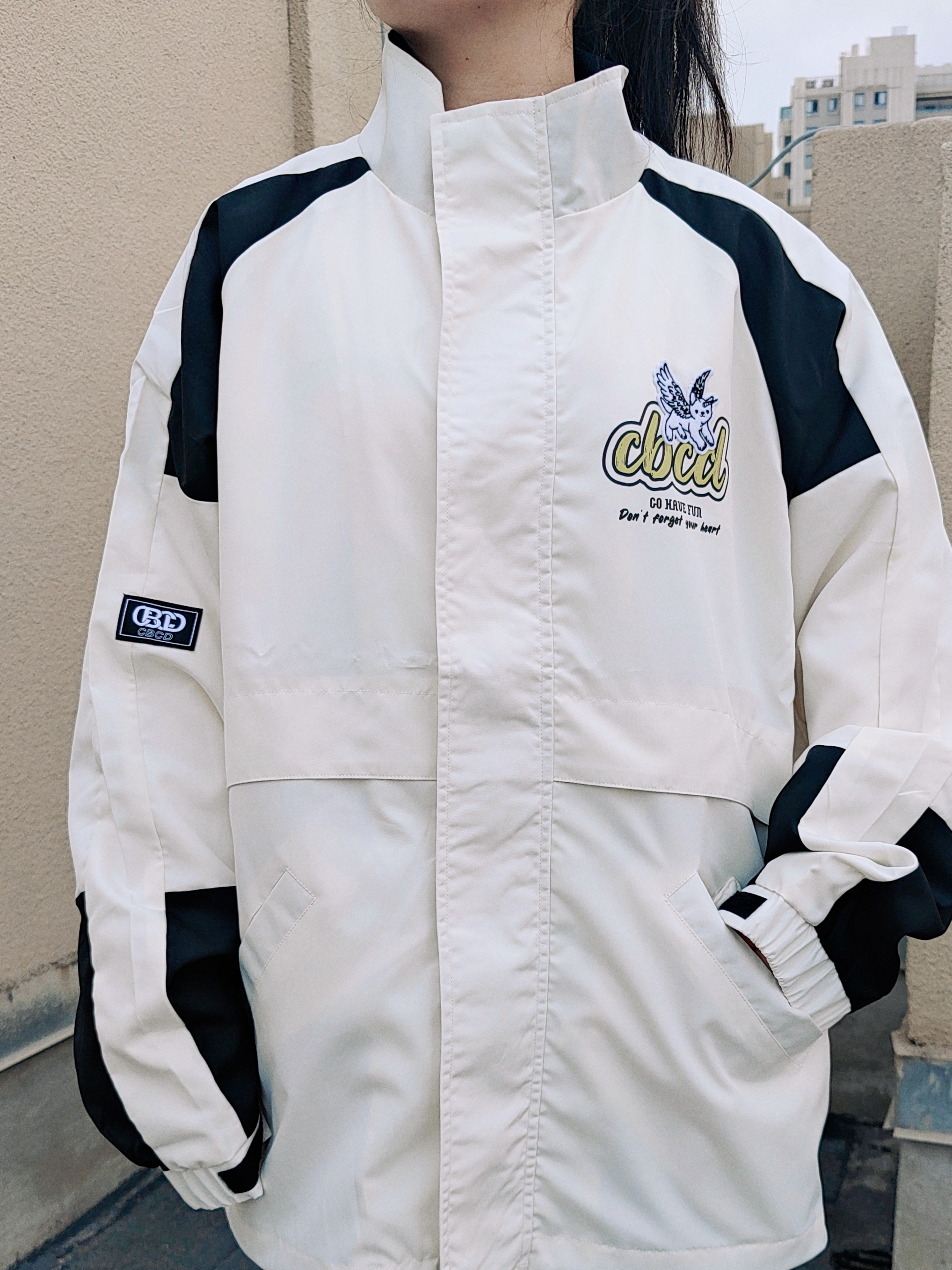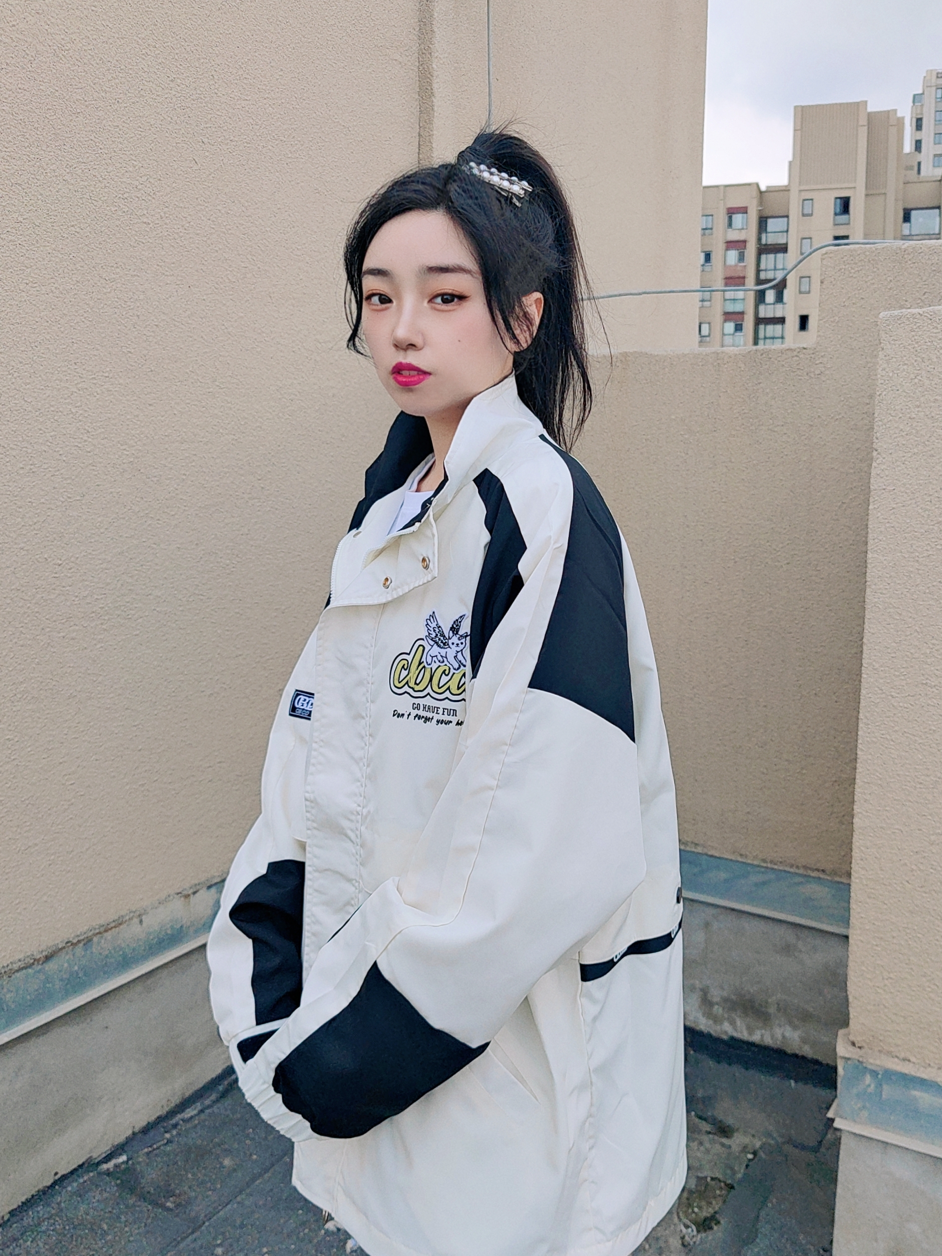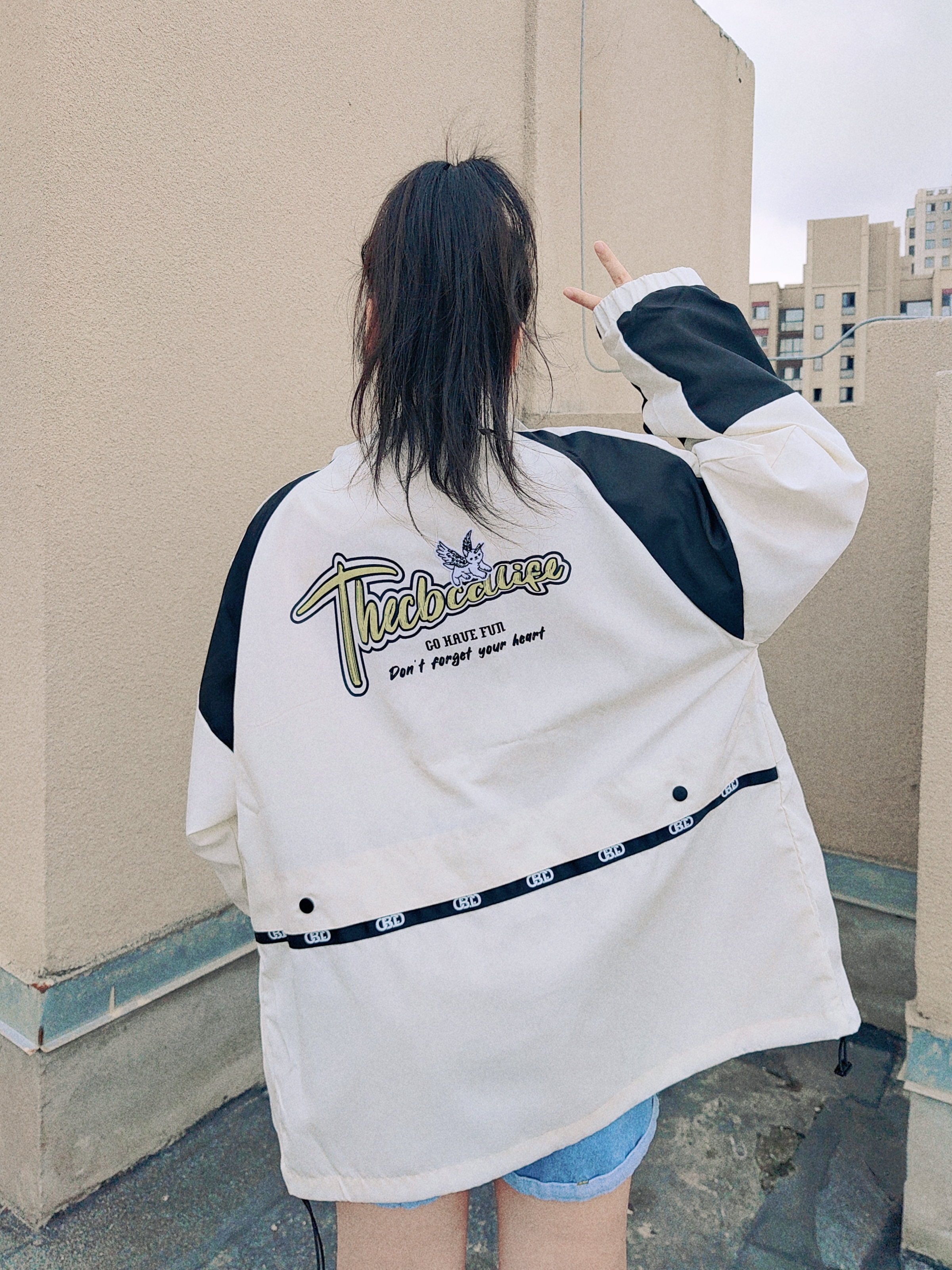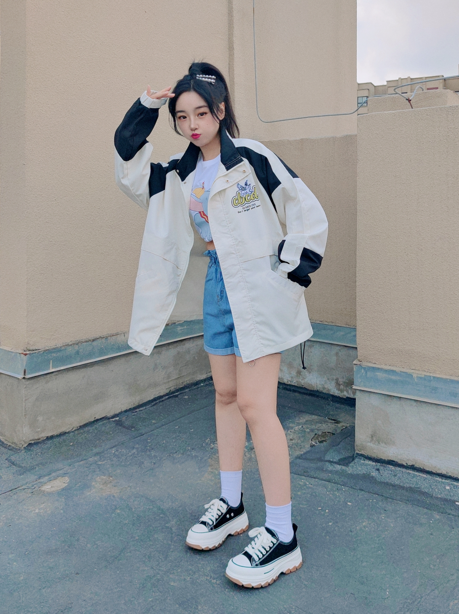 🌞160cm/46kg ↓ 哈喽,这里是小5的穿搭分享√ 今天分享一套大大的立领外套穿搭法, 短T+短裤+夹克外套+板鞋 通过短袖卷边露腰和高腰短裤搭配, 提升整体露肤度, 看起来不仅酷飒有潮范儿, 而且在视觉上拉伸腿长很显高哦~ 外套我特地选了XL码, 宽松休闲的感觉能把人罩住, 更能衬托出小个子女生的古灵精怪, 户外、通勤、学院都OK~