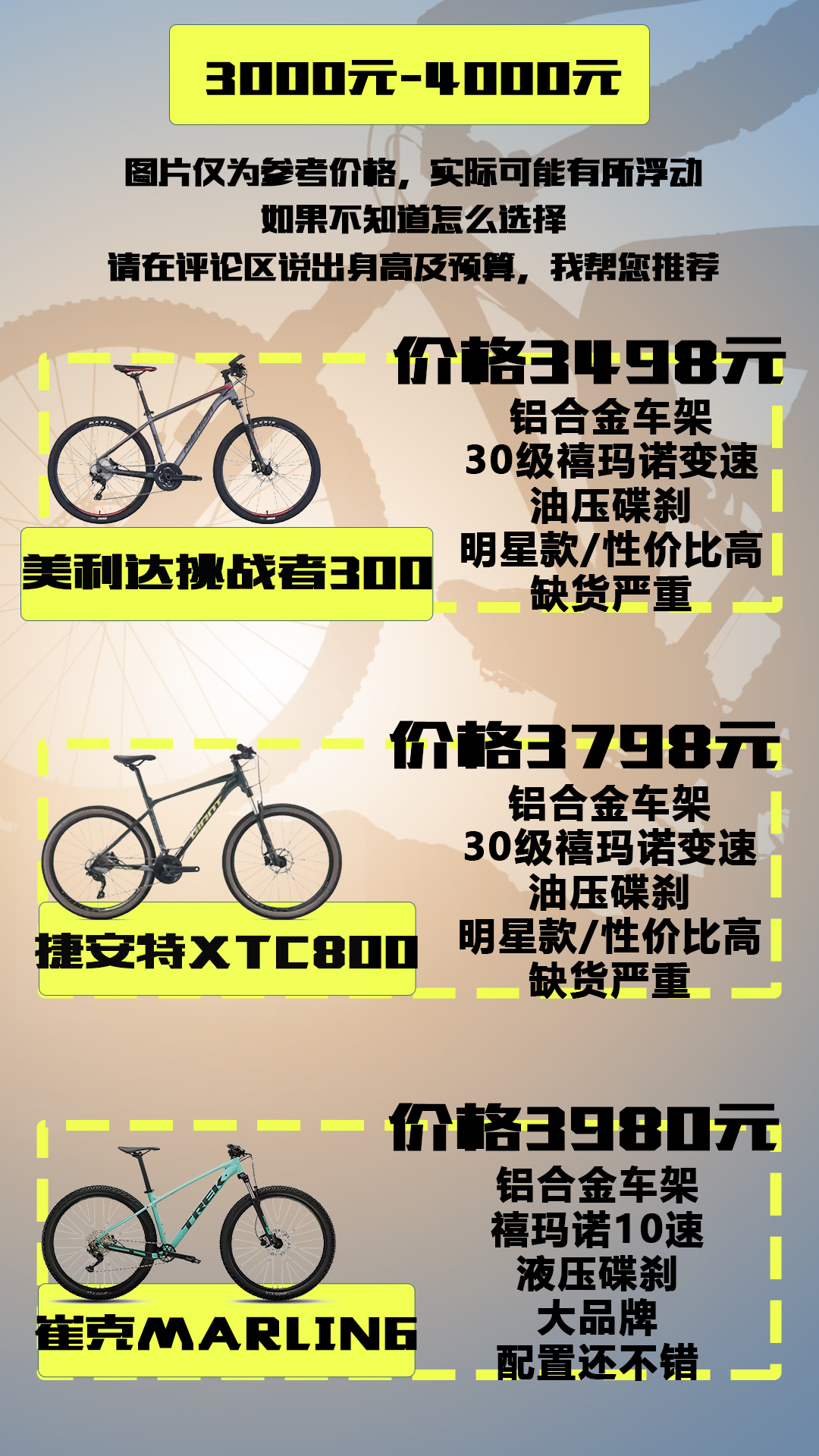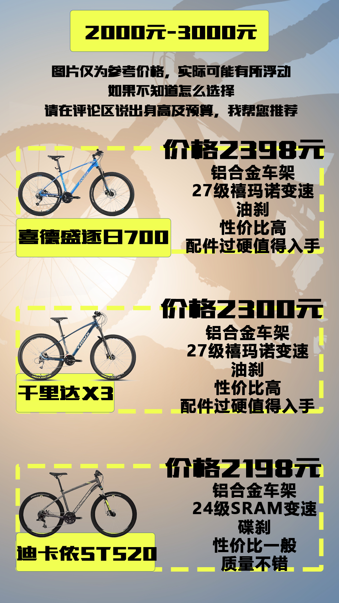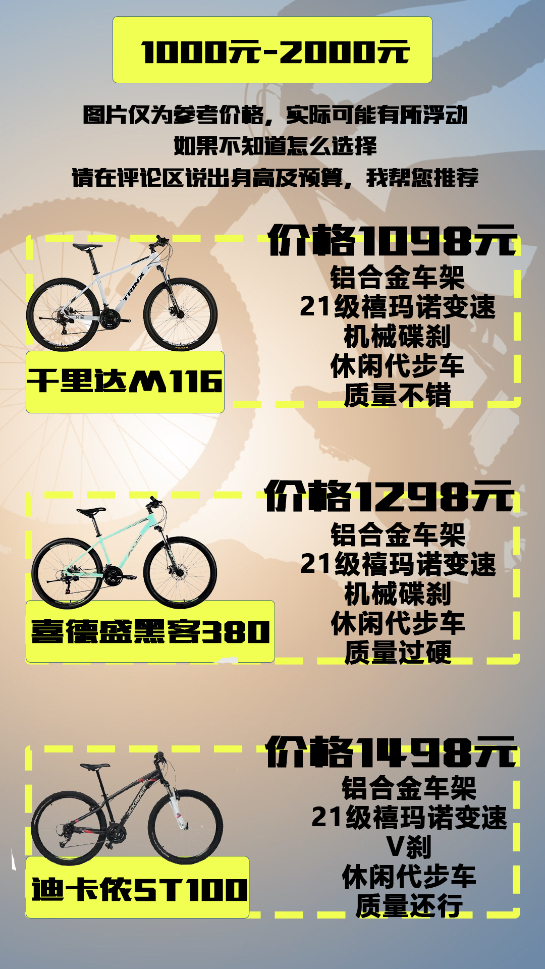 🚴千里达M116 价格1098💰 特点:铝合金车架 21级禧玛诺变速 机械碟刹 休闲代步车 质量不错 🚴喜德盛黑客380 价格1298💰 特点:铝合金车架 21级禧玛诺变速 机械碟刹 休闲代步车 质量过硬 🚴迪卡侬ST100 价格1498💰 特点:铝合金车架 21级禧玛诺变速 V刹 休闲代步车 质量还行 🚴喜德盛逐日700 价格2398💰 特点:铝合金车架 27级禧...