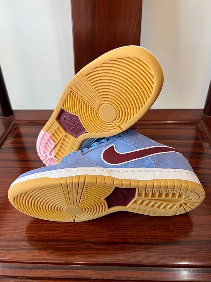费城人Dunk SB!蓝蓝的很适合夏天! Nike Dunk SB Low PRM "phillies"' 费城人泡泡糖 防滑轻便 低帮 板鞋 男女同款 蓝色 泡泡糖鞋底真的太有意思了!就像鞋底踩上了泡泡糖一样!蓝色鞋面搭配酒红色的swoosh,高级感满满!鞋舌图案呼应设计主题,值得分享的百搭Dunk