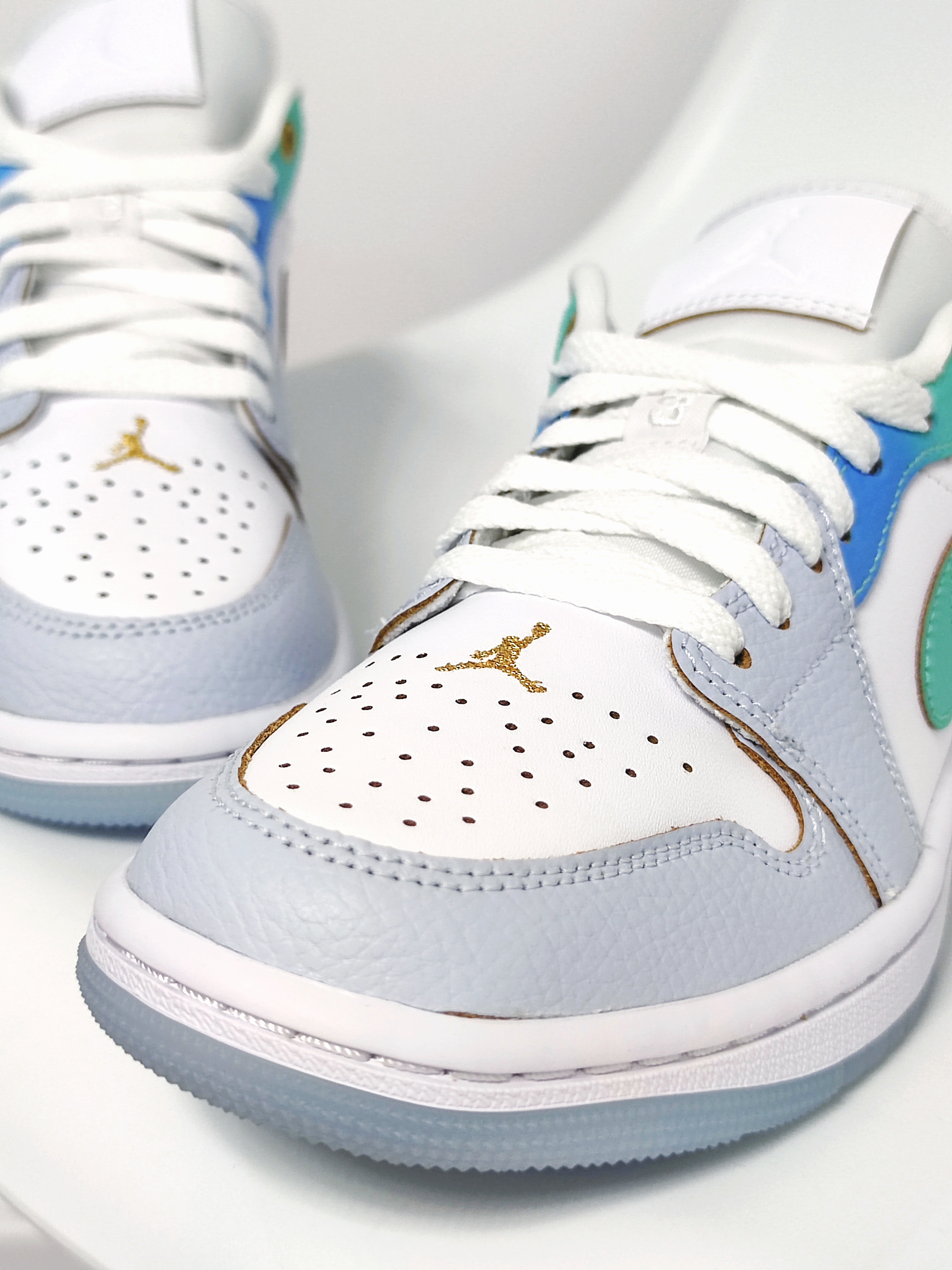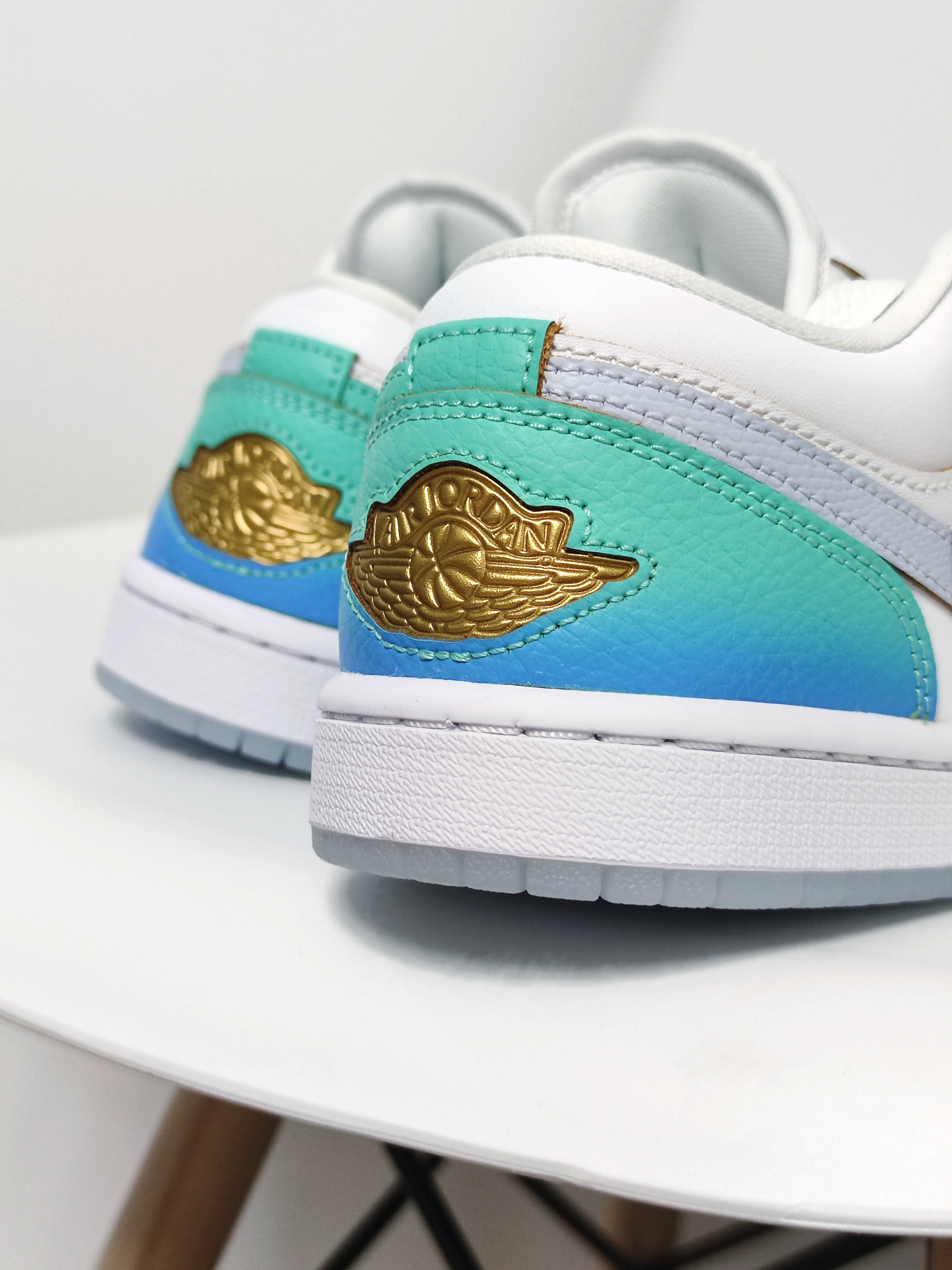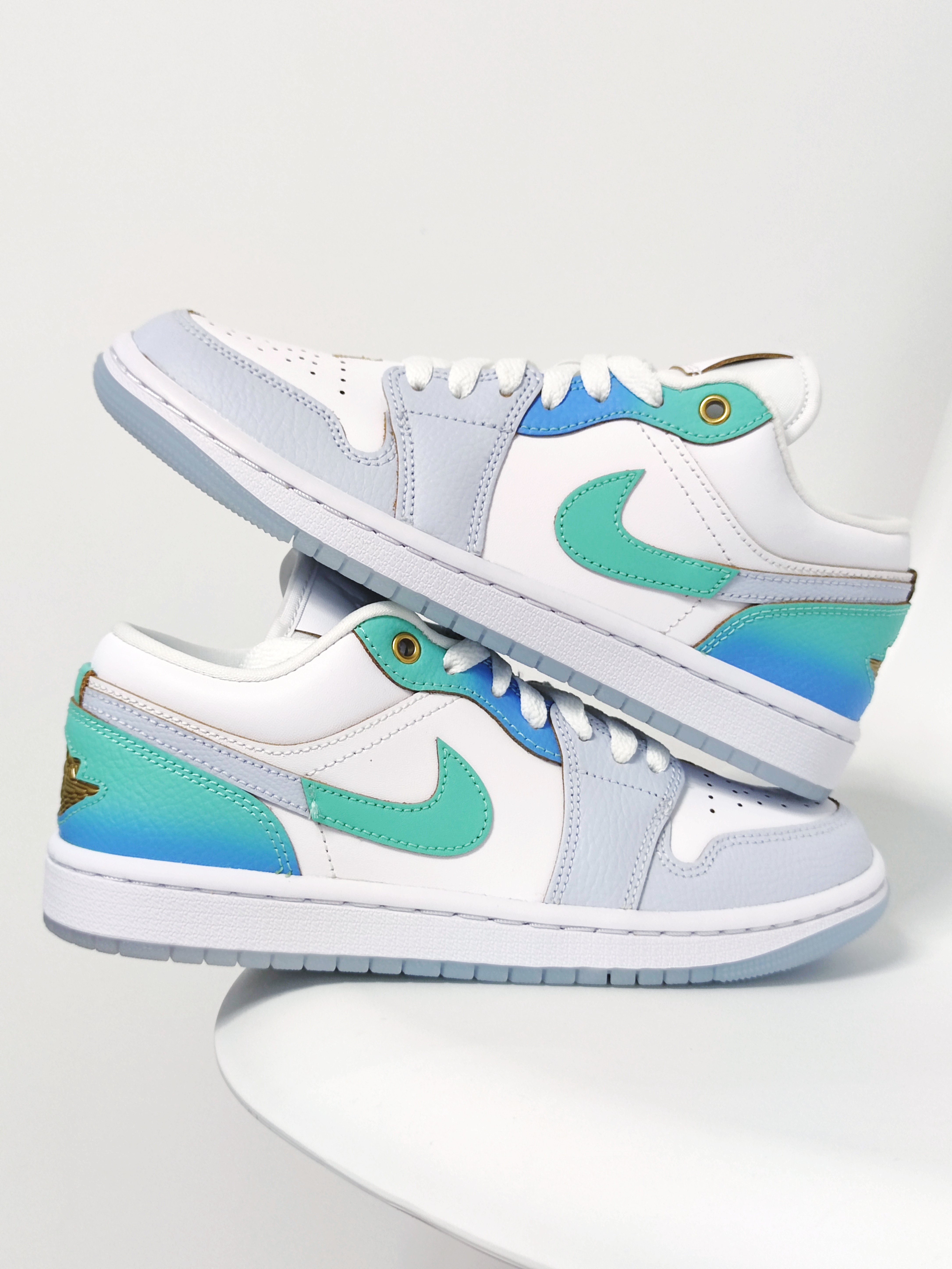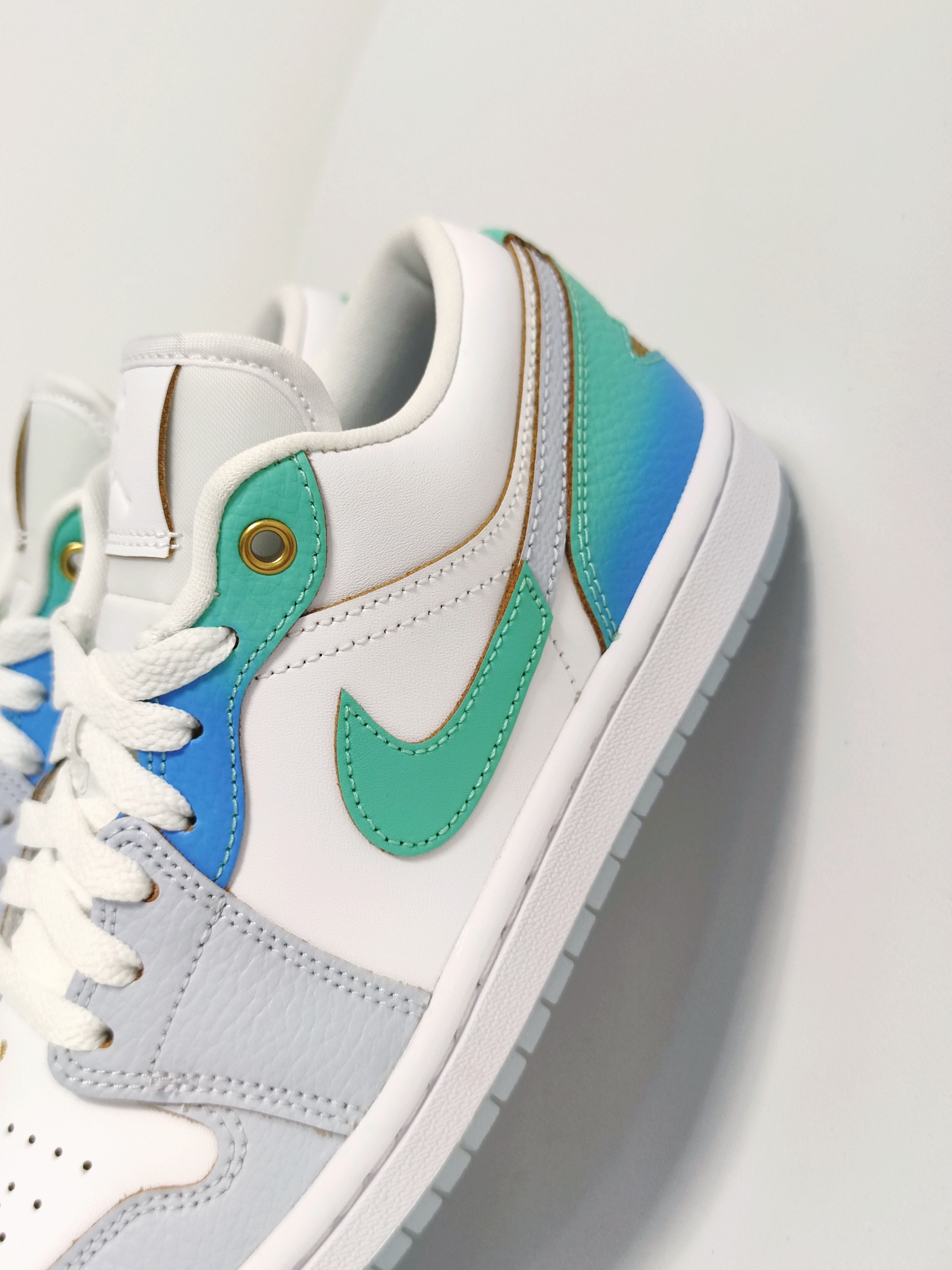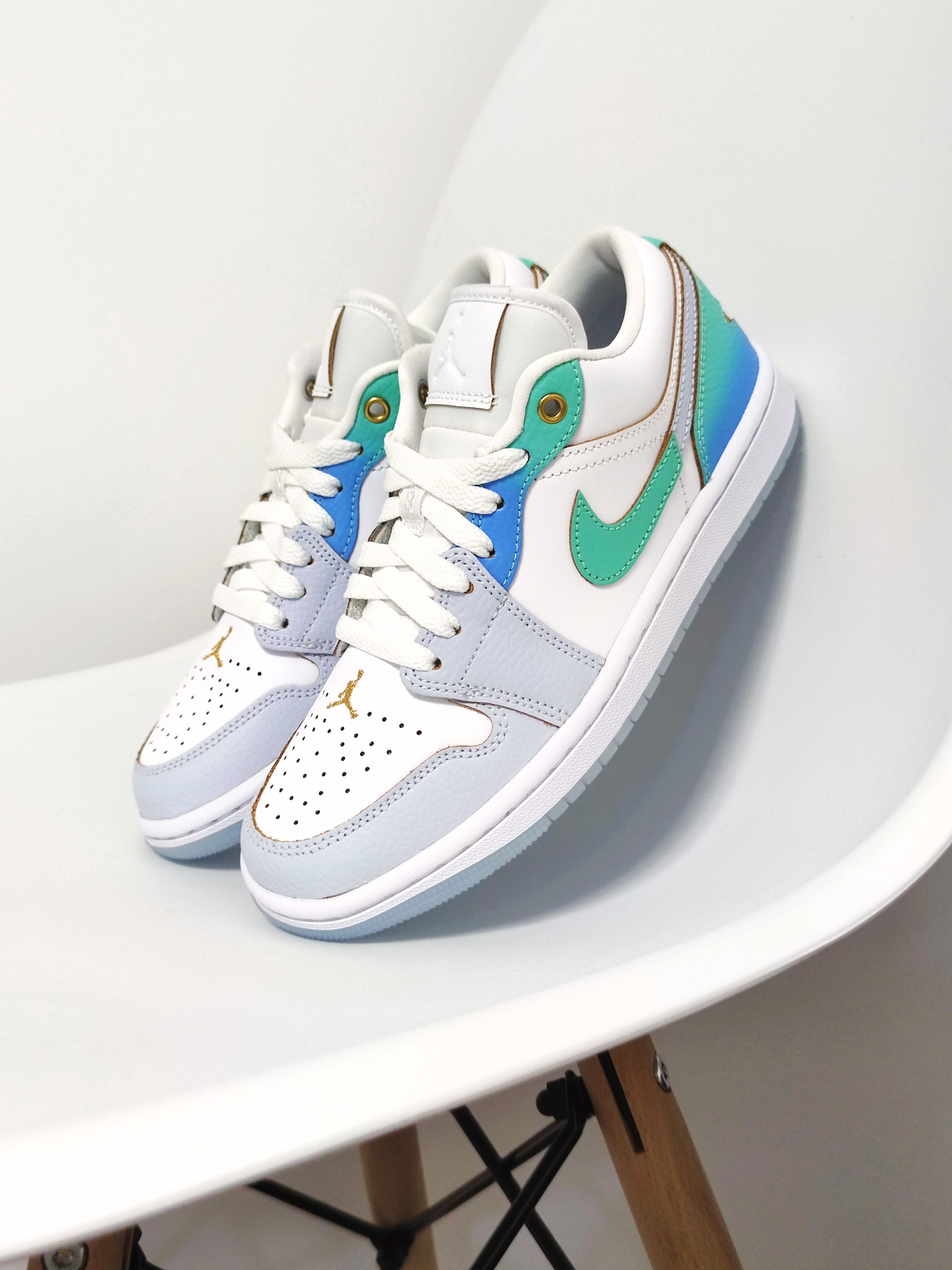 🍀 讲道理啊,这是我一眼就爱上的鞋!这双Air Jordan 1 low全新配色实在是太美啦!!😍 :) 我只能说耐克是真的懂女孩子! ① 这双采用经典配色蓝色+绿色的渐变处理,传递缤纷趣味 ② 很喜欢金色的鞋头Jumpman,真的很精致啊啊啊啊啊啊啊! ③ 还有内陷的鞋后跟标志元素,比普通款精致太多啦! ❗小仙女们,一定不要错过啦!🙌🏻