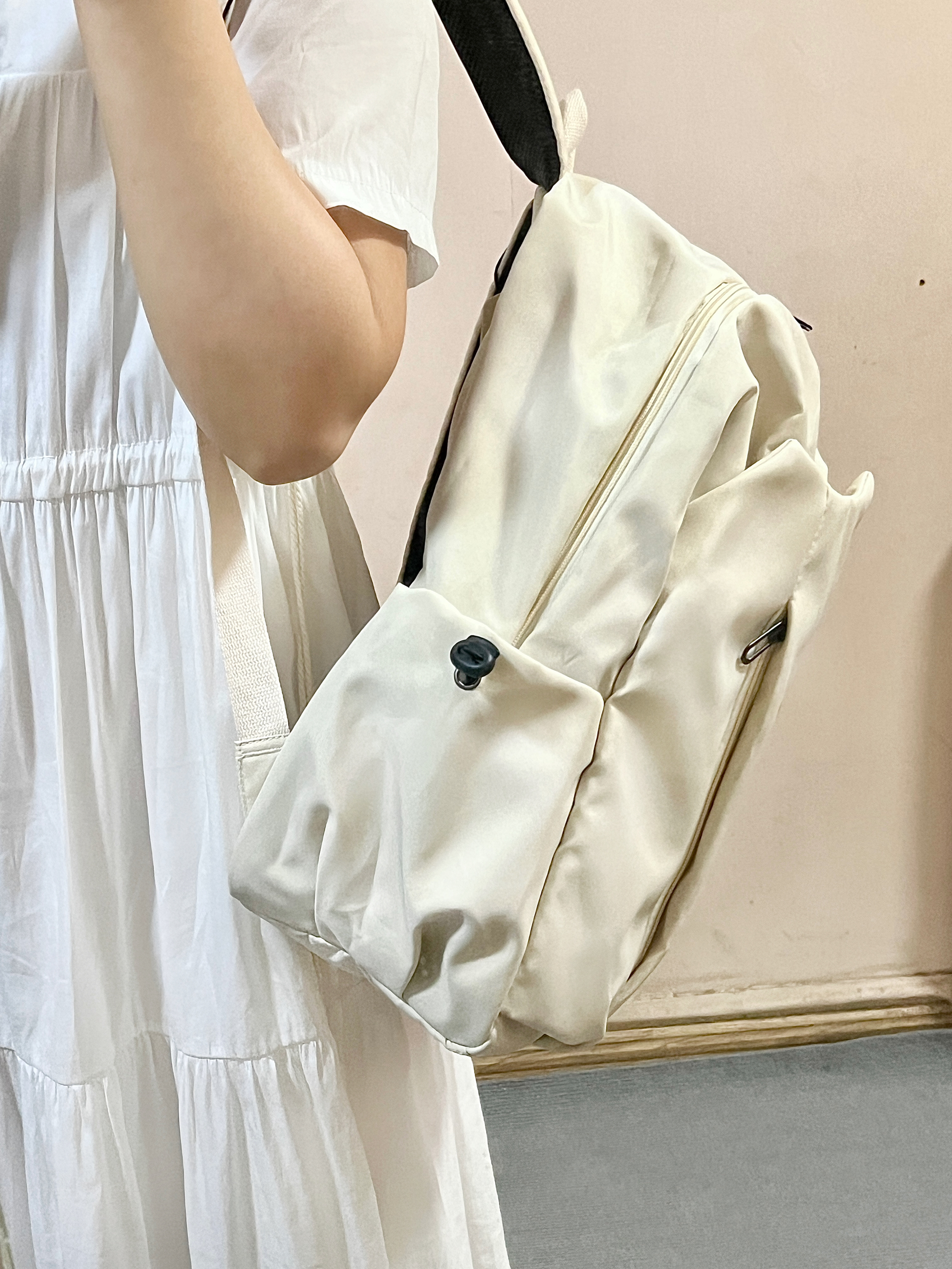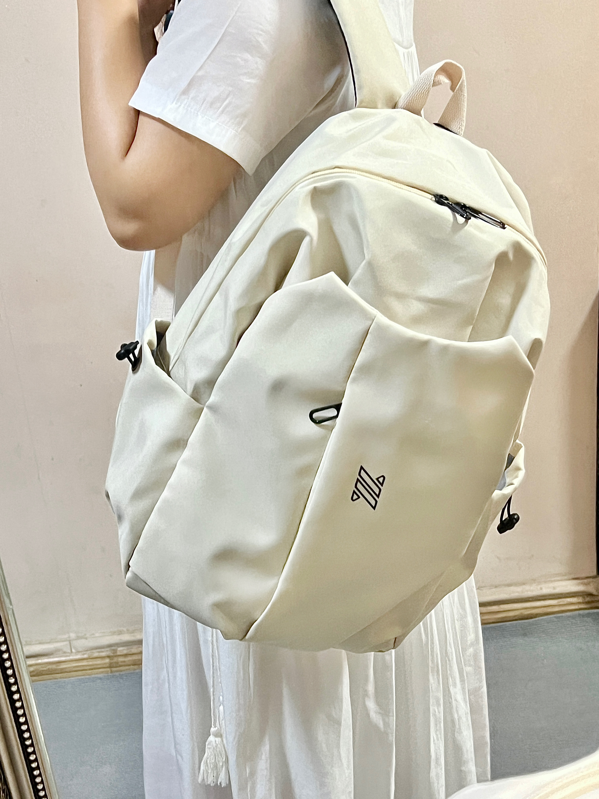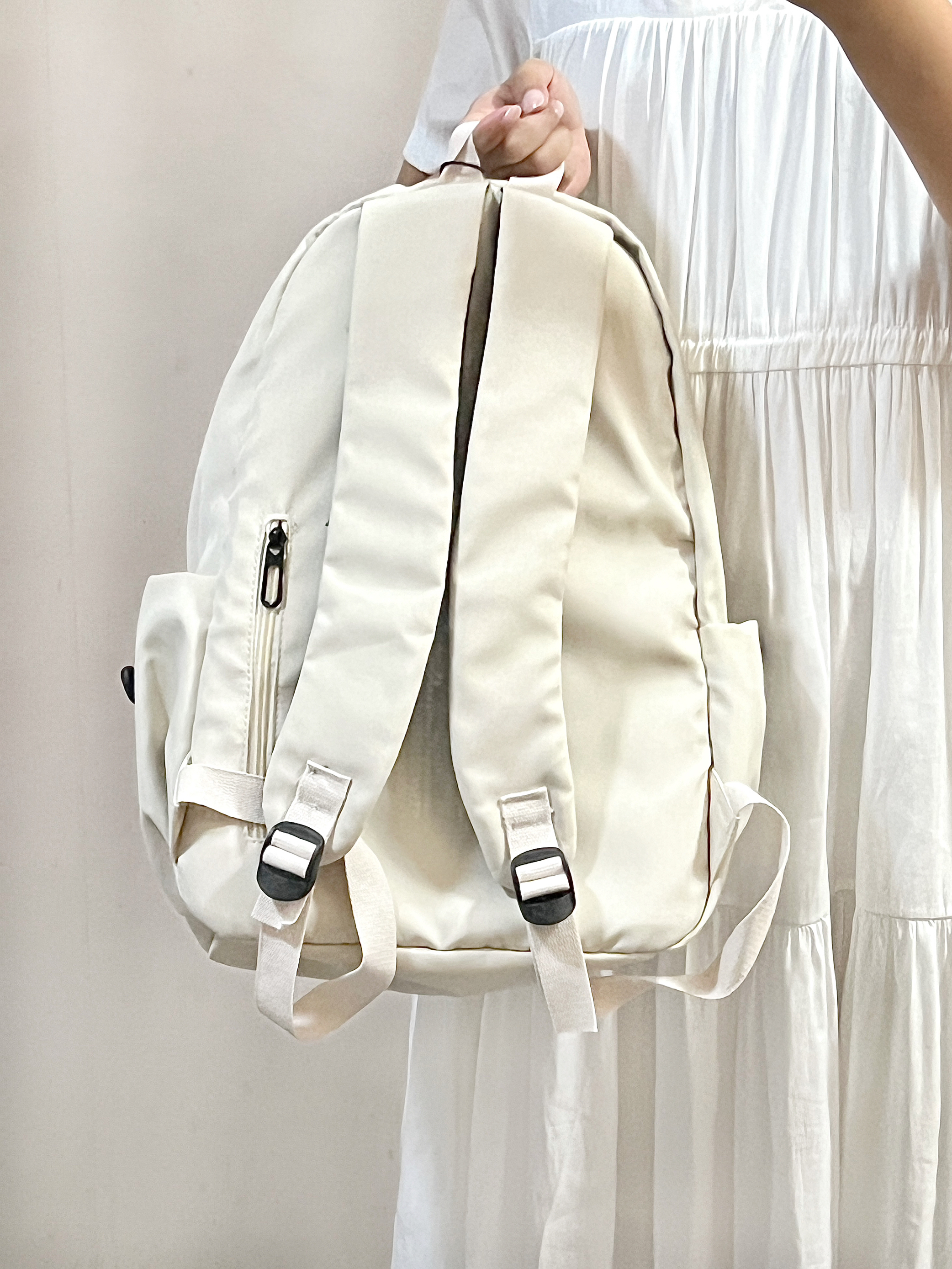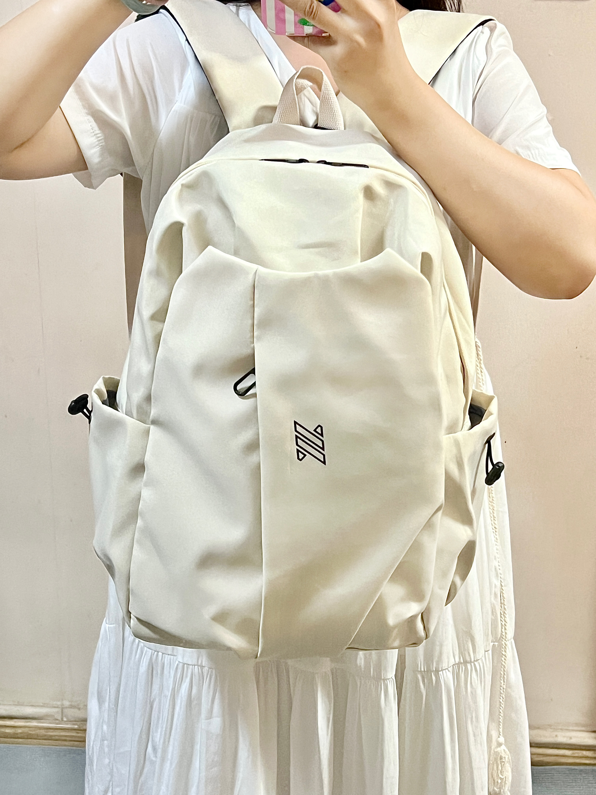 这次买的奶白色书包我尊的好喜欢! 奶fufu的超百搭!显得整个人温柔又阳光🧚♀️ 而且这个书包可能装了! 隔层还很多!装很多东西也不会乱乱的! 舍友们都来问我要🔗嘻嘻
