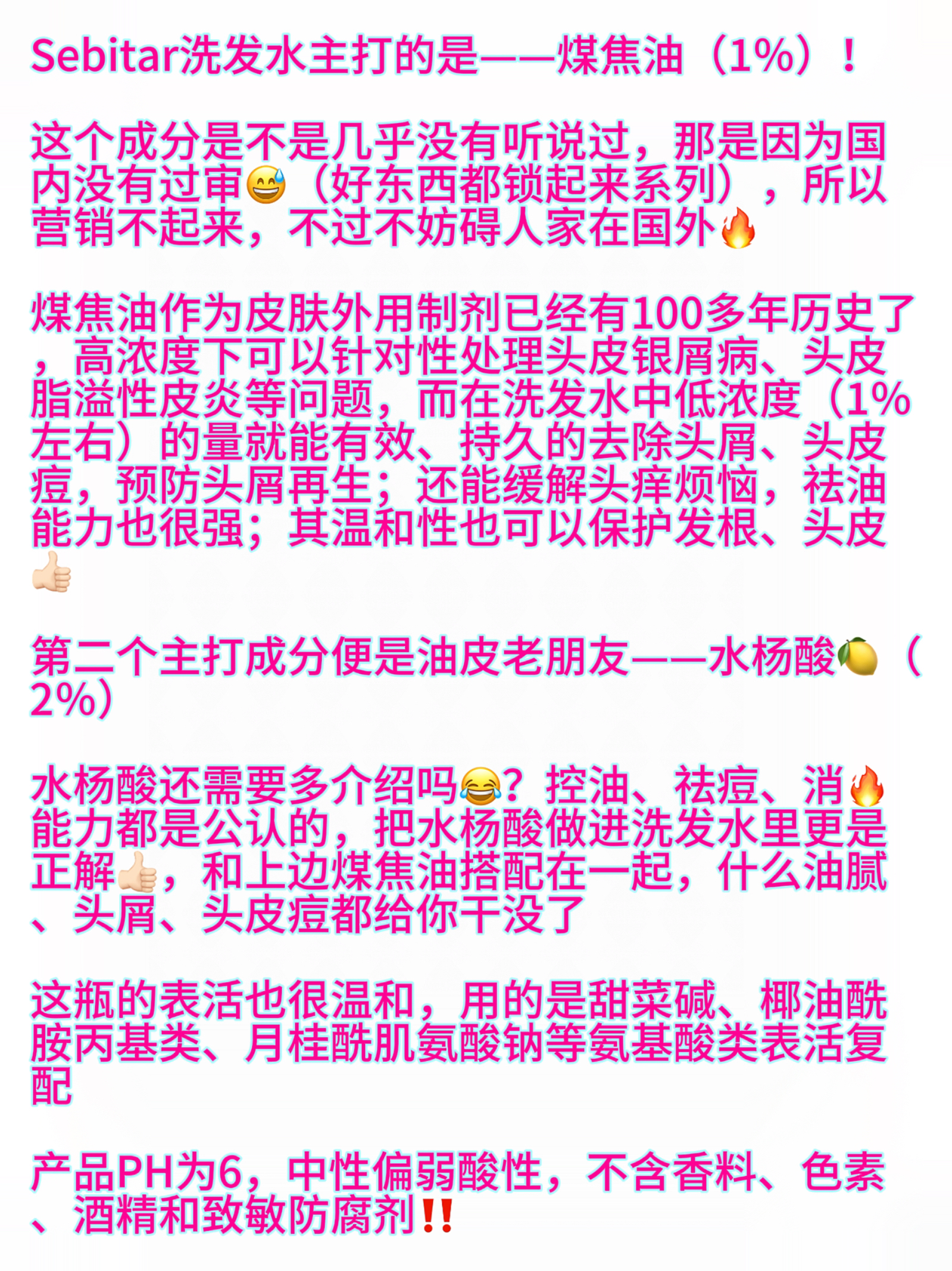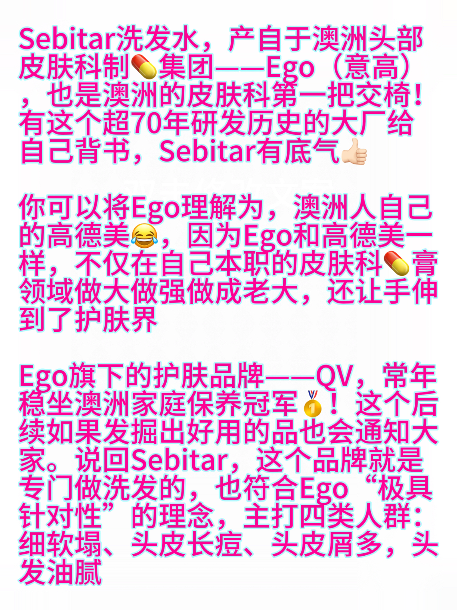 Sebitar洗发水,是由澳洲Ego(意高)大厂出品的(这个厂子会在图里介绍)!Sebitar主打煤焦油和水杨🍋,这个可以说是目前针对头皮问题蕞快准狠的洗发水了。一共有两个规格,250ml和500ml的 . 简单总结,这瓶就是细软塌人群,或者有头皮屑、头皮痘、头发油腻等问题人群的掌上明珠! . ♥️图二:产品背面图,成分表 . ♥️图三:对澳洲Ego(意高)大厂的介绍,以及对Sebitar品牌的介...