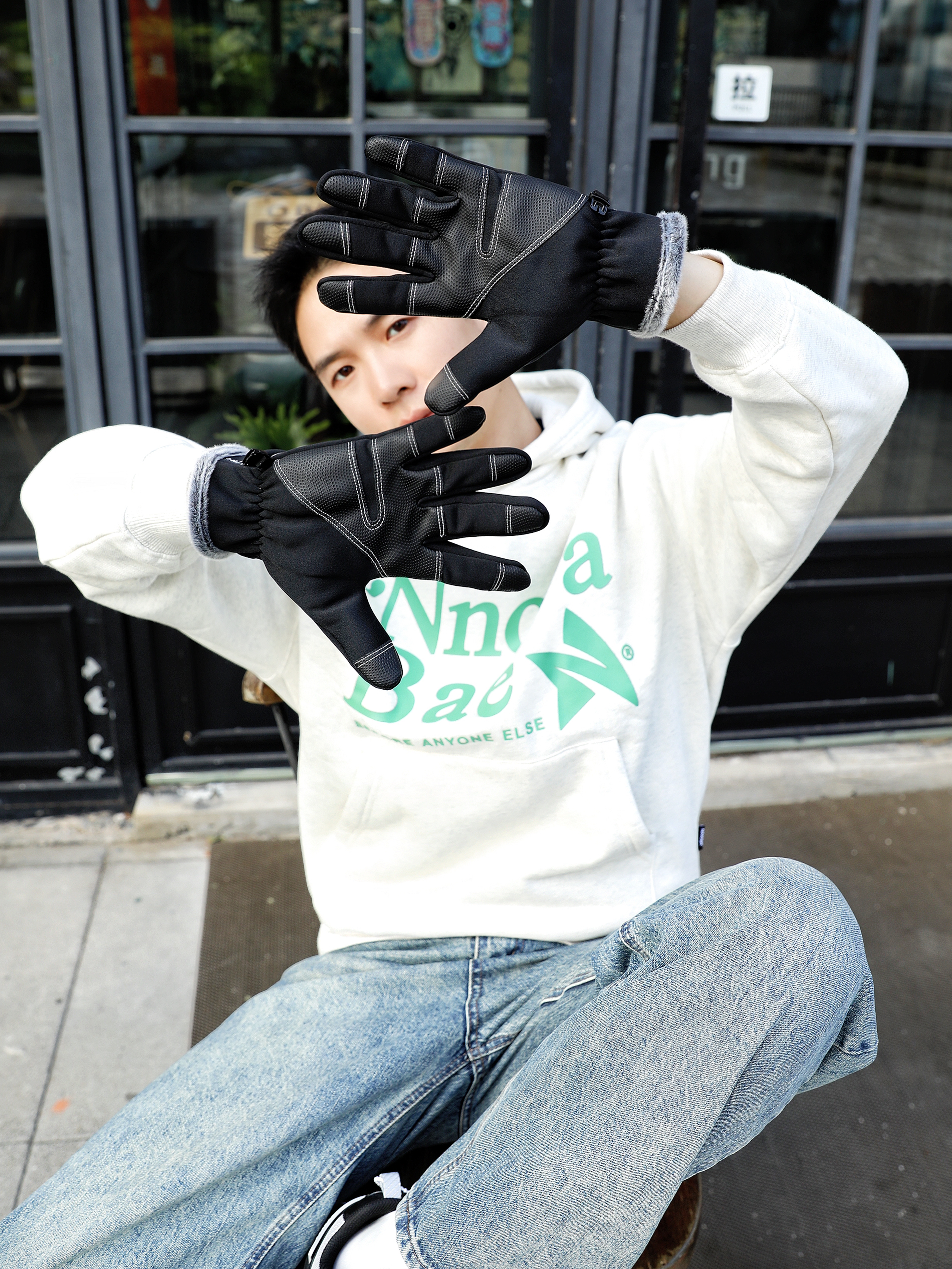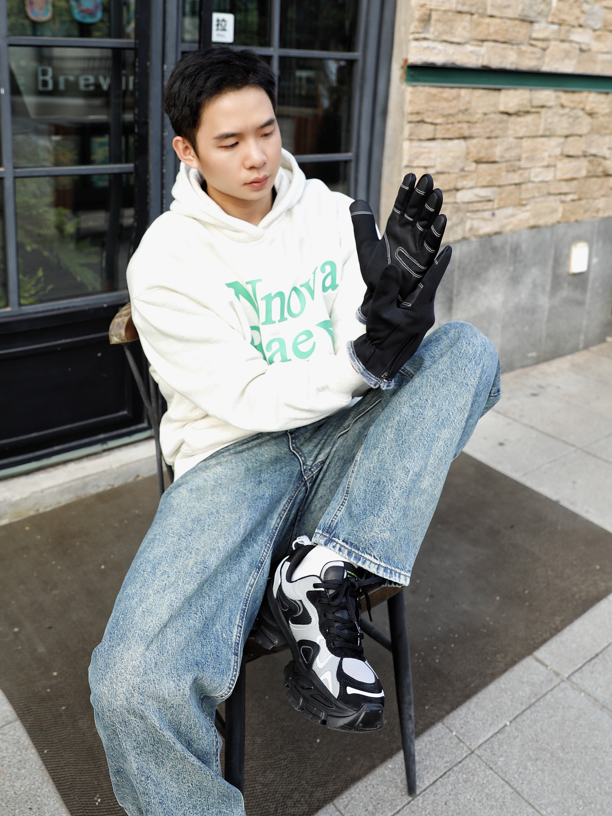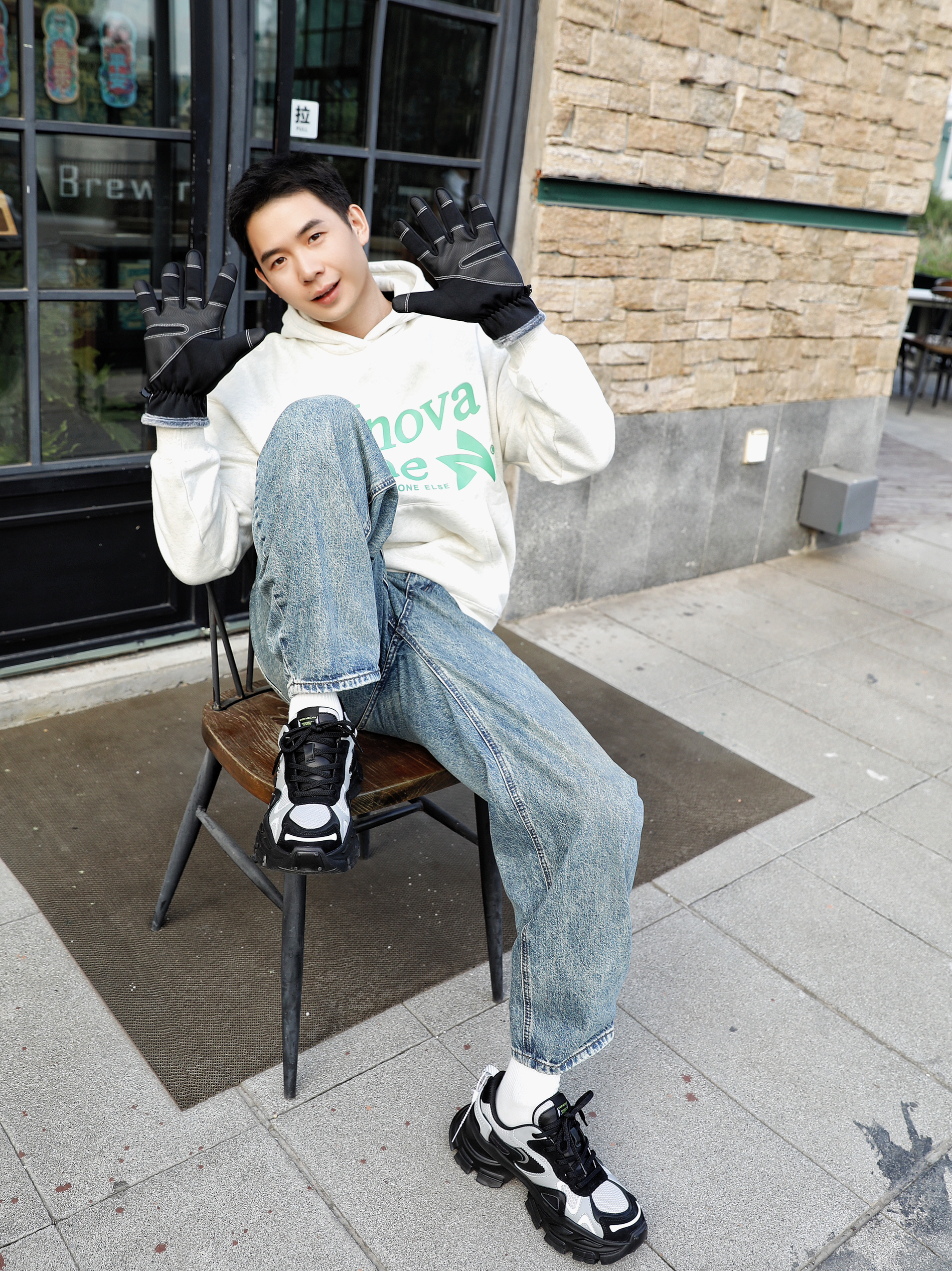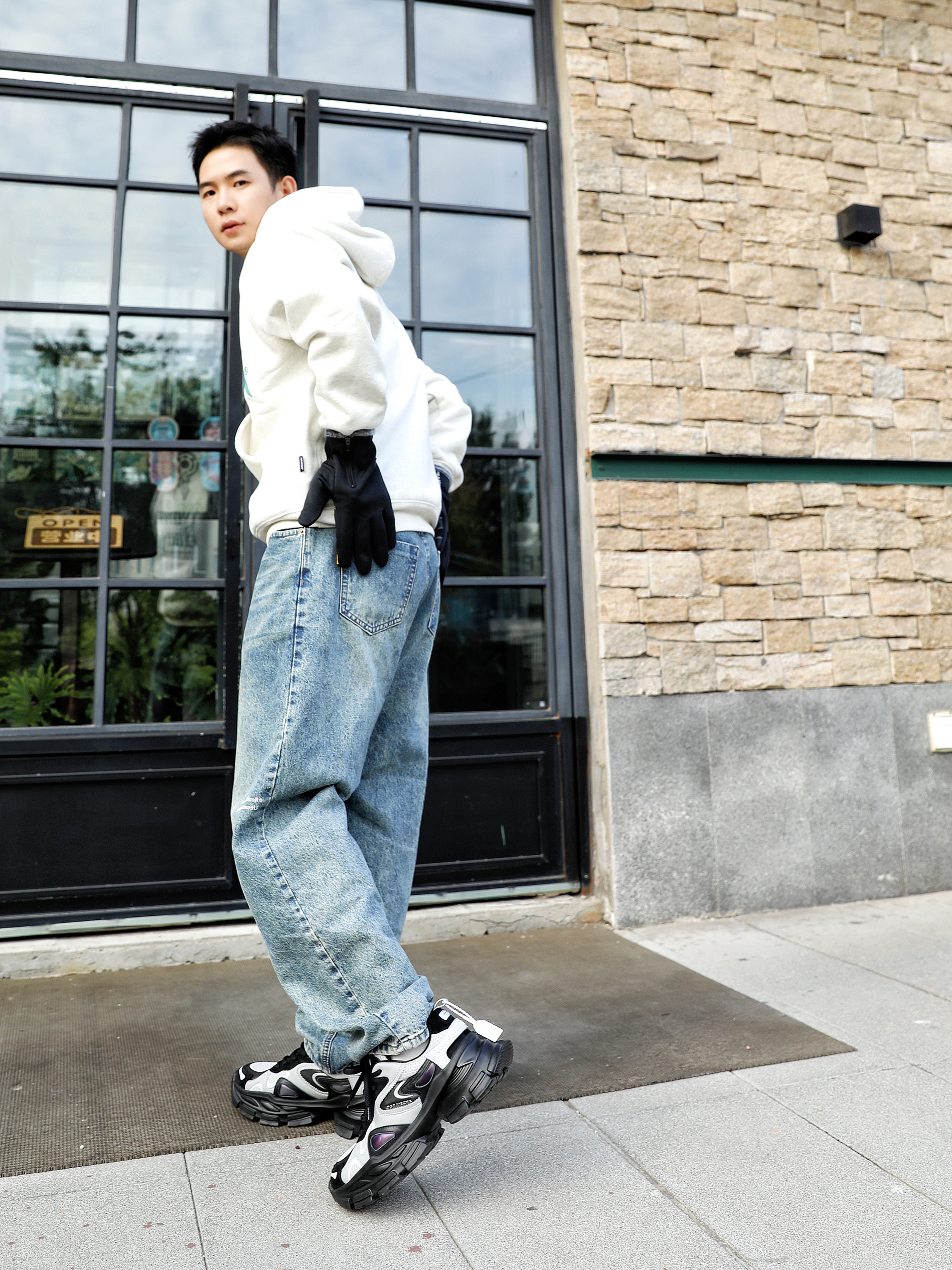 秋天到了,必须把手套给戴起来,今天这身穿的上衣是一件灰色的卫衣下身是一条浅色水洗牛仔裤,搭配一沙鸥及R的厚底老爹鞋整体的搭配就很时髦,而且还有一点点酷酷的感觉 秋天穿这一身准准没有错朋友们赶紧get起来