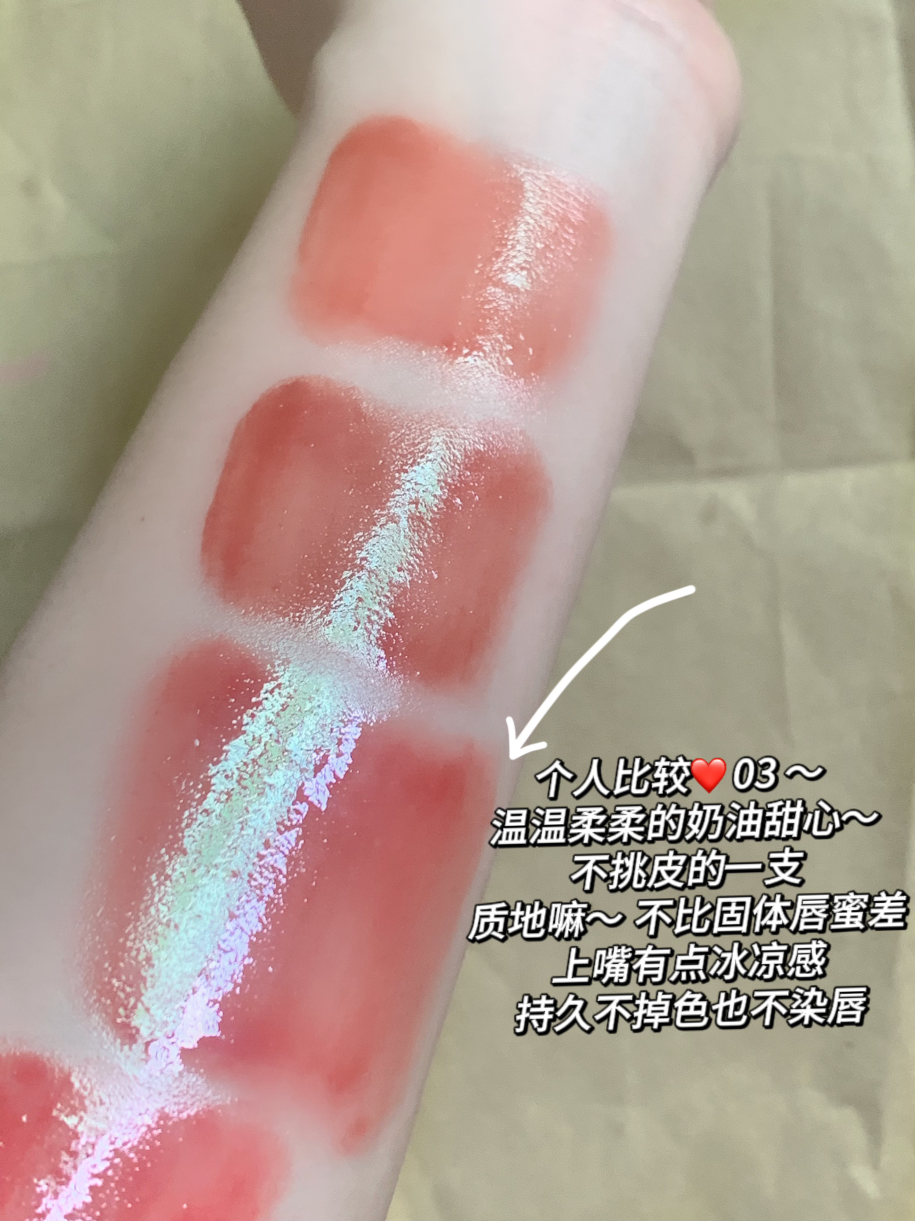 到手了很久终于有空Po一下了 五支比较热门的色号 会成膜的固体唇釉 相比起其他固体唇釉而言 质地更好 不会黏糊糊的拉丝 上嘴的感觉是冰冰凉凉的 膜感喝水也会在 比较持久 不染唇这点我很喜欢 但是外壳没有其他系列精致 😭 推荐03 色号