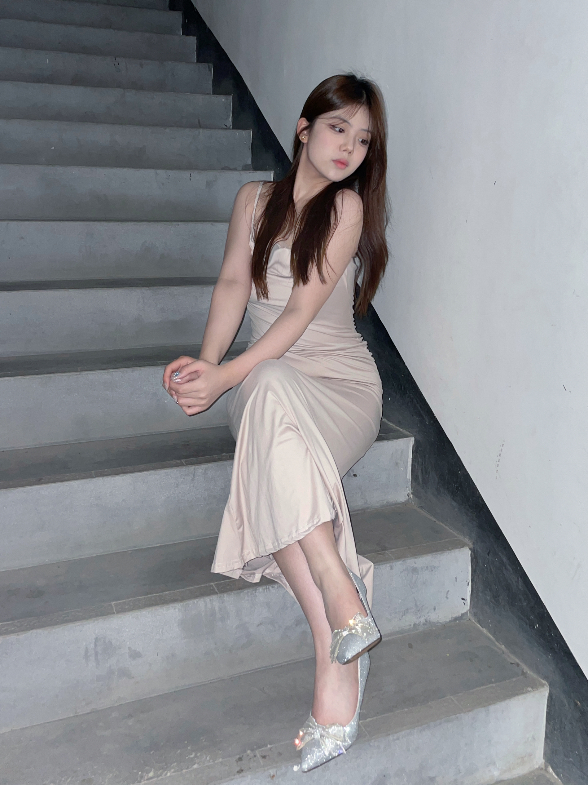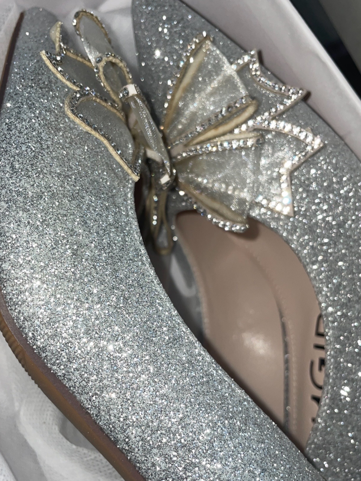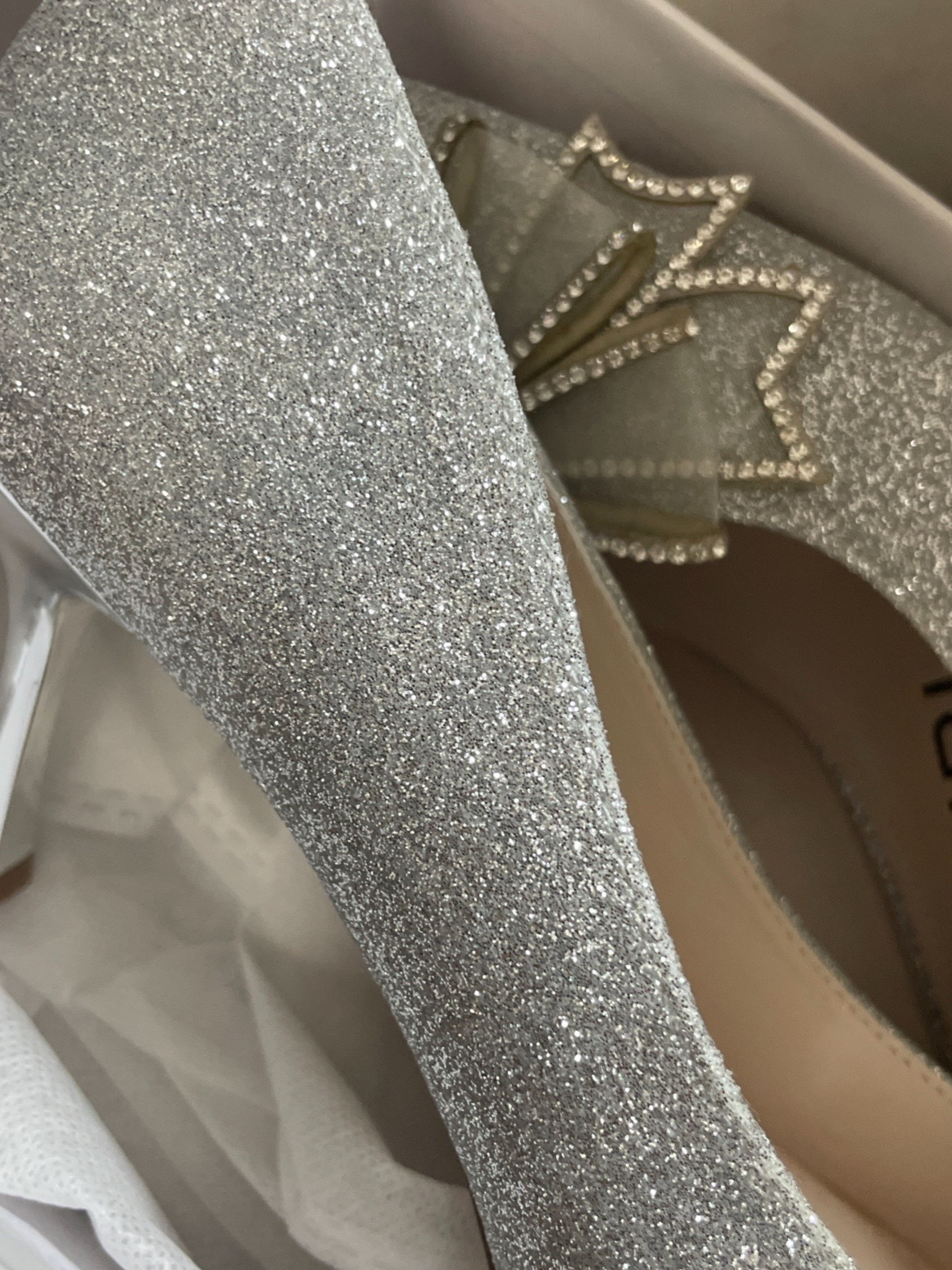 选择的是honeyGIRL的银色感觉比较百搭到手好好看也很闪是细跟高跟鞋我之前从来没有穿过高跟靴但是这个上脚真的很舒服而且鞋跟高度也刚刚好对于宽脚也友好因为我就是一个宽脚上面的水钻也很闪很好看非常仙气前面还有一个大蝴蝶结鞋跟长7厘米尖头的也很修饰腿型